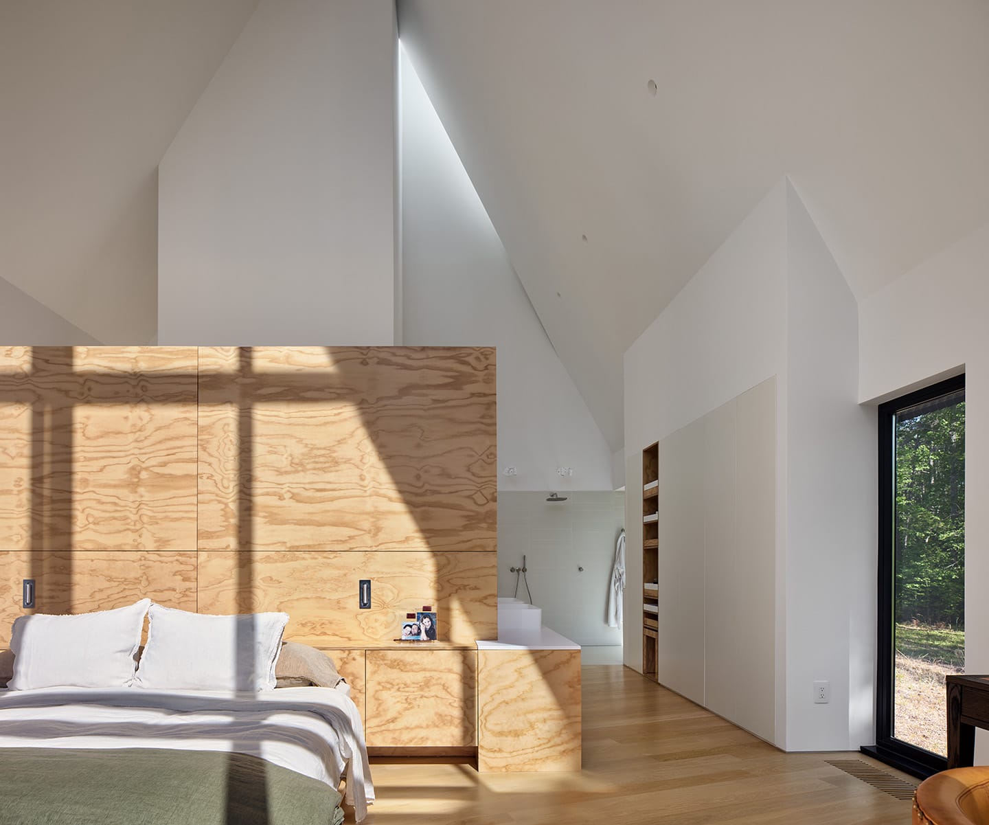 The simple double gable roofs rise to 9.4m with expanses of glass that allow nature to visually connect to the interior space and help forge a deeper, more meaningful understanding of the relationship between the natural and built environments.