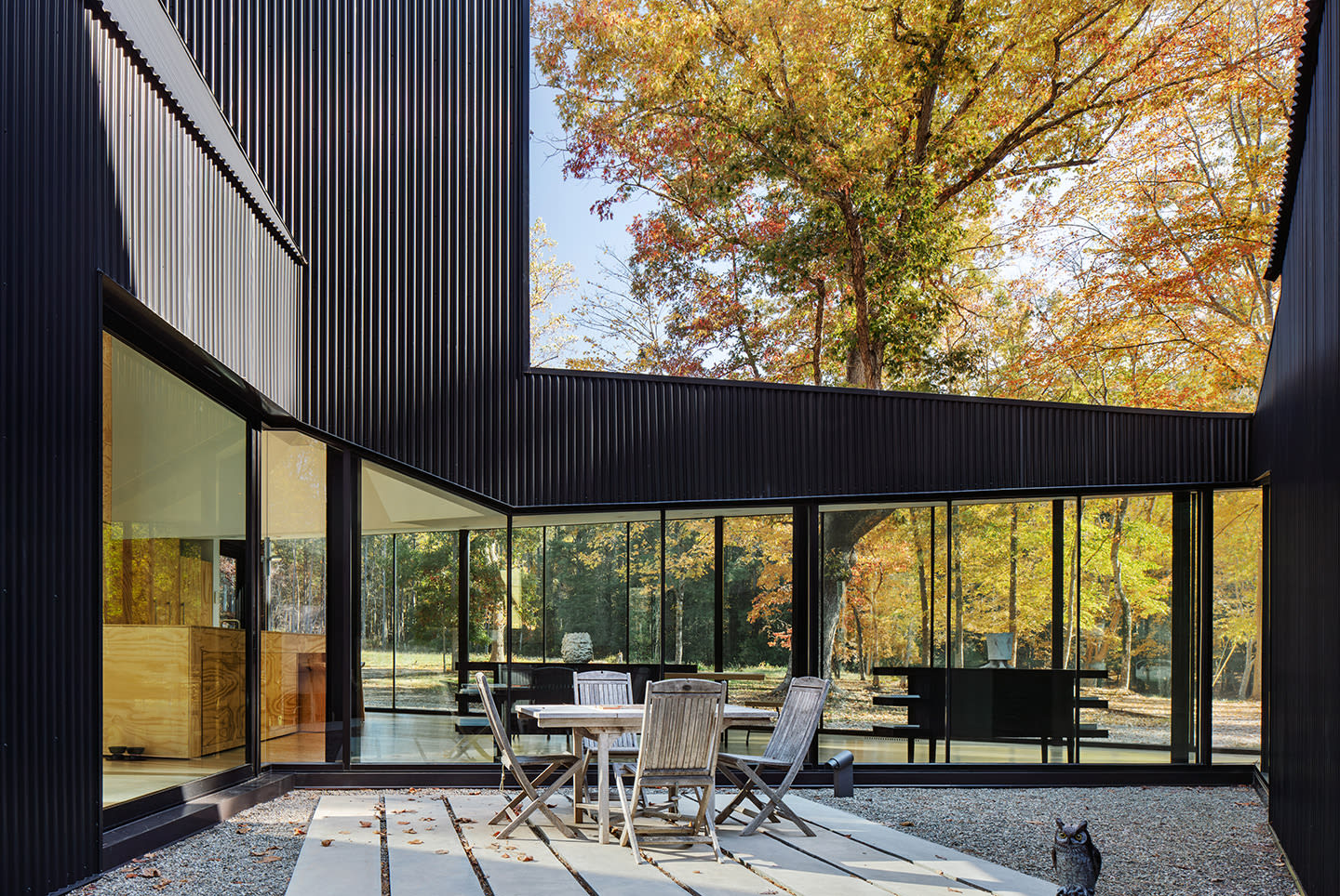 The structure’s reflective glass and black metal exterior gives the building an ever-changing presence during the seasons; receding into the forest‘s dappled light in the summer and winter stalk-like tree structures; and standing out like a beacon with the occasional winter snow, while the natural plywood interior creates a protected and warm gathering place – while preserving the spectacular view into the forest.