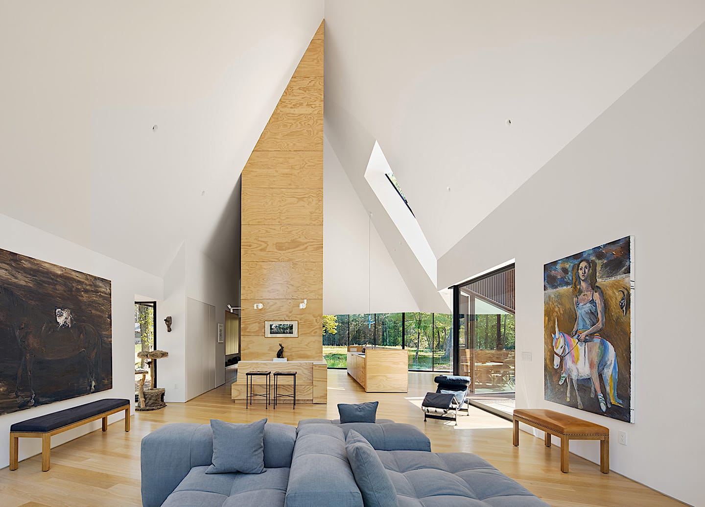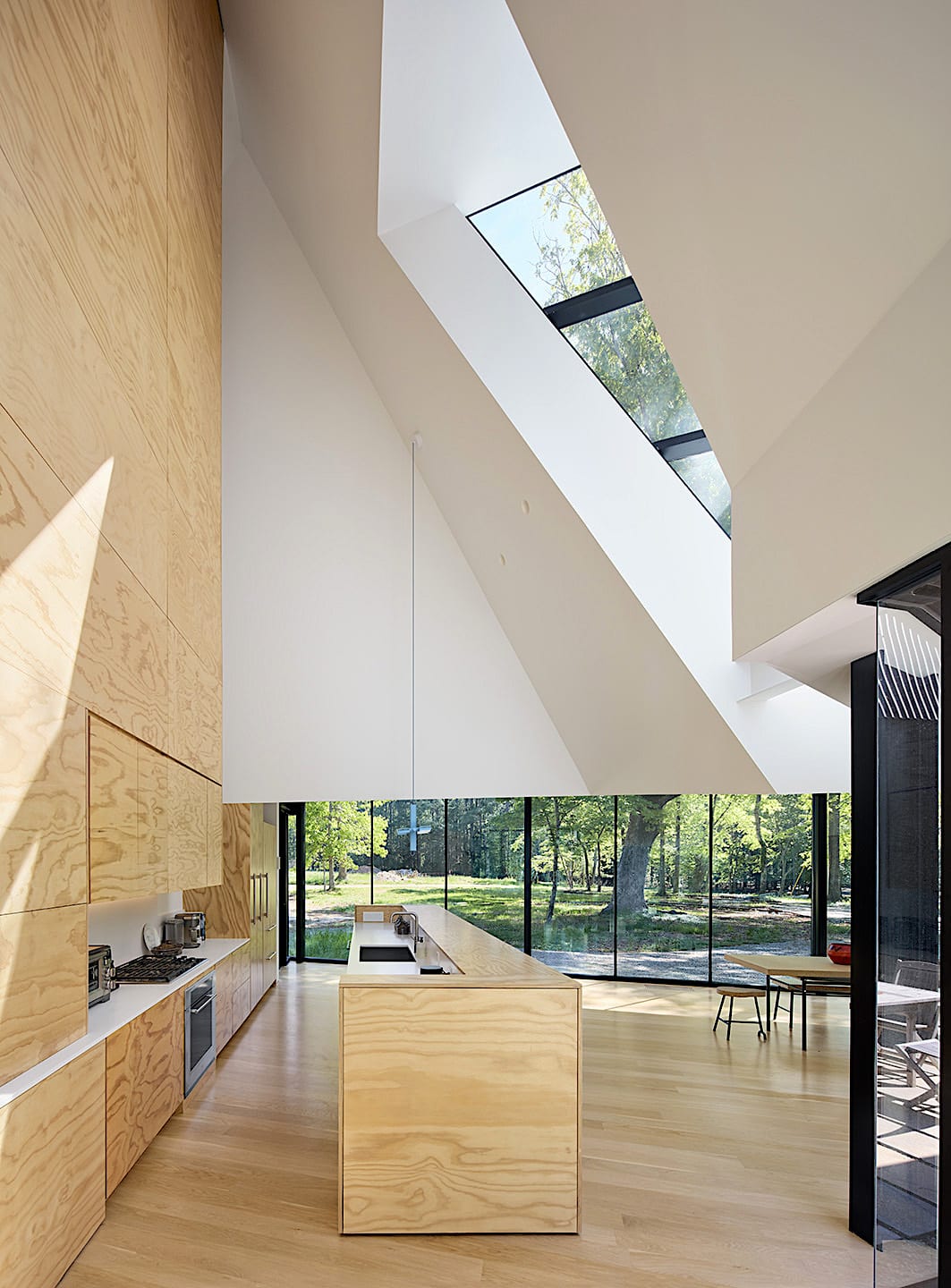 The kitchen/dining area connects the two sides of the house with a transparent lower scaled gallery-like loggia with glass on both sides that feels like a walk in the forest when moving between the two volumes.