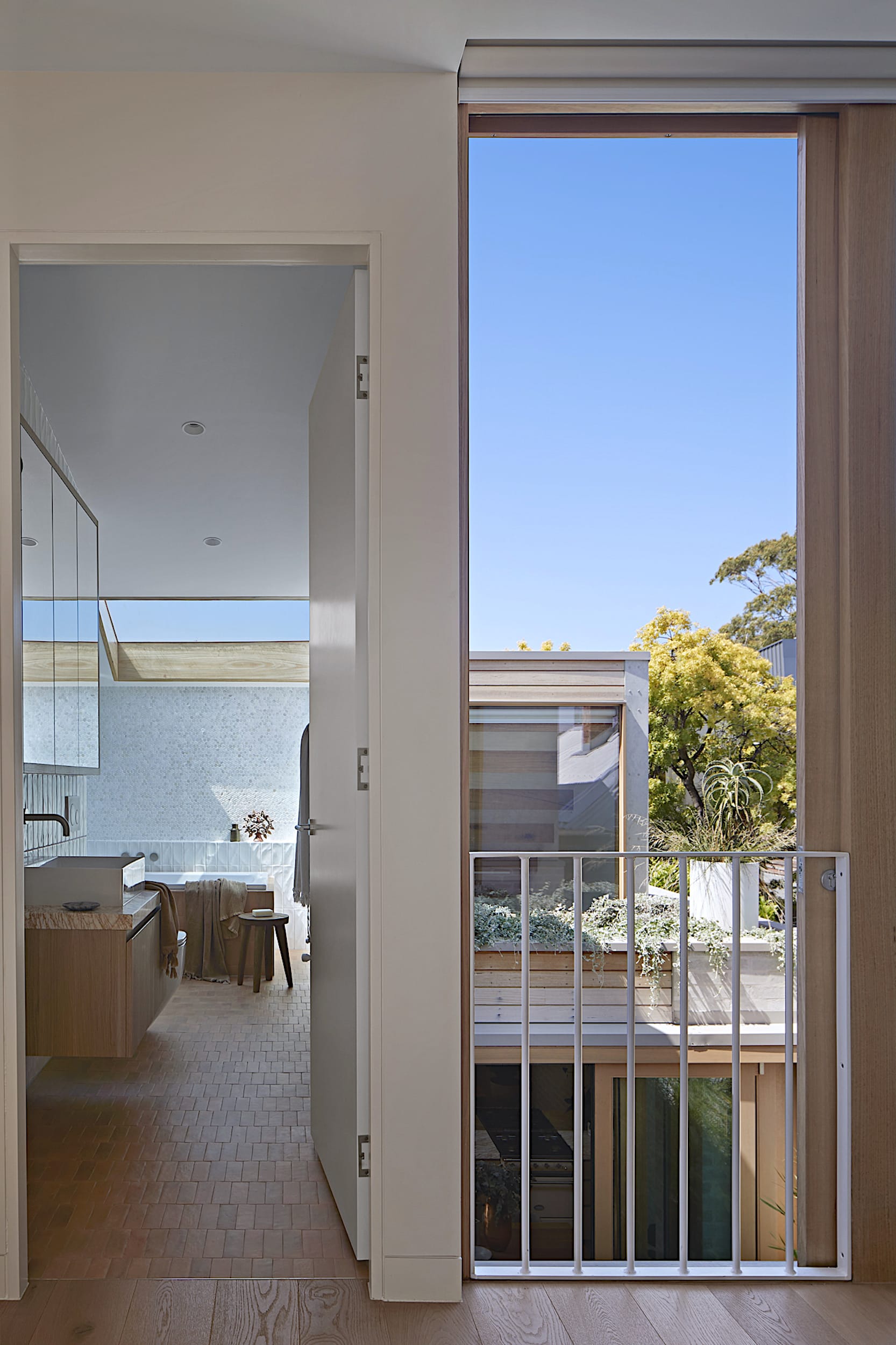 - To be informed by a poetic approach to the narrative of bathing – from transition from bedroom, to arrival at the vanity, to a shower nook and generous built-in bath that enjoys an outlook to sky above and roof garden below via a double-hung sashless casement window.