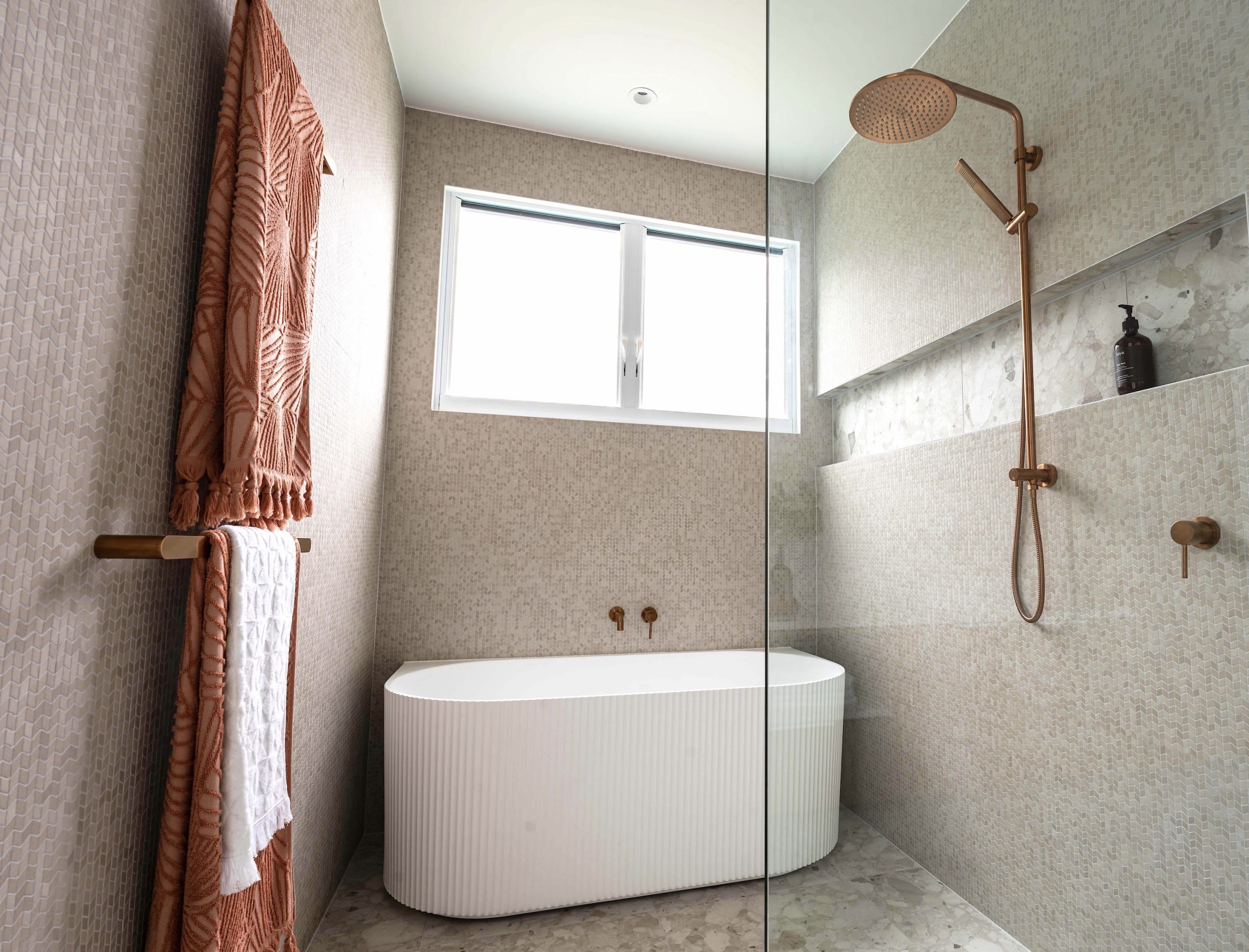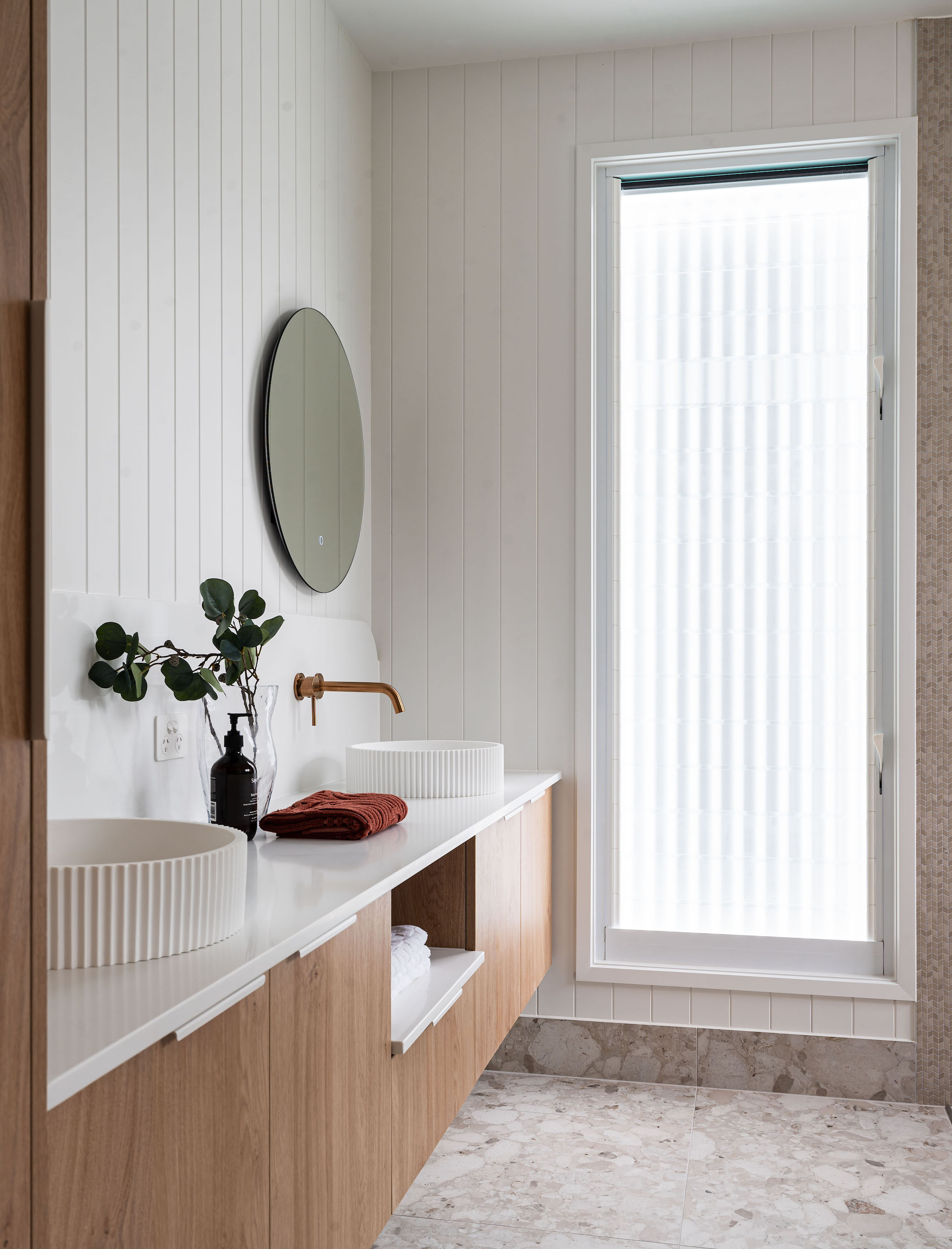 This ensuite in a newly built duplex is a perfect response to its coastal setting.