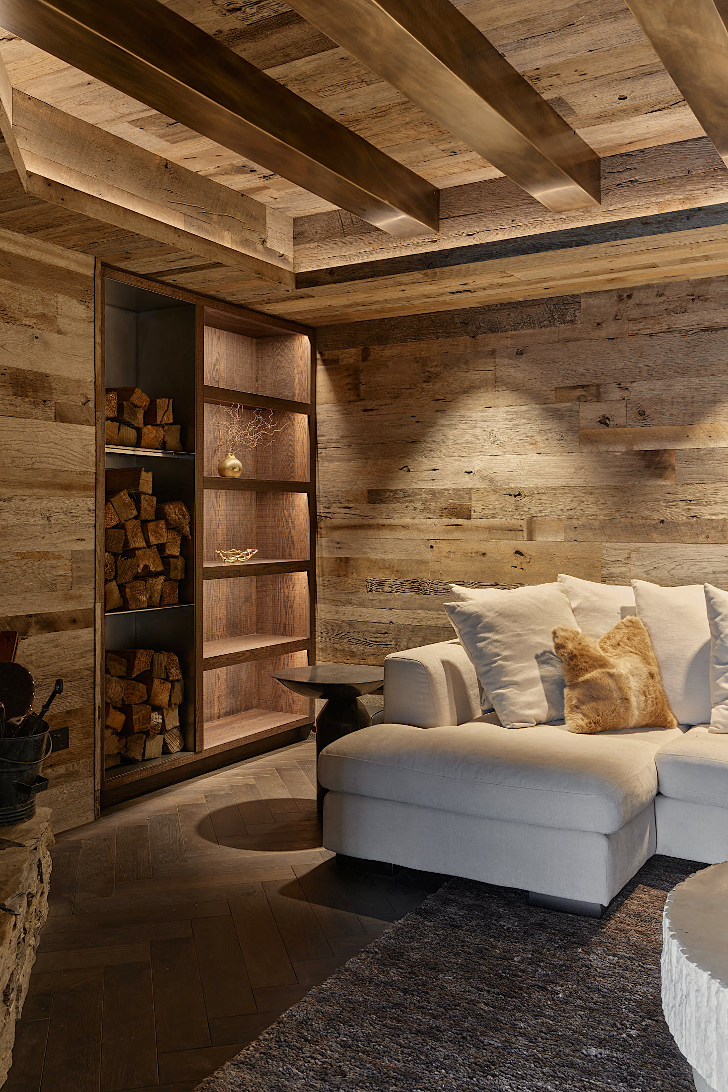 In the living room, we kept the existing fireplace and built in a custom steel wood stack to get the winter fires going.