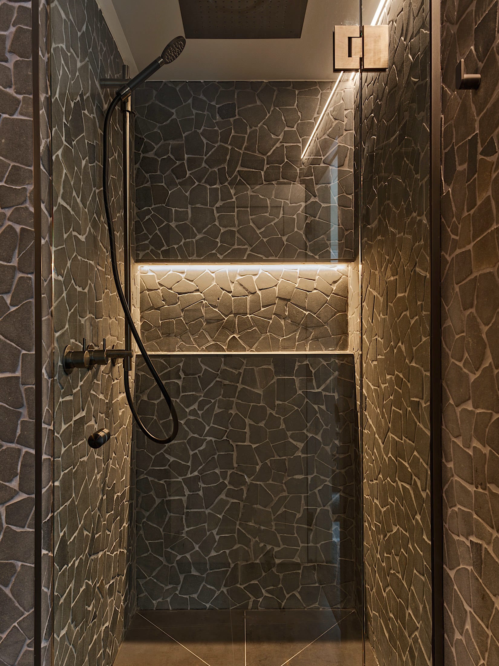 In the ensuite, the original bath was removed, allowing us to add a monsoon head in the walk-in shower, due to the low ceiling heights.