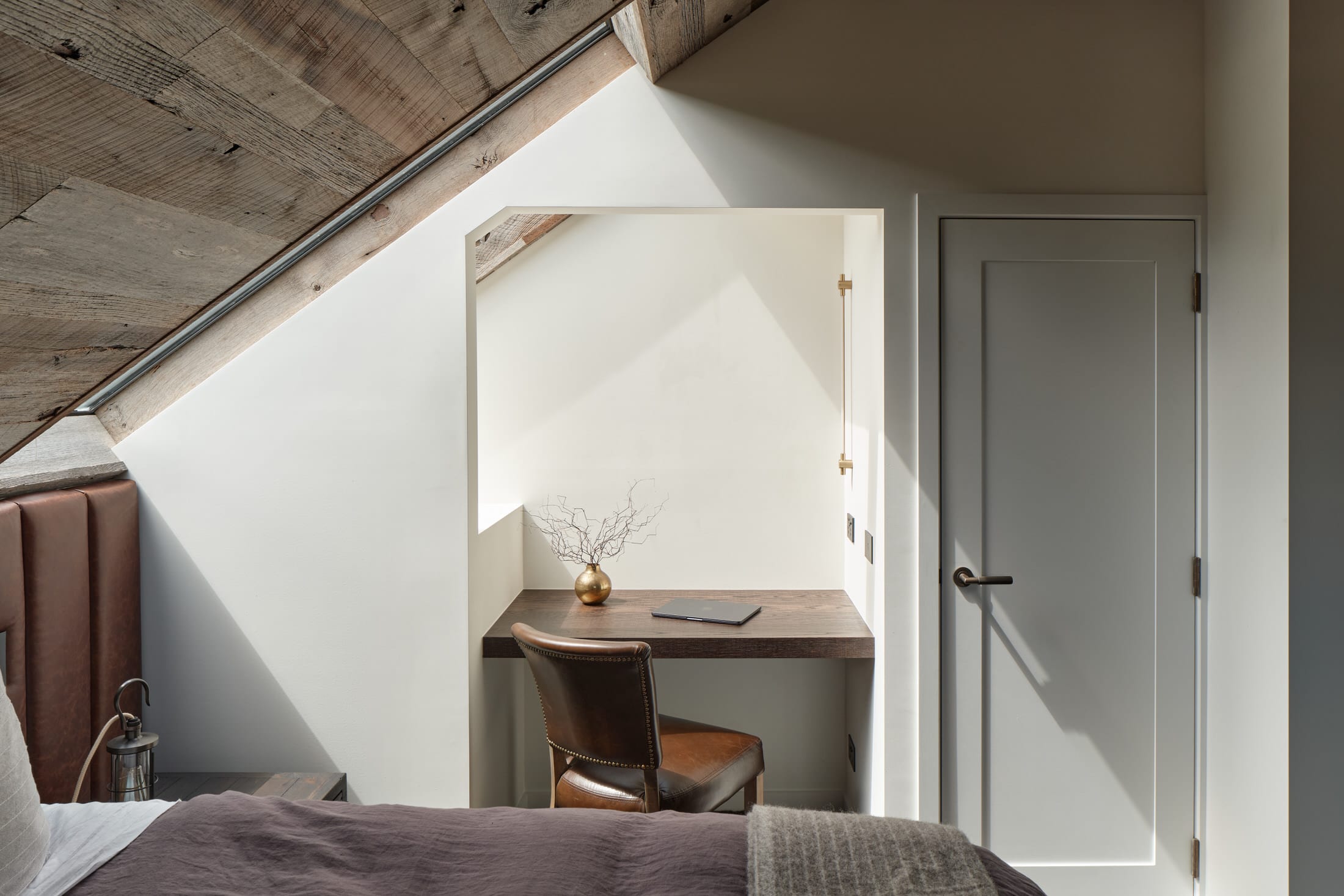 Upstairs in the master, we created a full-length headboard using stunning Tasman Leather and introduced a work nook.