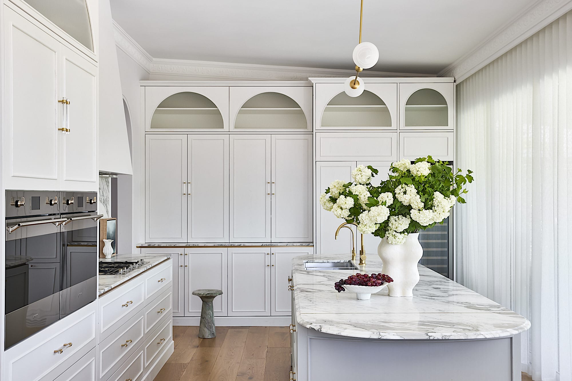 Tasmanian oak veneer joinery, offset with shaker cabinet doors, complements this kitchen's feature Aquila marble surfaces – finishes flow through to the well-appointed butler's pantry behind