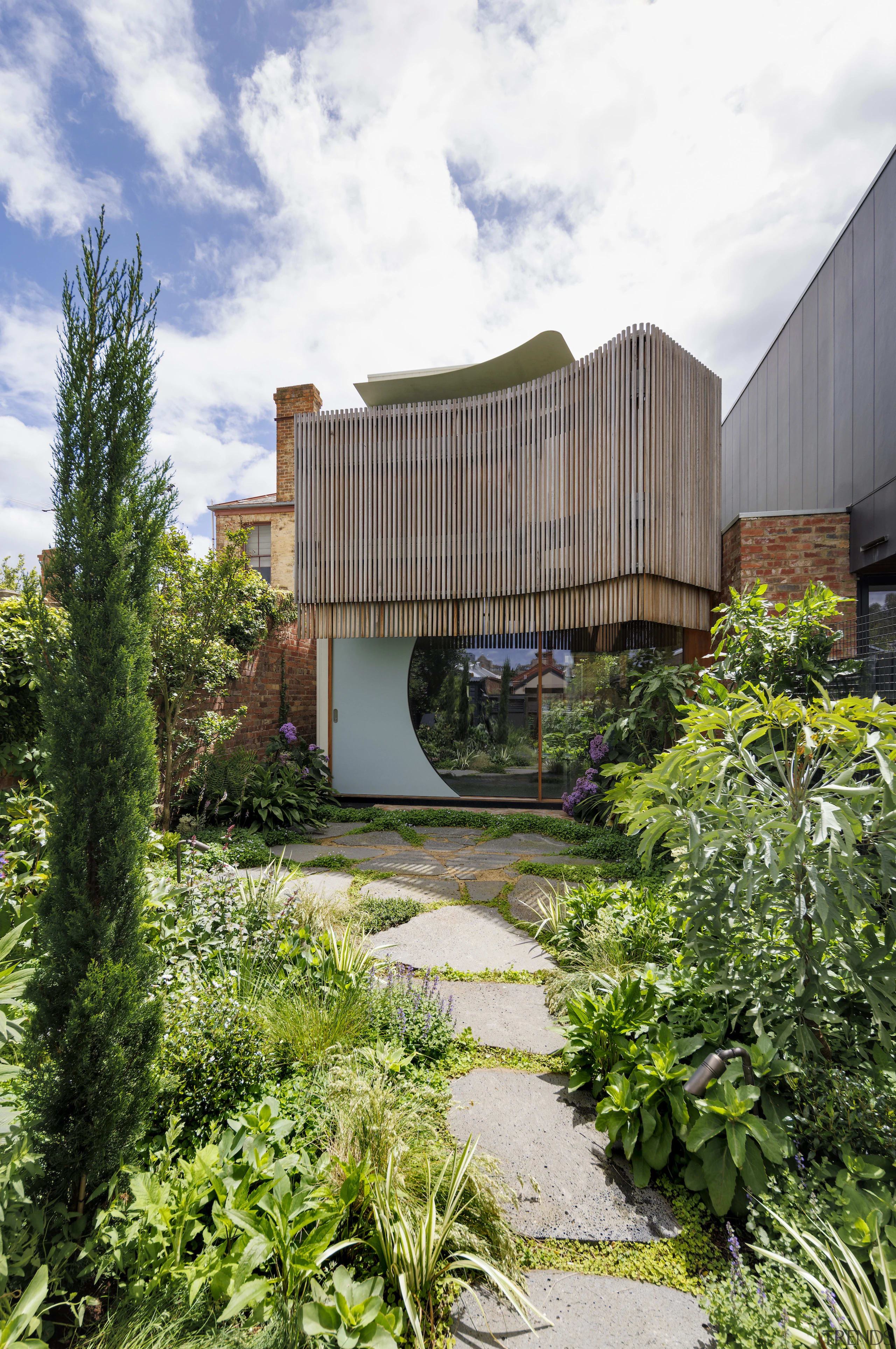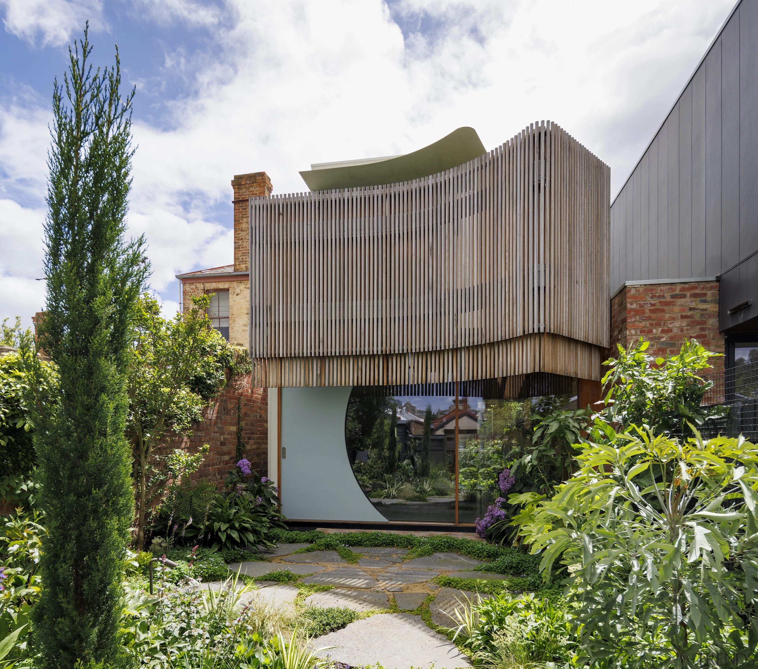 From the rear elevation, a floating veil of timber battens shrouds the upper level, its sweeping and tiered form referencing the detail of Edinburgh Gardens’ historic rotunda and the home’s decorative character.