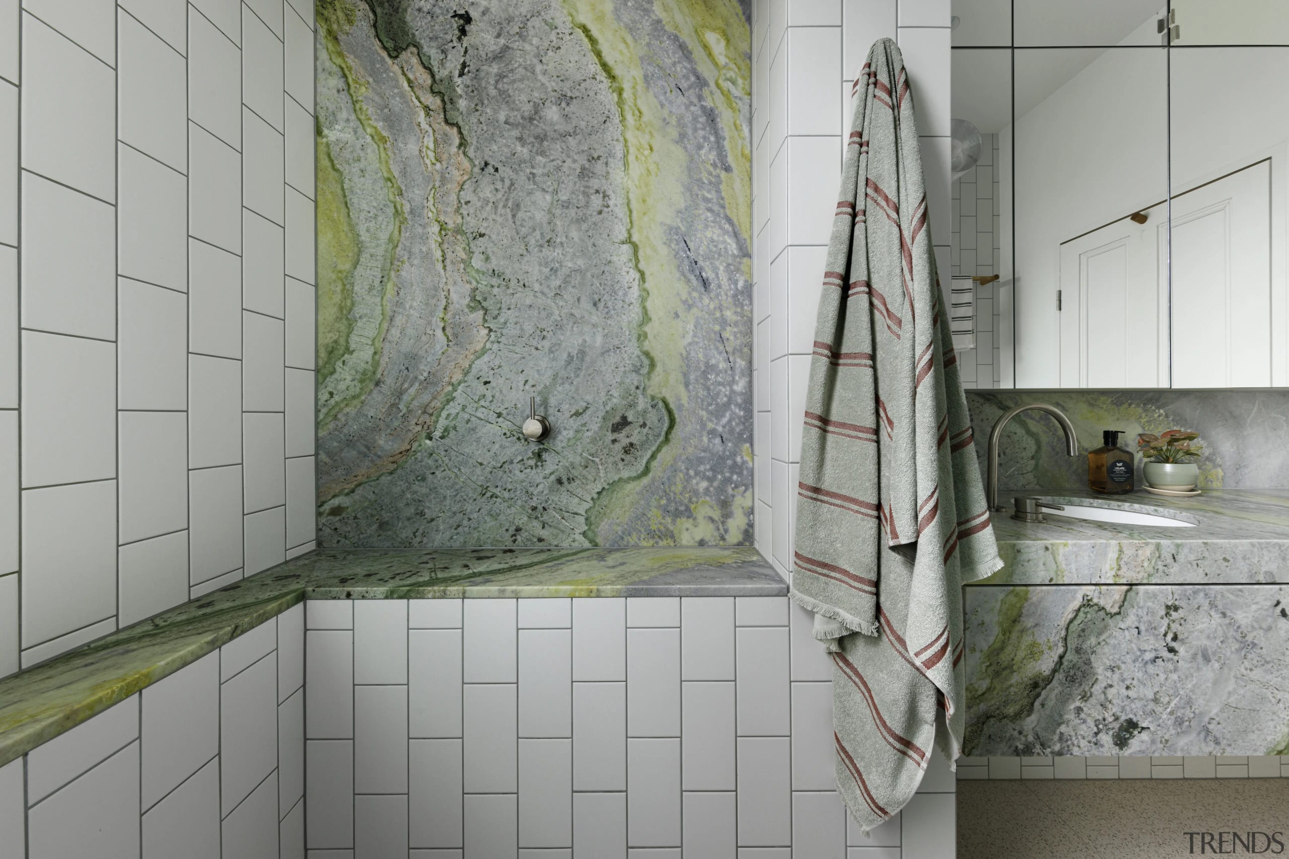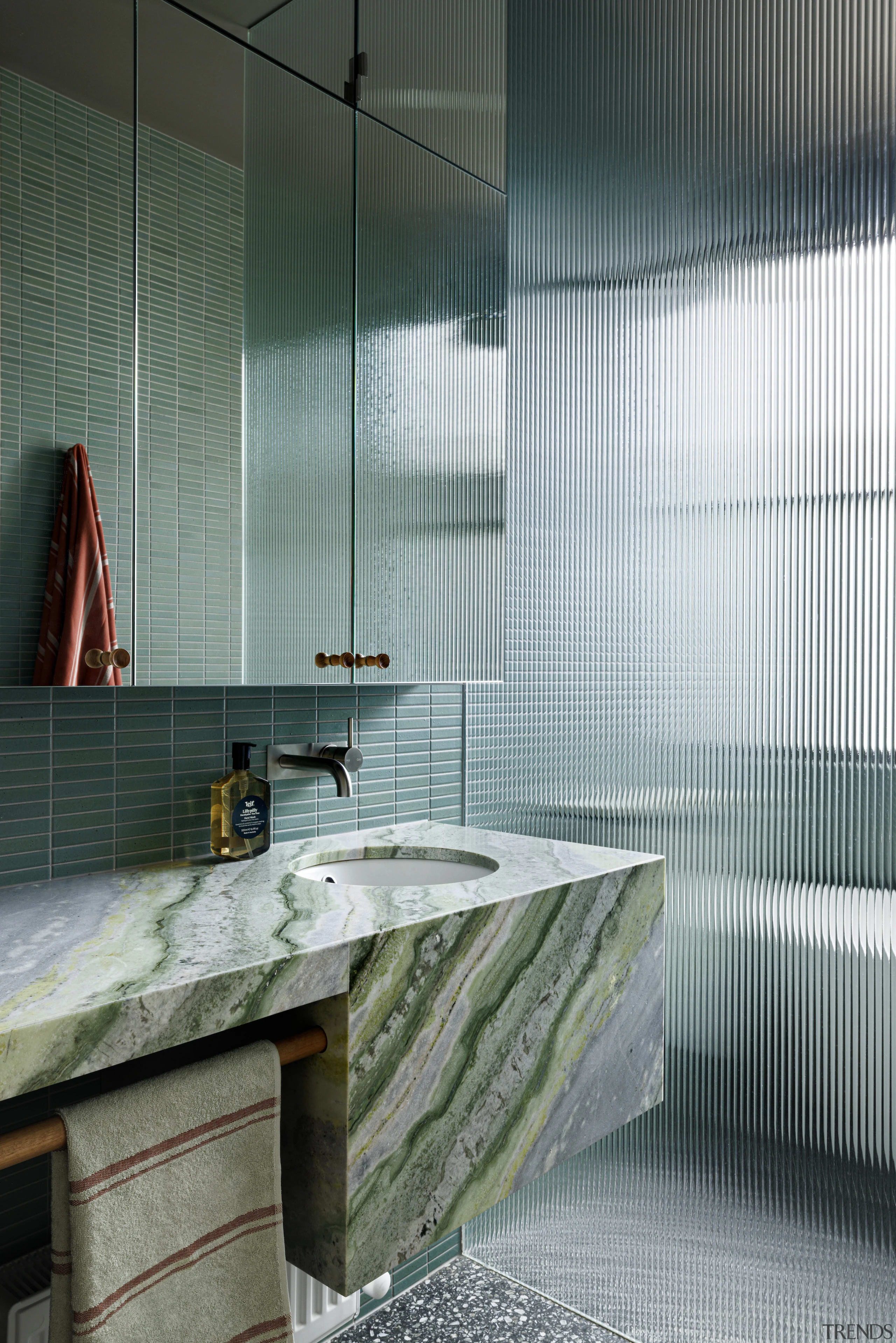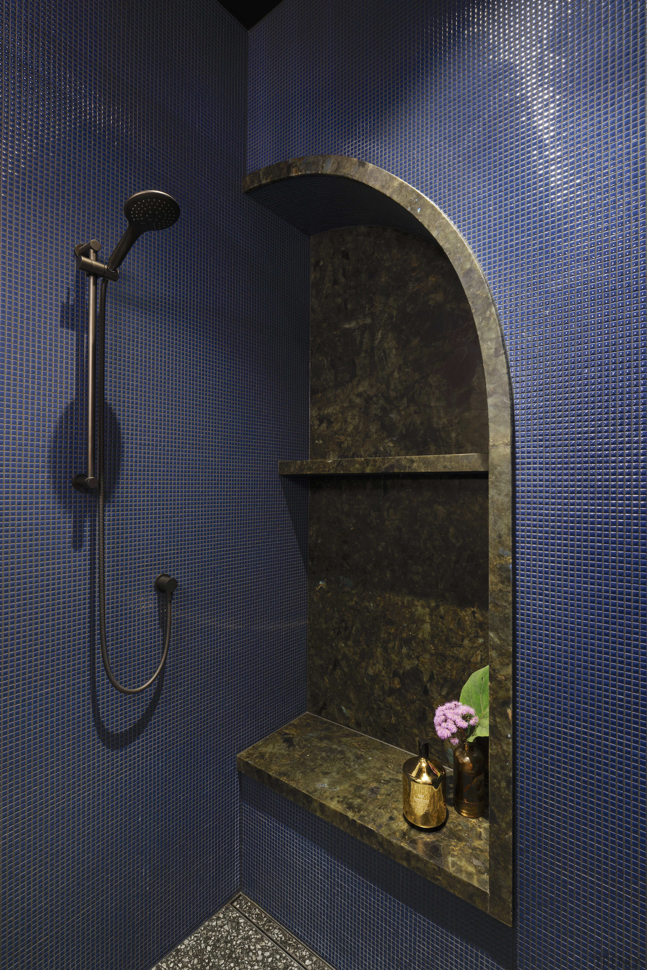 A second bedroom is converted to a shared bathroom, which is awash with curved forms, inky blue tiling, speckled terrazzo, luminous granite, and reeded glass.