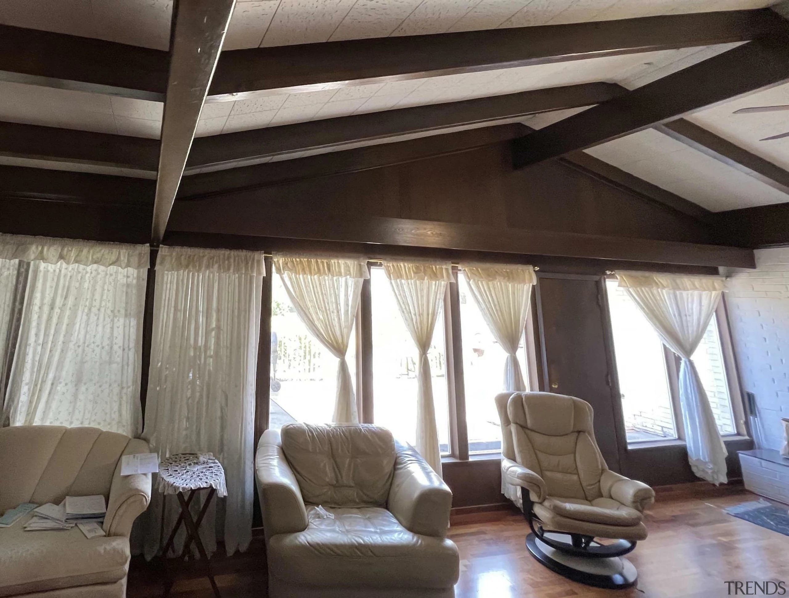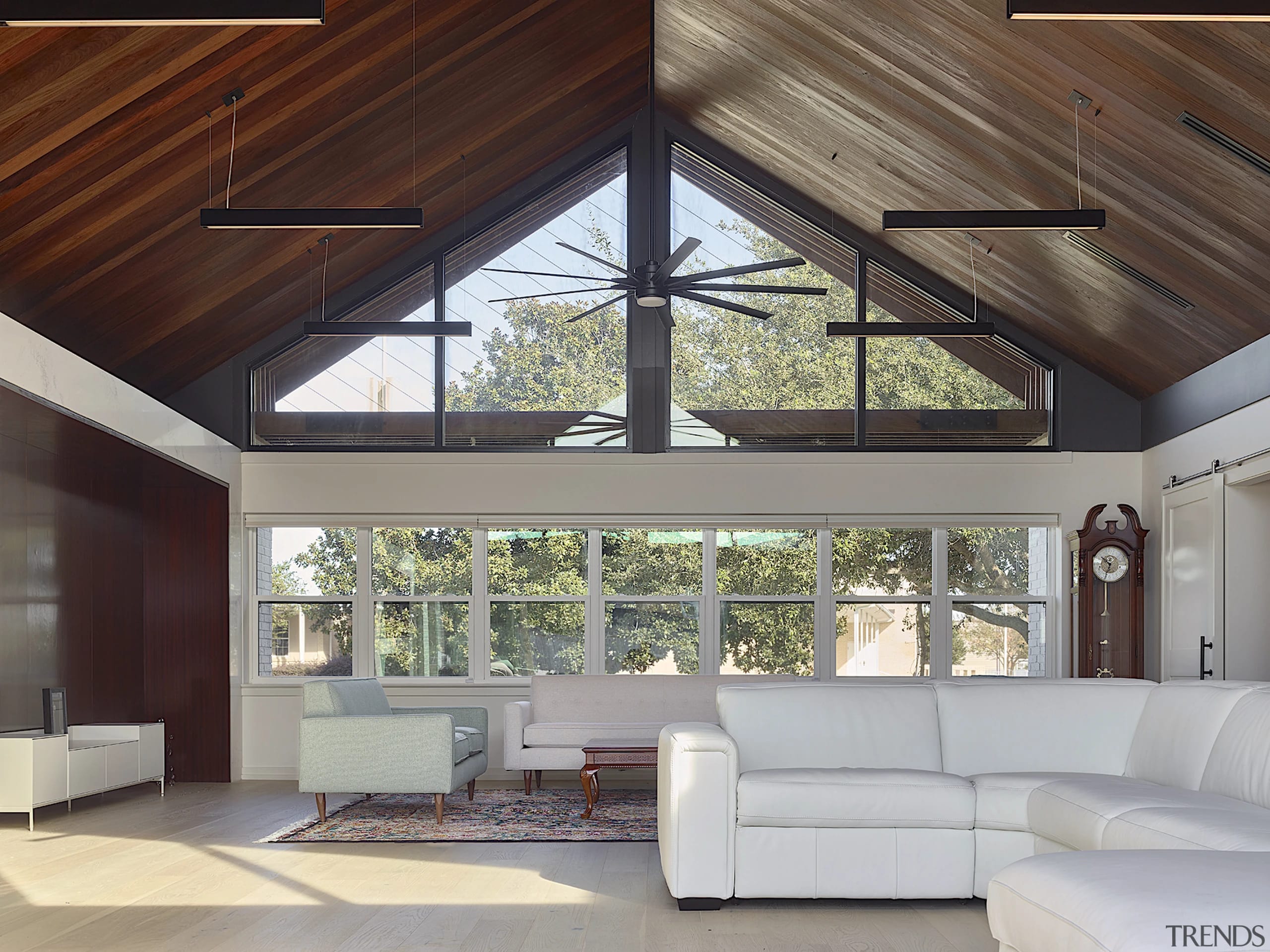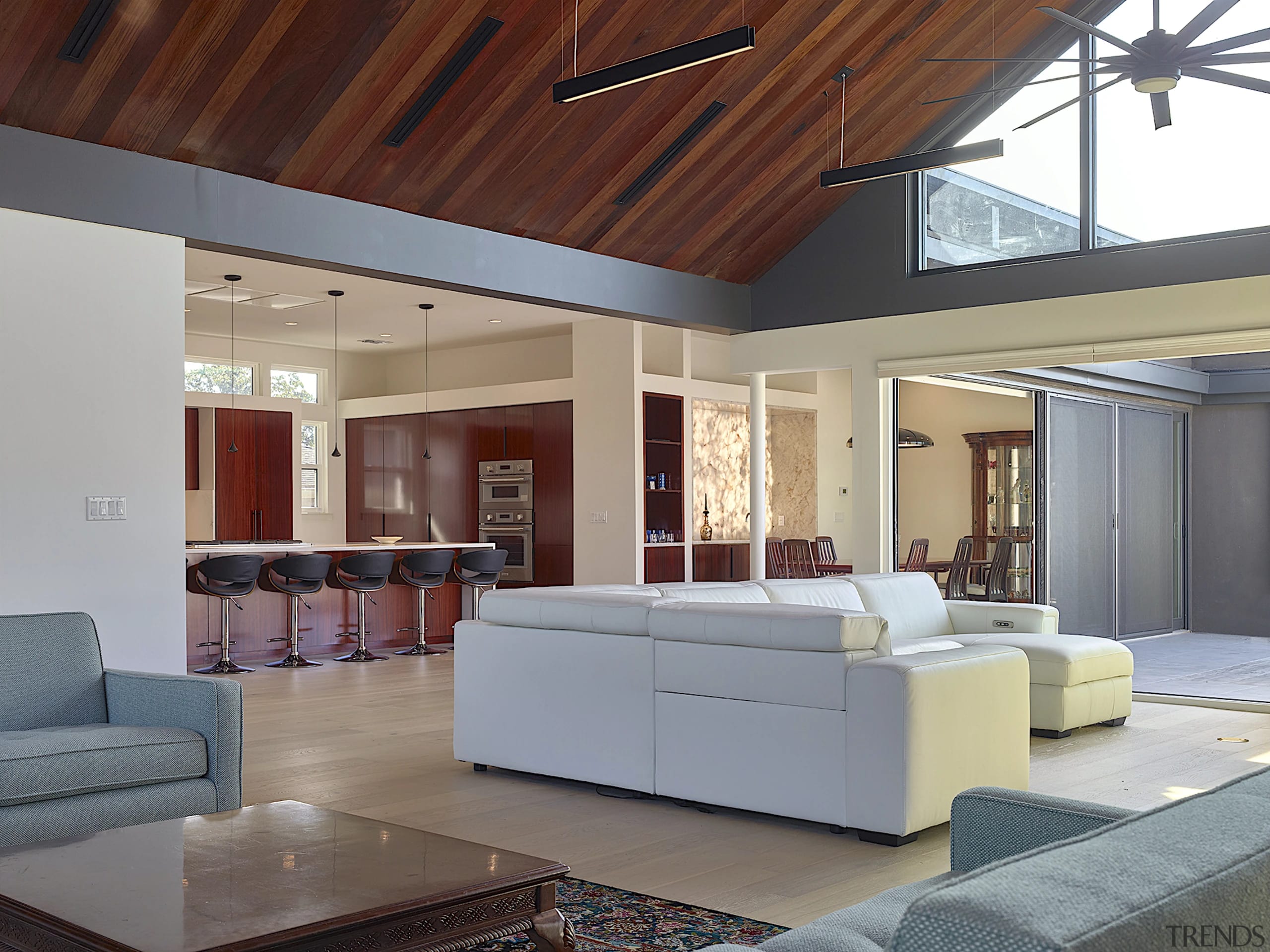 As for the interior floor-plan modifications, the existing vaulted space in the rear-facing living room was increased in height and expanded to the front room, the latter previously occupied by a large formal dining room.