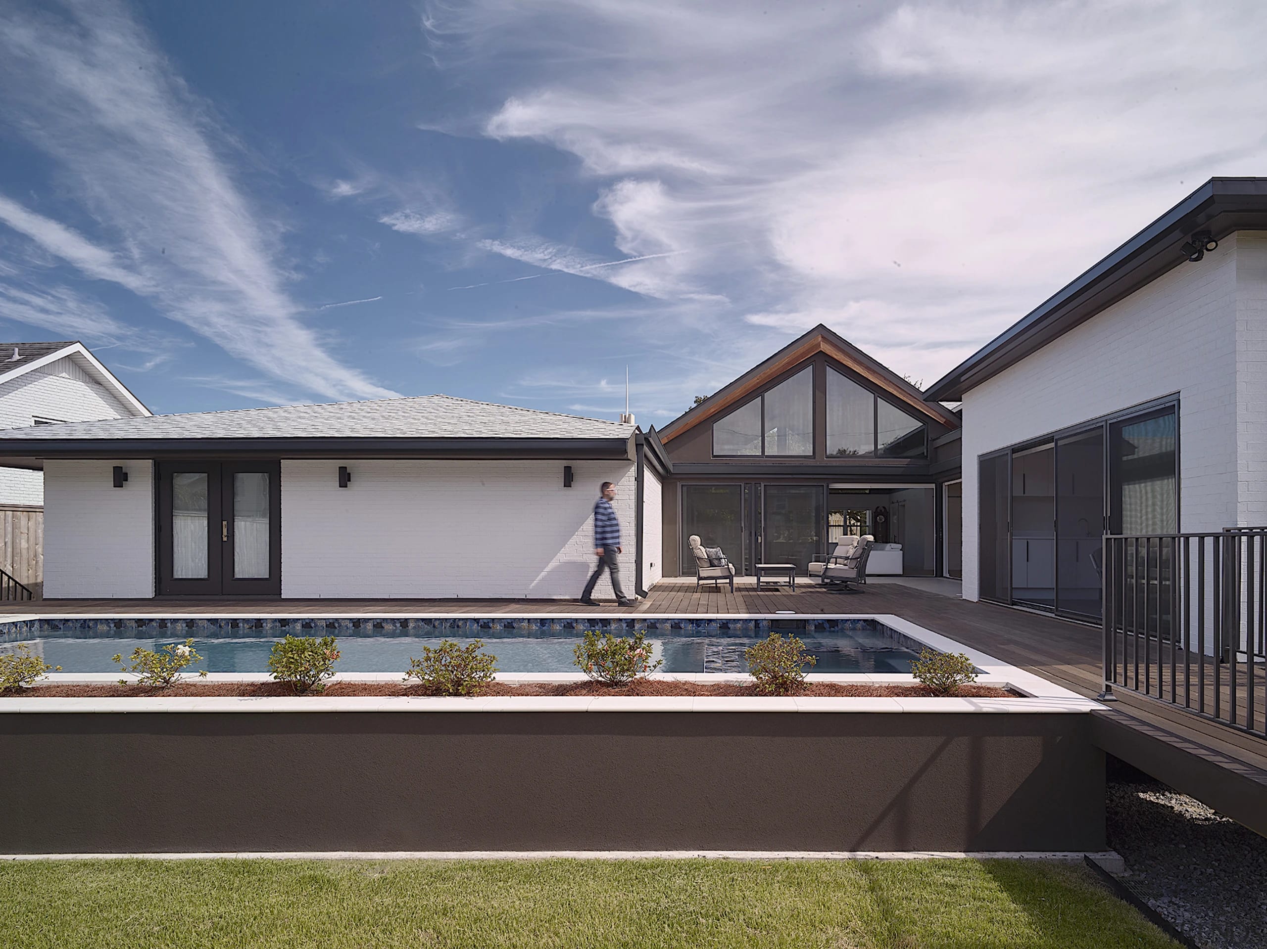 To increase the connection to the outside panorama even further, a two-sided multi-sliding glass wall adds openness to the rear yard where a raised pool has been constructed at the same level as the (.91m high) main floor.