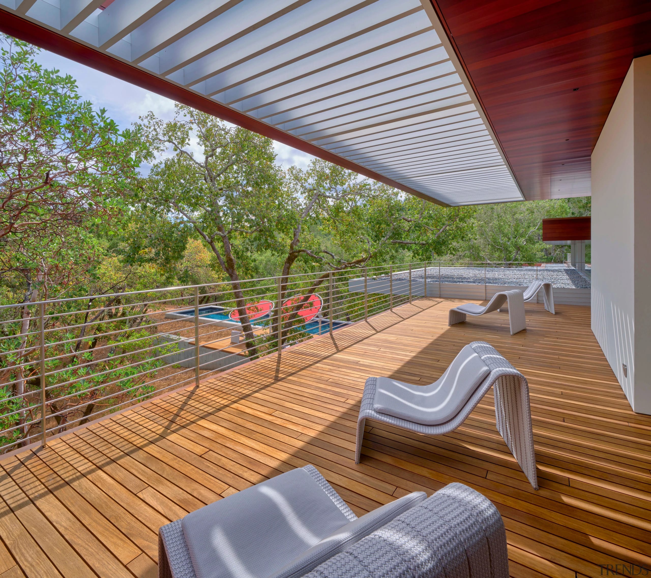 Shaded terraces directly engage the land, while an existing oak is left to pass through a roof opening in a pointed declaration of the continuity of building and ecosystem.