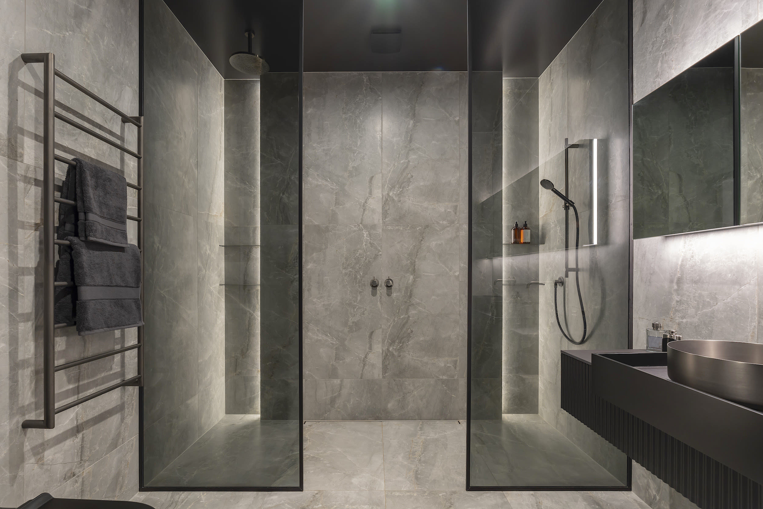 Basin/taps/shower fittings/bidetProgetto Plumbline | Wall/floor tilesCharme Grey, from Tile Depot |