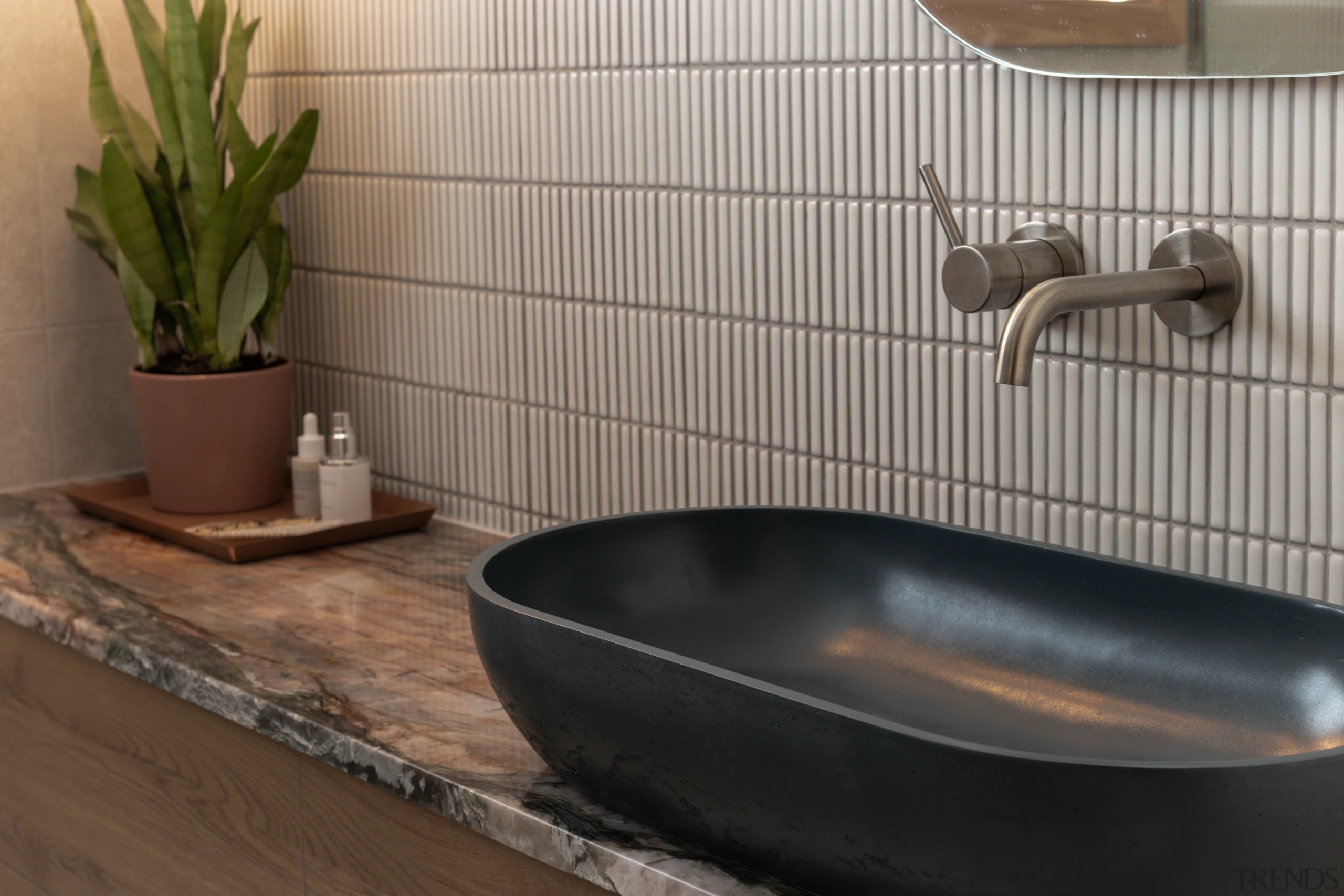We used a single concrete vessel basin in a deep navy to complement the smokey tones of the quartz.