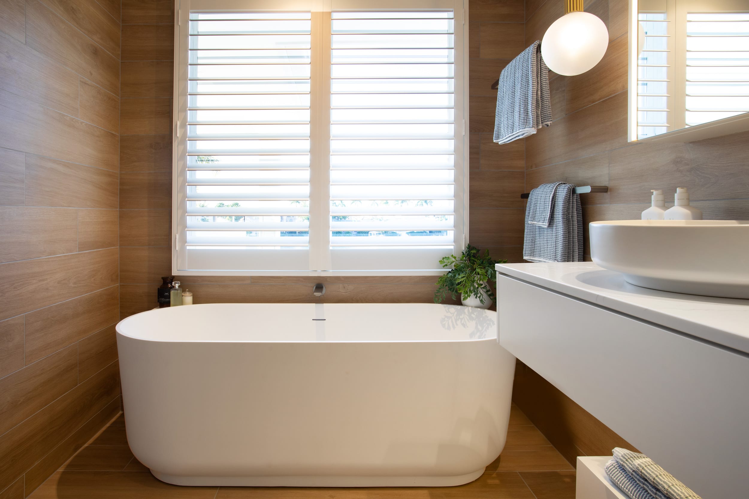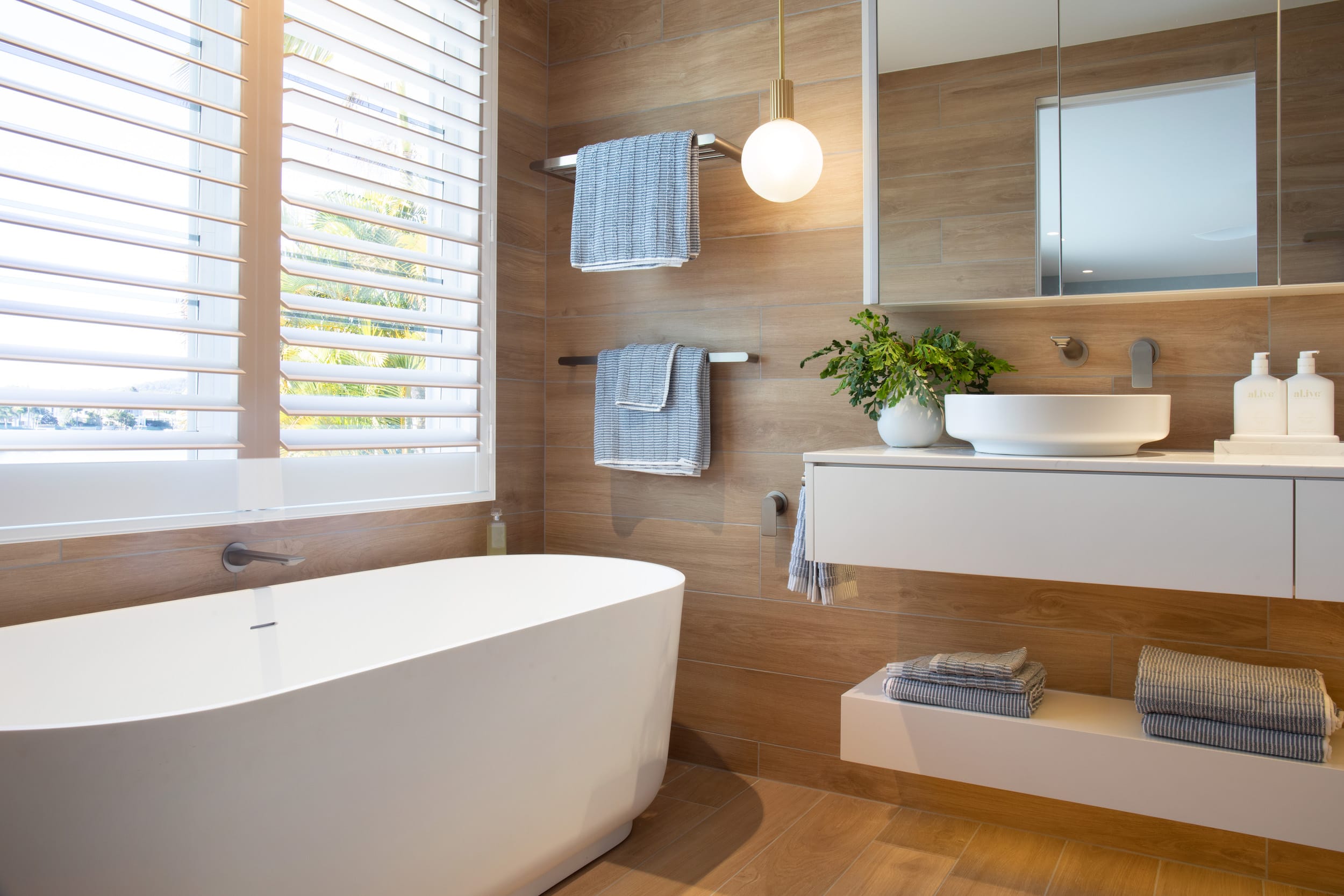 Weathered tiles in a natural tone set the scene for this nature-accented bathroom with a wood-finished double vanity – the wet zone includes a brass rainhead shower and sculptural tub