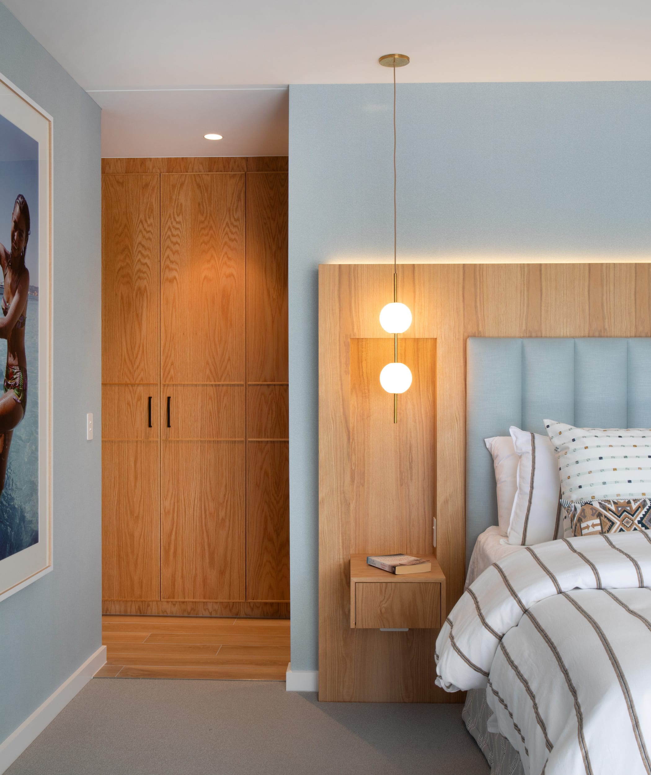Bedhead wall cabinetryAmerican Oak veneer with slim profile – 10% gloss finish | Bedside lightingNight works studio Code Charlie Tango, Midnight brass finish 125 diam x 598 fitting |
