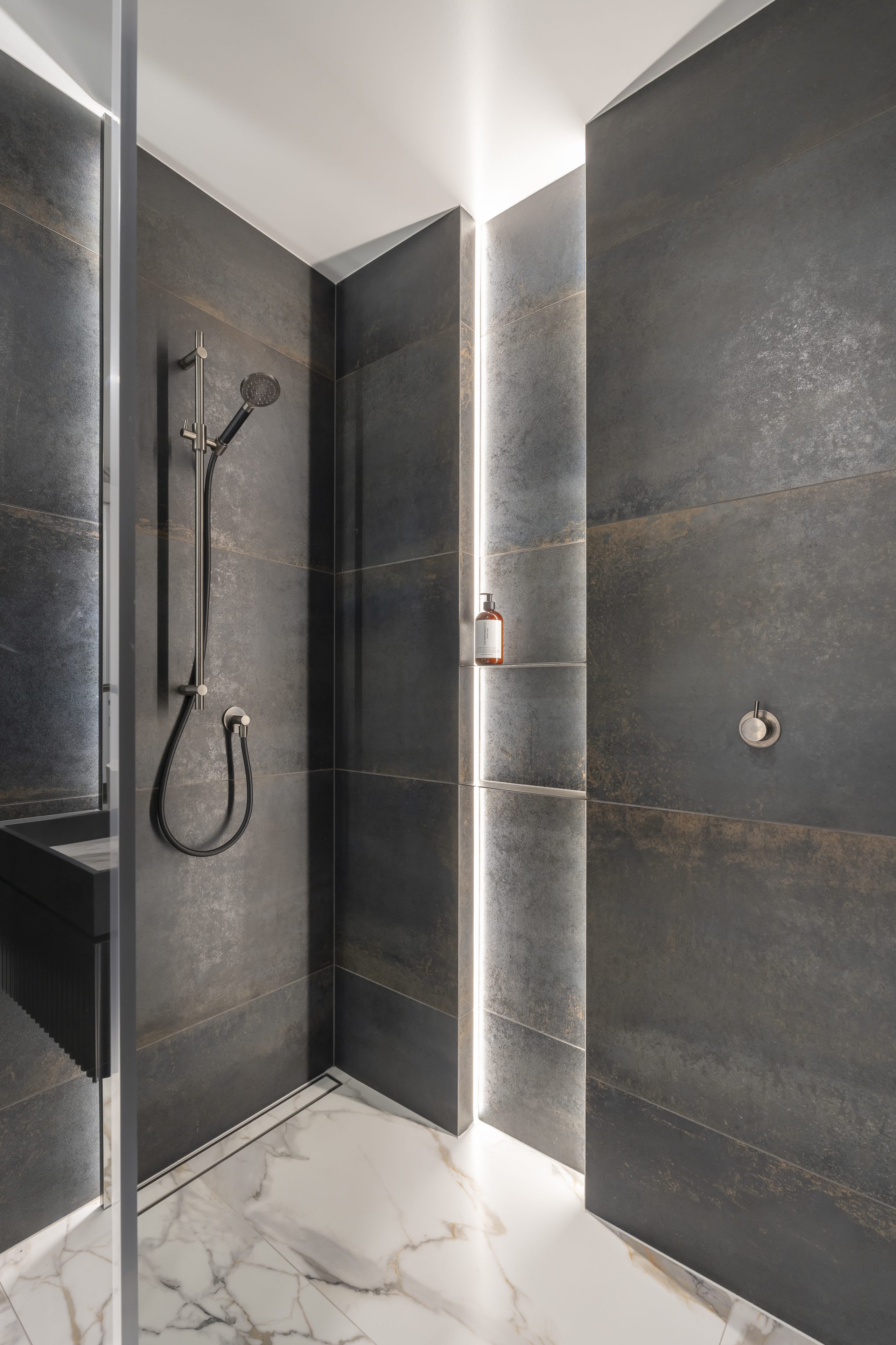 Two types of tiles, dark and light, were used to add depth and visual interest to the bathroom, providing a sophisticated contrast.