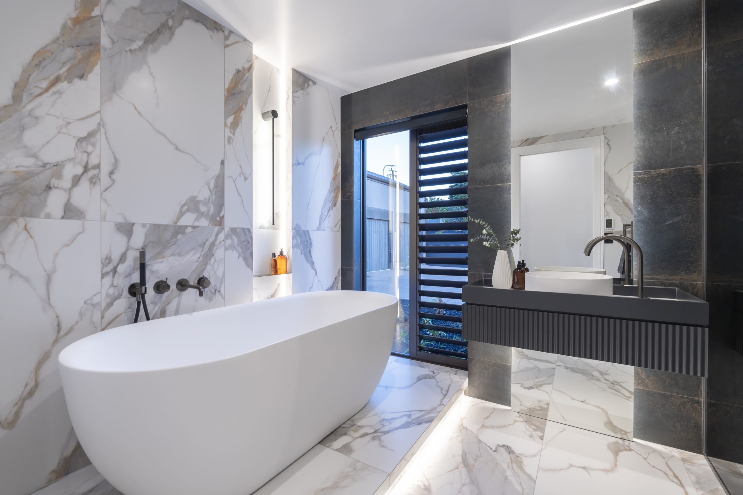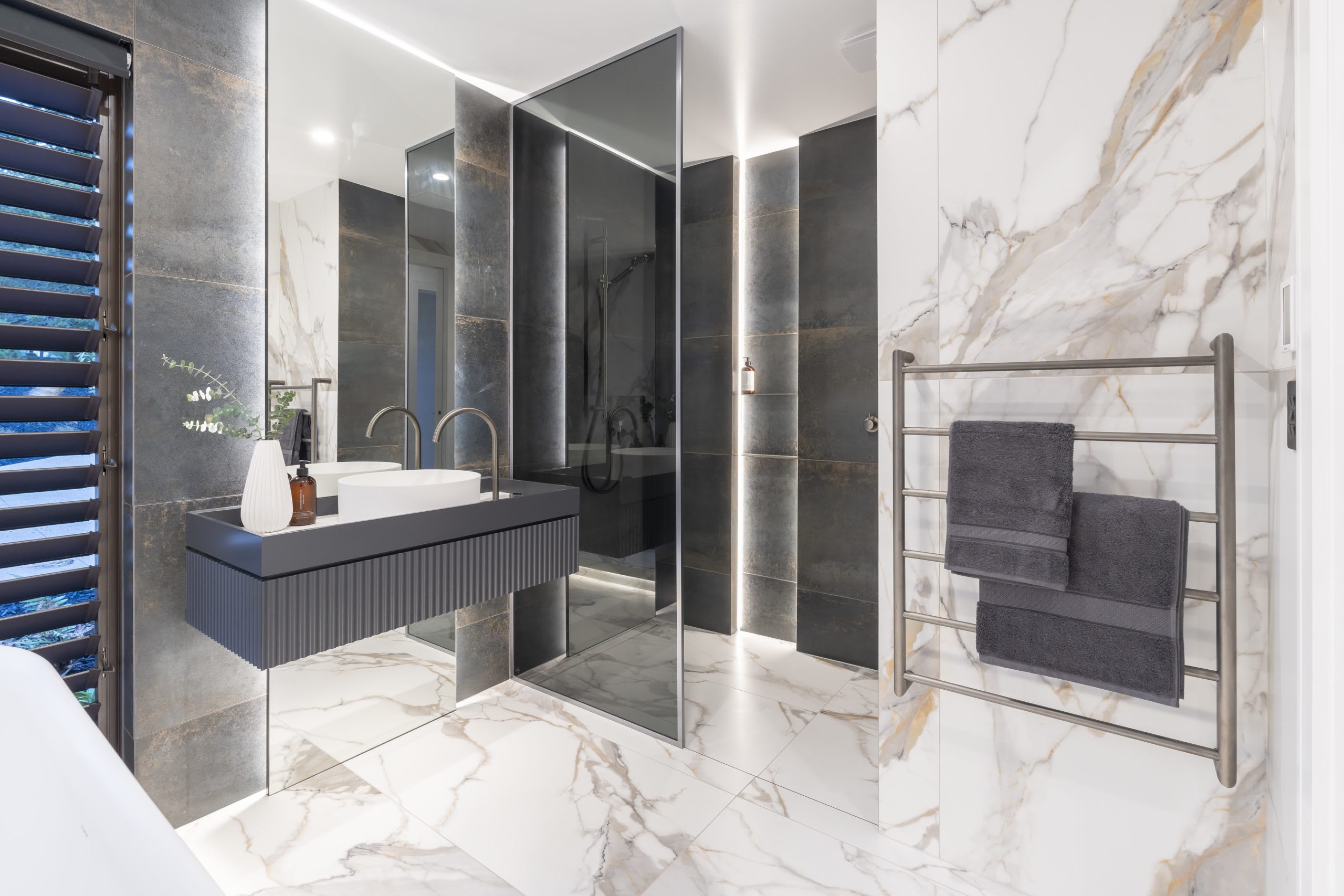 The owners, a couple who frequently host guests, desired a luxurious and modern main bathroom.