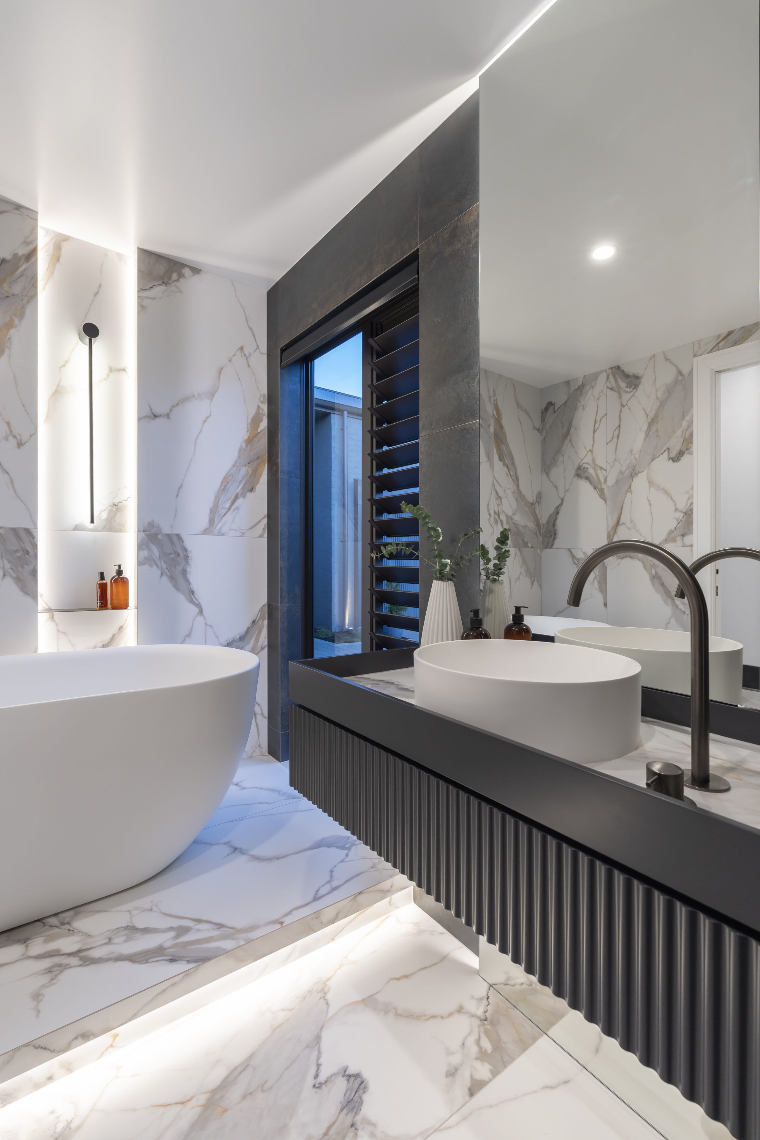 Finely rendered curves fulfil more than one role in this master ensuite-meets-dressing space, while a stand-out marble backdrops tub and shower stall