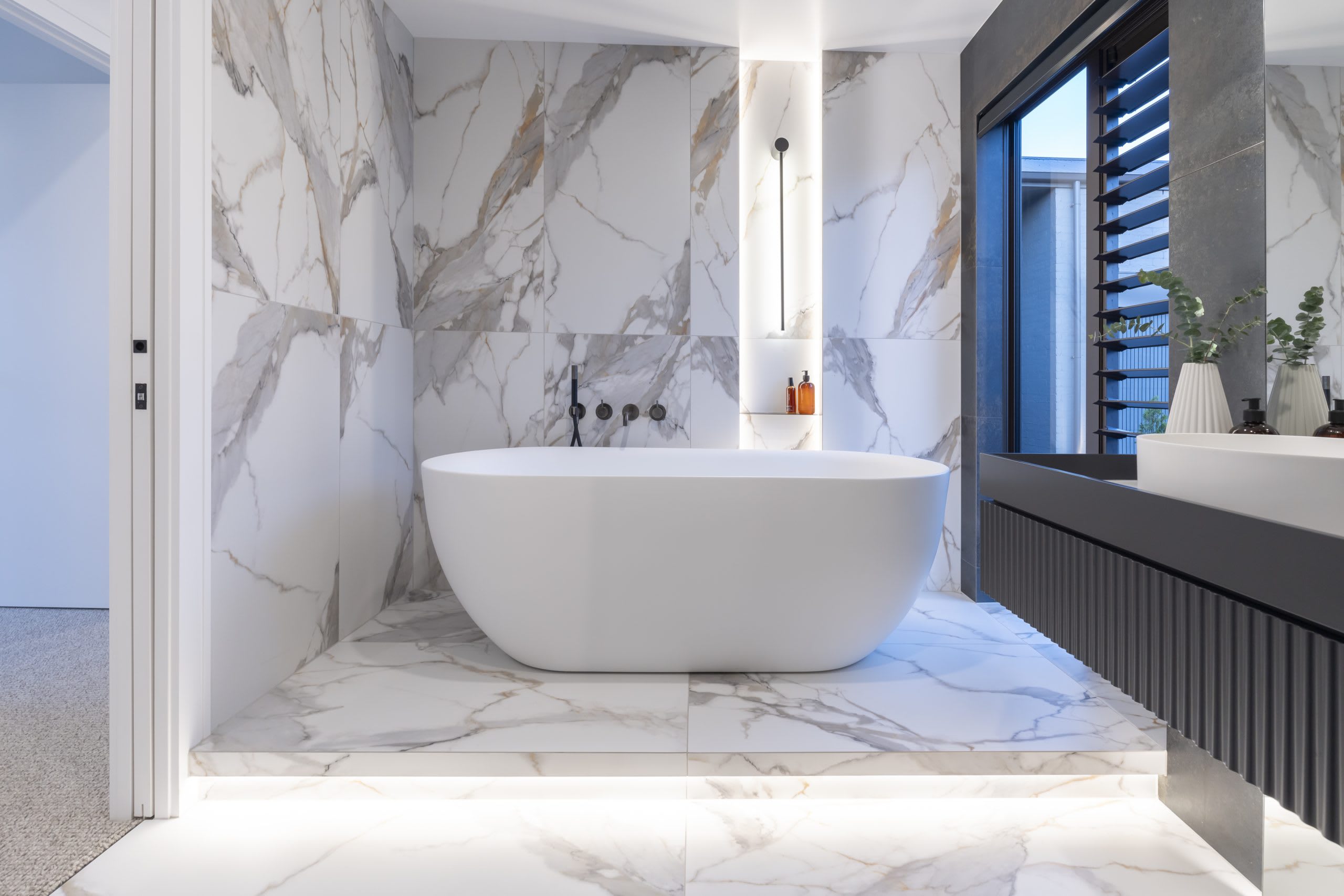To meet the owners’ desire for a luxurious and modern main bathroom, I created a space featuring a freestanding bathtub elevated on a step with integrated lighting for a dramatic effect.