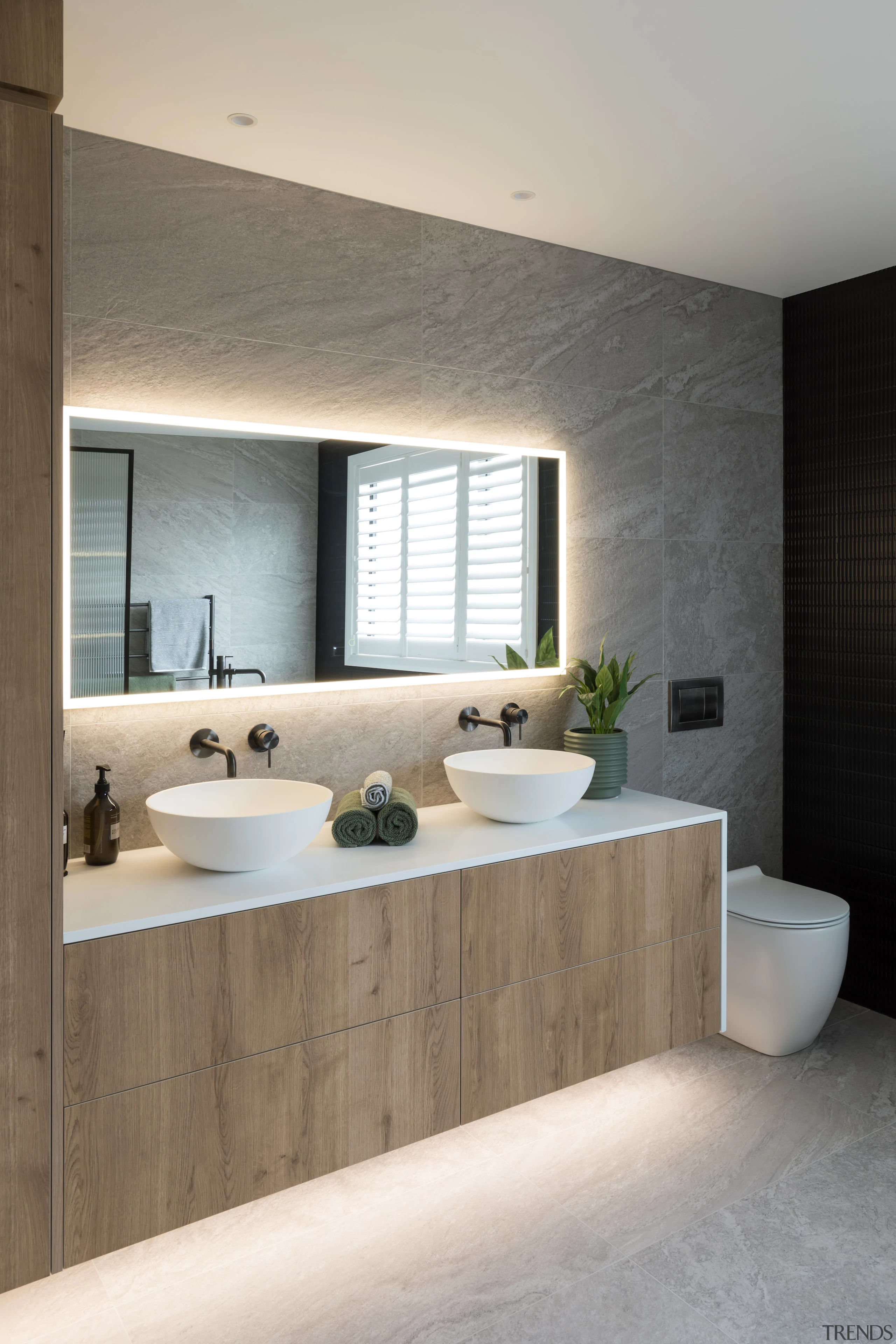 Dark tones and atmospheric lighting come together to give this spacious bathroom an individual design presence – a cantilevered, minimalist vanity complete with contemporary table top basins draws the eye on entry