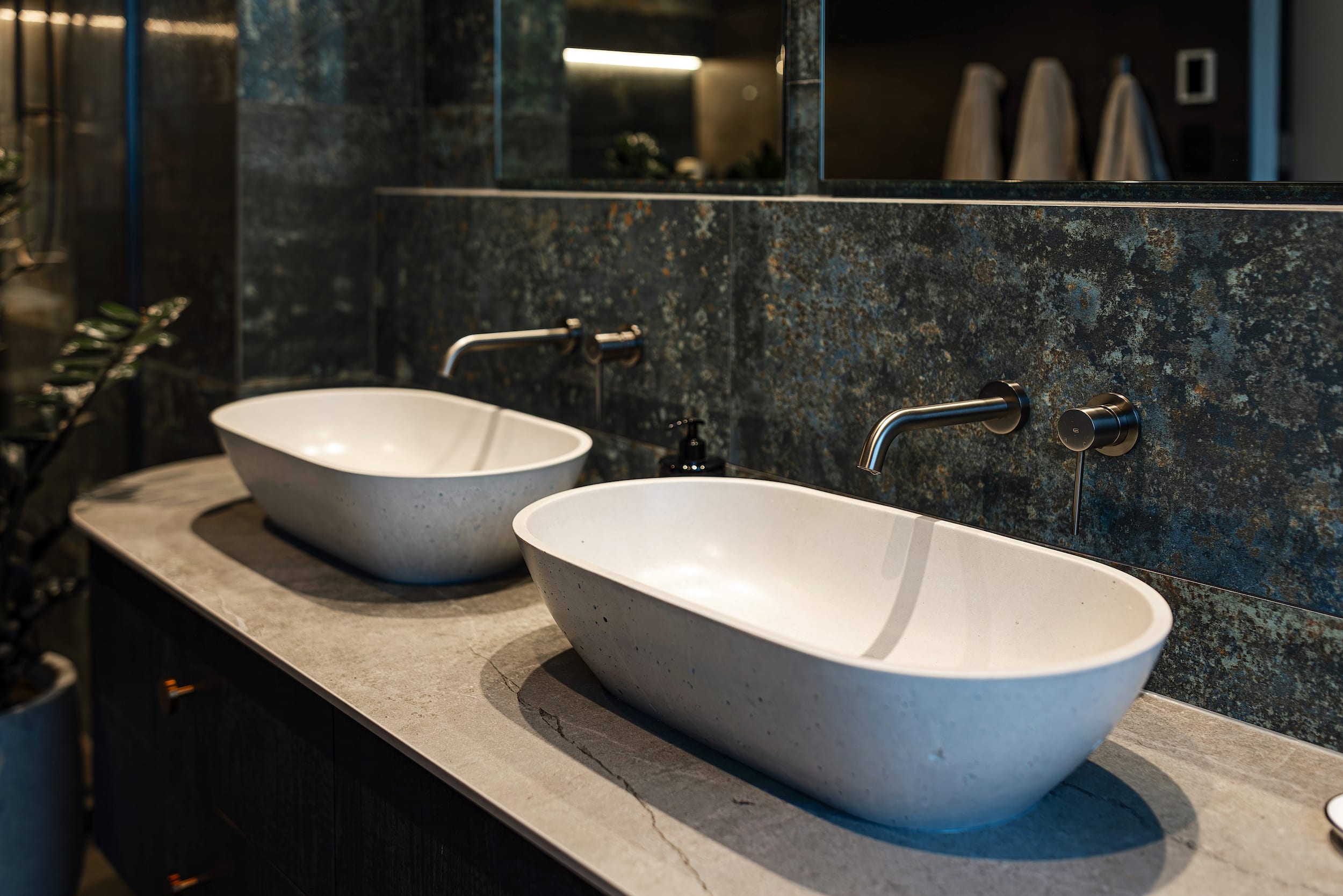 Dark tones and atmospheric lighting come together to give this spacious bathroom an individual design presence – a cantilevered, minimalist vanity complete with contemporary table top basins draws the eye on entry