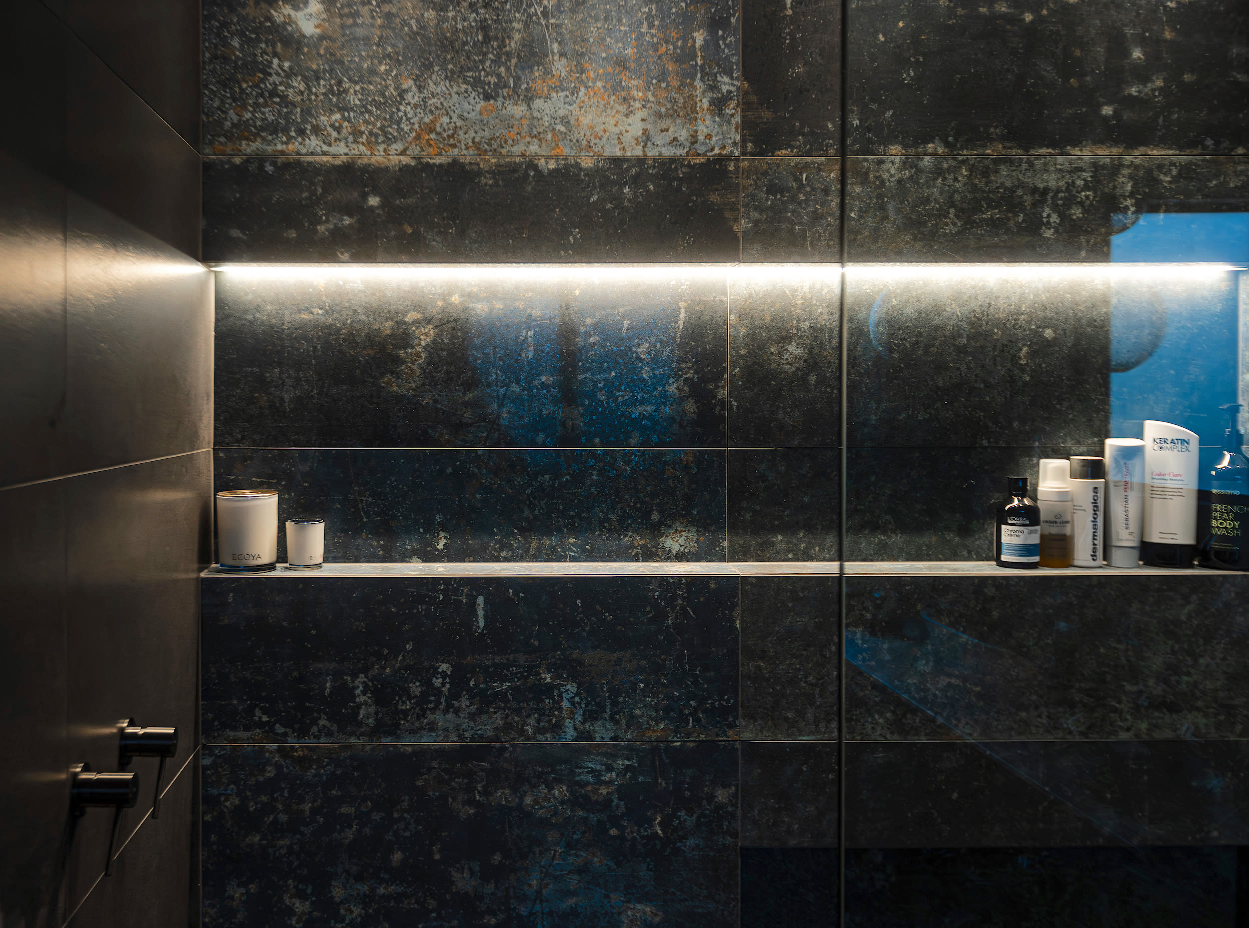 Strong linear elements in the ensuite are softened, and the patina and textural variation within the tiles highlighted, both by the mitred detailing and extensive lighting throughout – adding grandeur to the master bathroom.