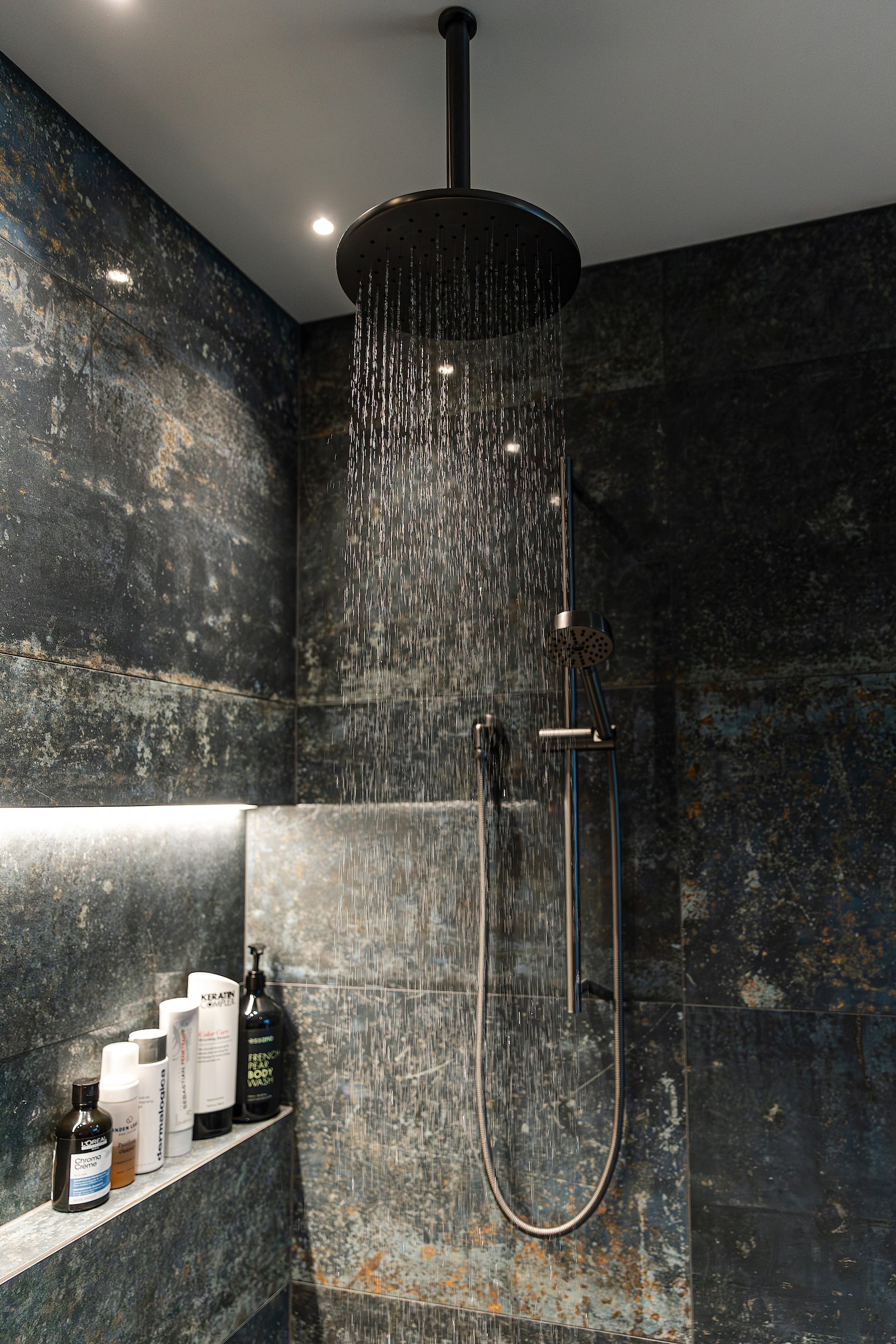 TapsGisele wall mounted spout and mixer, in Brushed Gunmetal, by Greens Tapware | Shower stallFully tiled – all tiles supplied by Quantum Ceramic Group; Marmox trays and recessed tile insert strip drains, from Steve Brown Tiling |