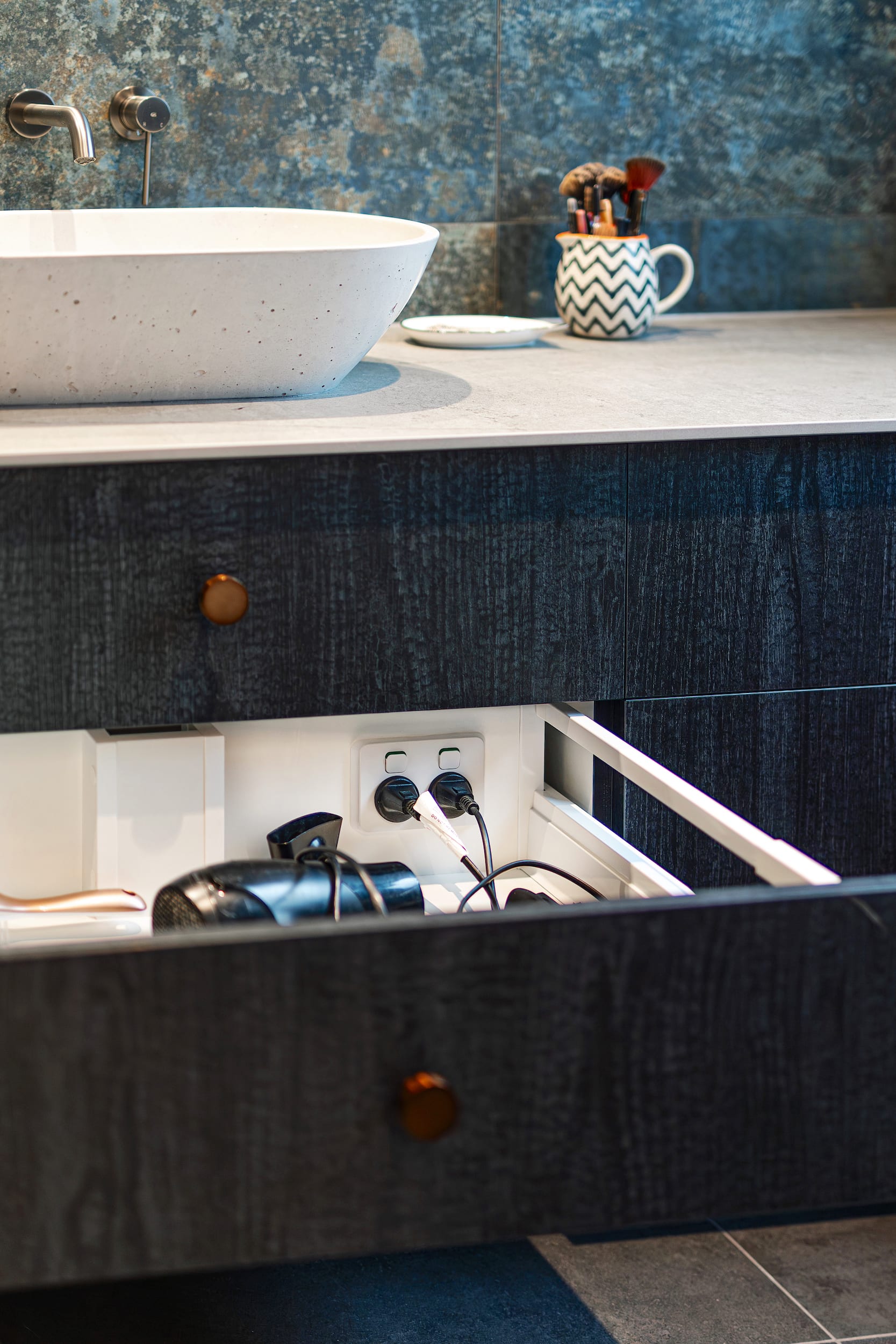 Continuation of materiality from the kitchen, pantry and laundry, sees the use of 12mm Dekton Sake as the elongated benchtop – an industrial concrete-look finish offers contrast to the depths of the Shau Sugi Organic Melteca cabinetry and provides a surface resistant to direct heat contact from hair straighteners, while providing ample workspace for dual use.