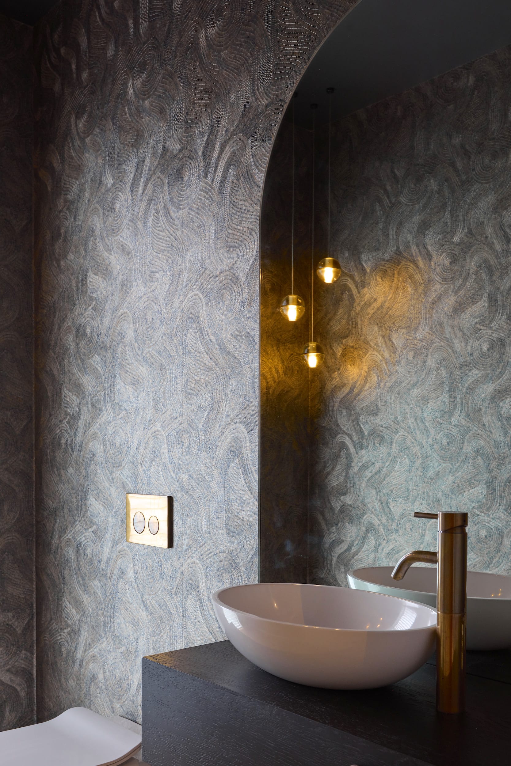 The centrepiece of this room is a handmade Cristalplant basin while the organic-shape wallpaper in blue and gold, complemented by a dark blue ceiling, creates a sense of intimacy and sophistication.
