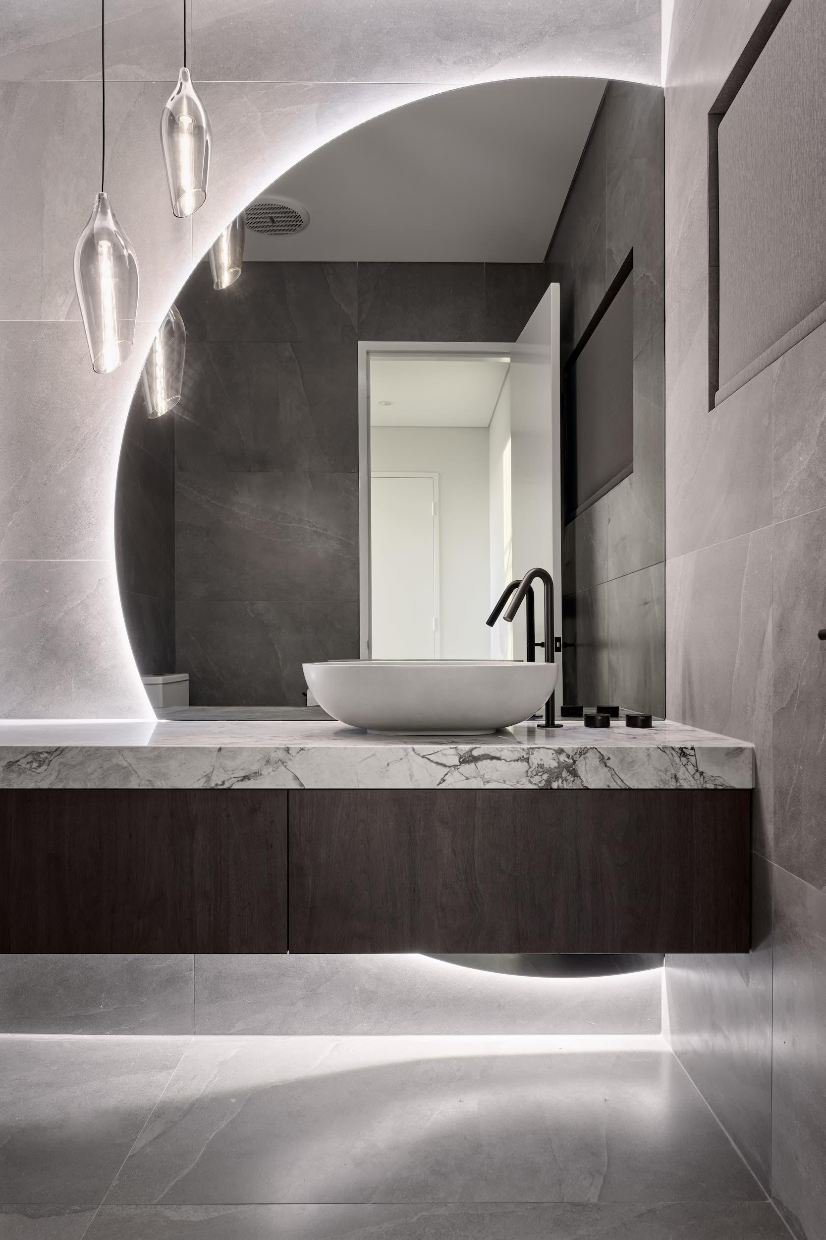 This engaging powder room reflects the lux of a high-end hotel – recessed lighting behind a half-moon mirror and a floating vanity with bench-mounted Milli Pure Vessel Basin Set are just two refined touches.
