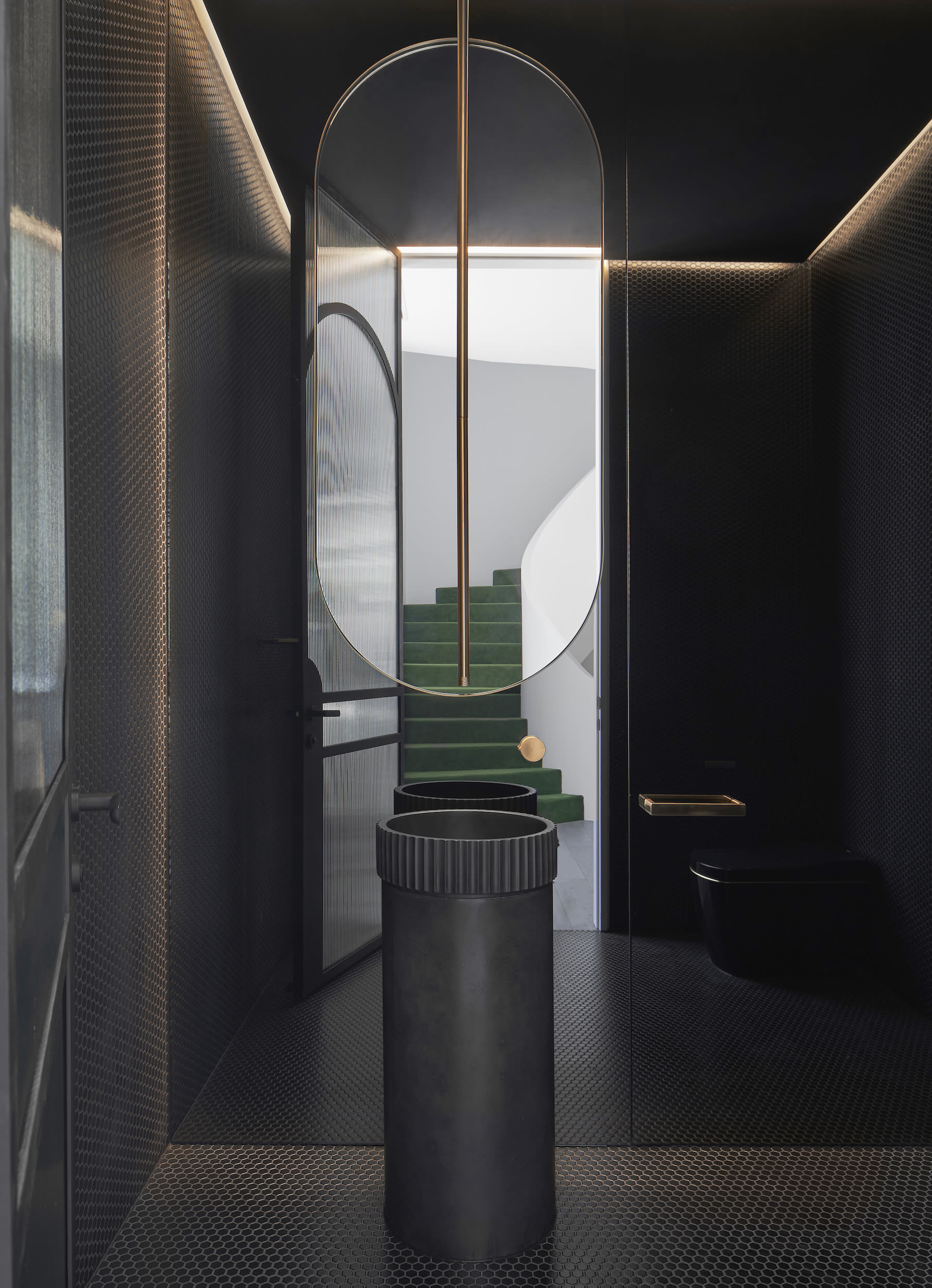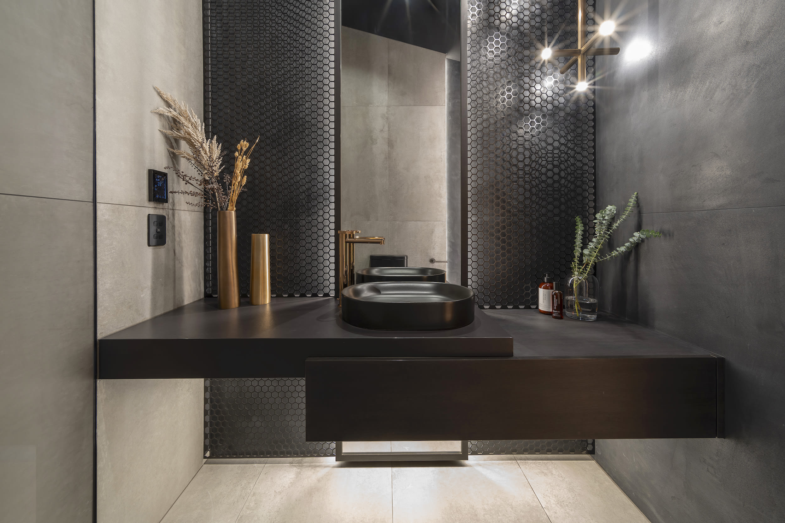 This powder room boasts a feature wall finished in Archi+Concrete in Black that’s illuminated by LED lights recessed into a full-height mirror – powder-coated mesh adds mystique shade effects, enhancing the overall drama.