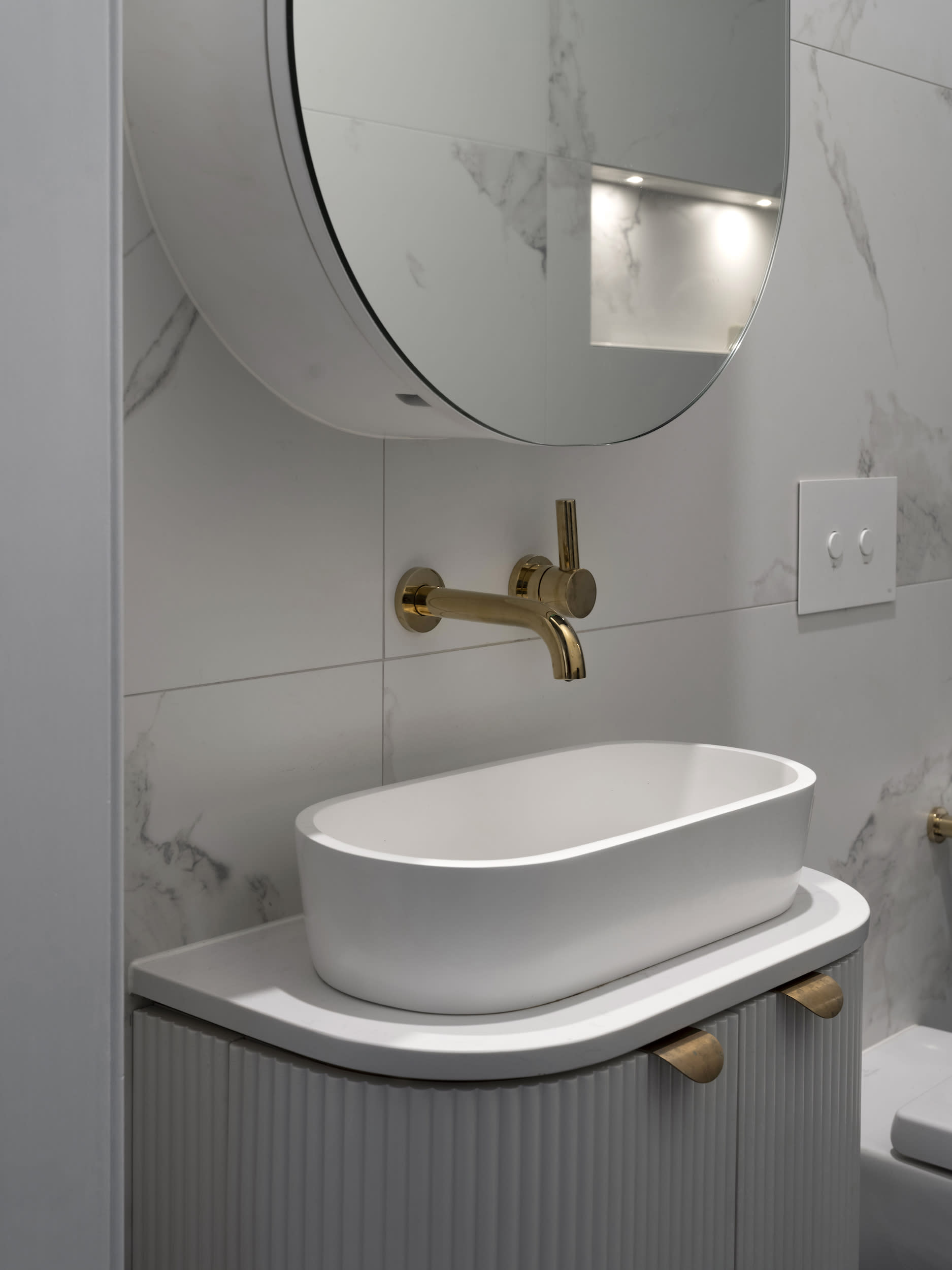 Rounded forms are employed throughout this powder room to maximise the compact space while creating a sense of fluidity – brass tapware and detailing add a touch of timeless luxury.