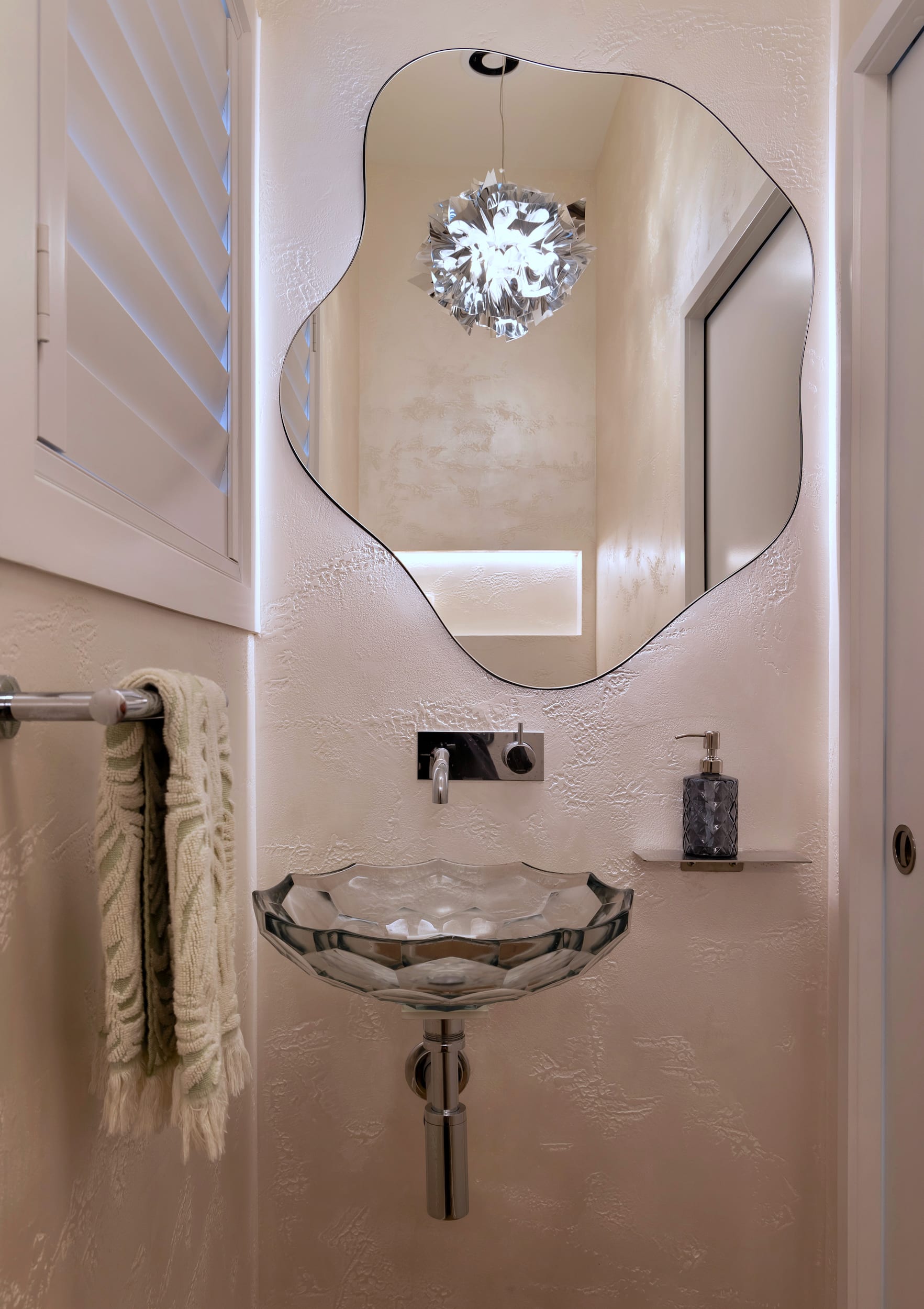 This powder room reflects an individual flair – it’s hard to decide which catches the eye first: textured wall finish, sparkling pendant, shapely mirror or the sculptural basin.