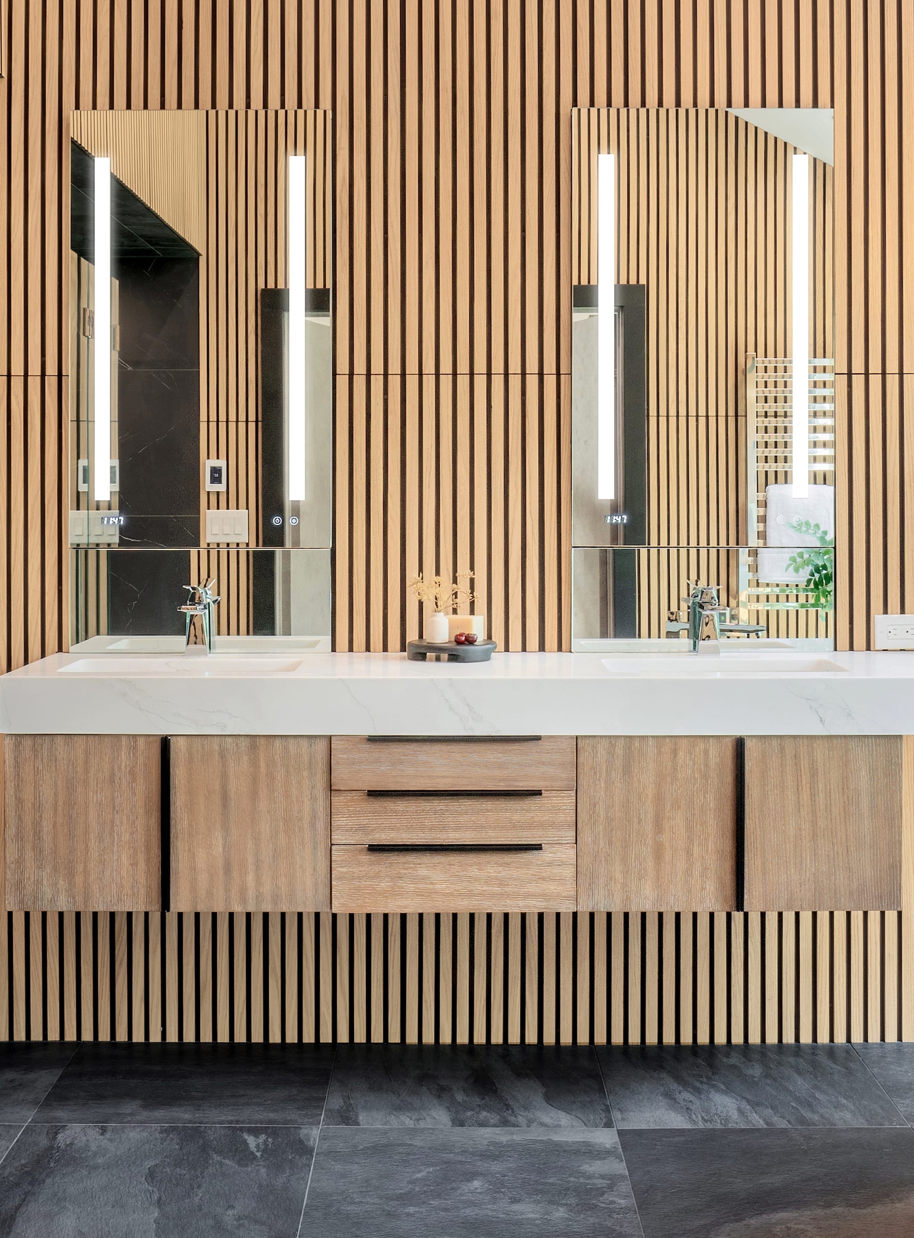 Here, ripple-textured tiles backdrop a freestanding tub, stand-out black double vanity and shower, while custom mirrors reflect the drama