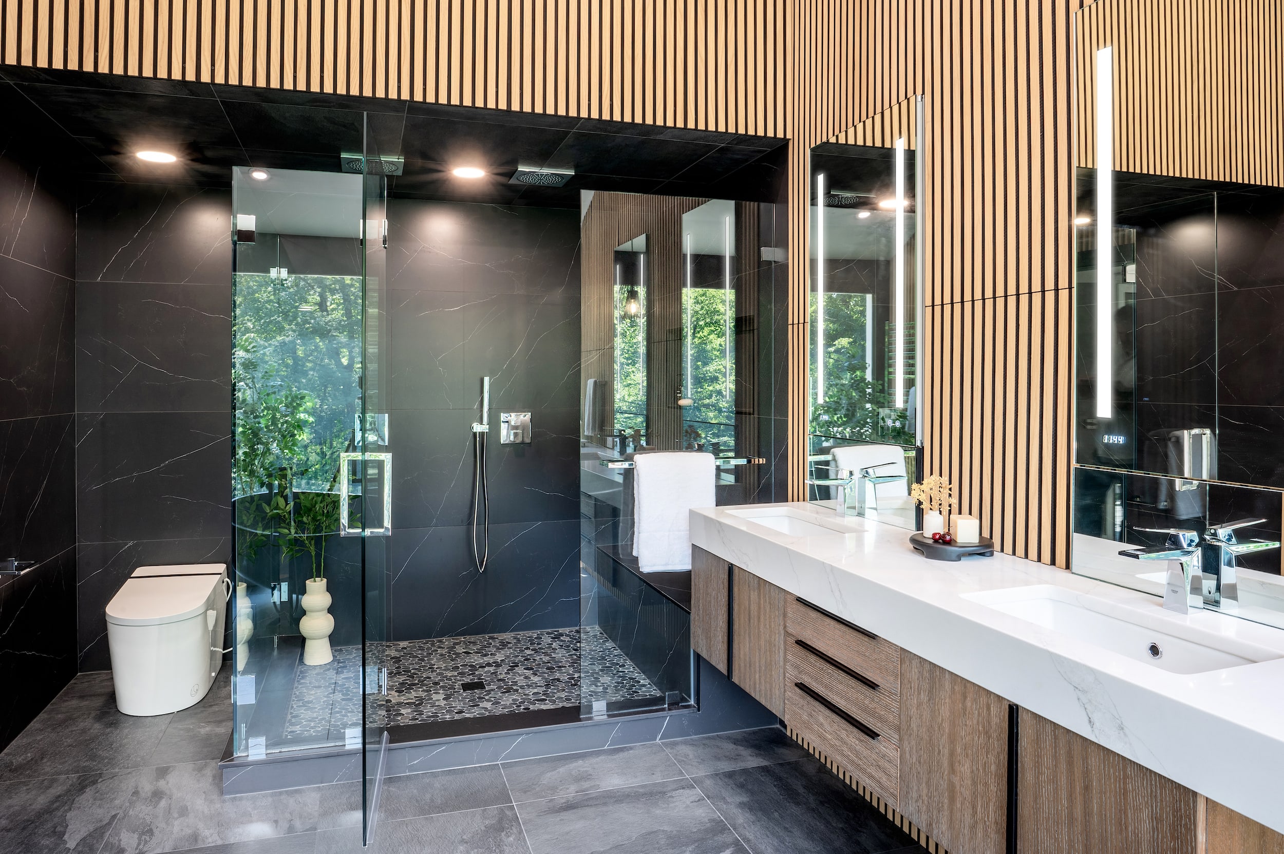 An industrial-inspired colour and material palette give this master ensuite an immersive presence – a dramatic vanity also makes its presence felt