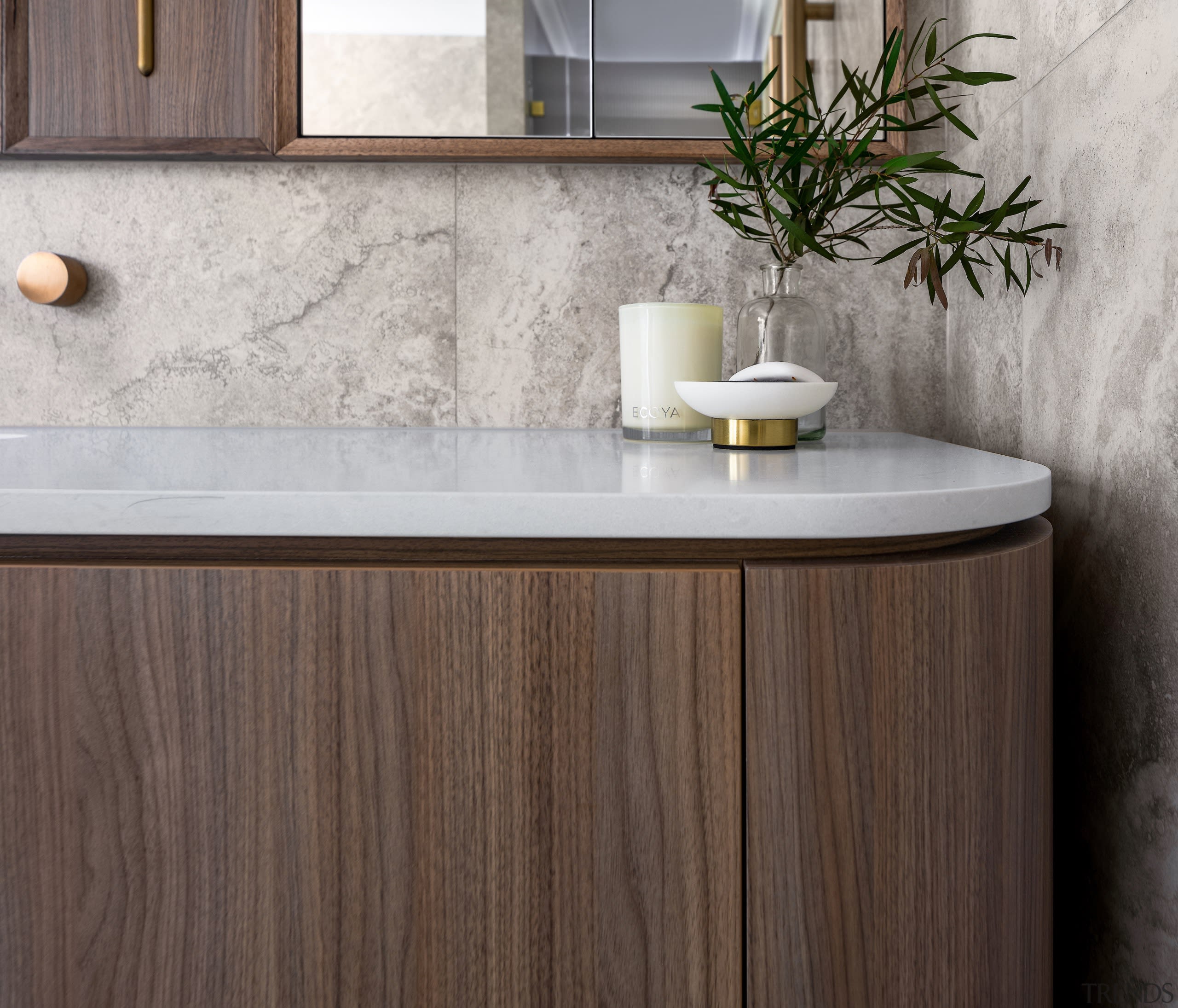 It's often the role of a powder room to be surprising and this one really takes up the challenge with a hand-crafted benchtop, organic look stone basin and character mirror from Thailand – a reconfigured entry avoids guest confusion and adds to the resell allure of the home