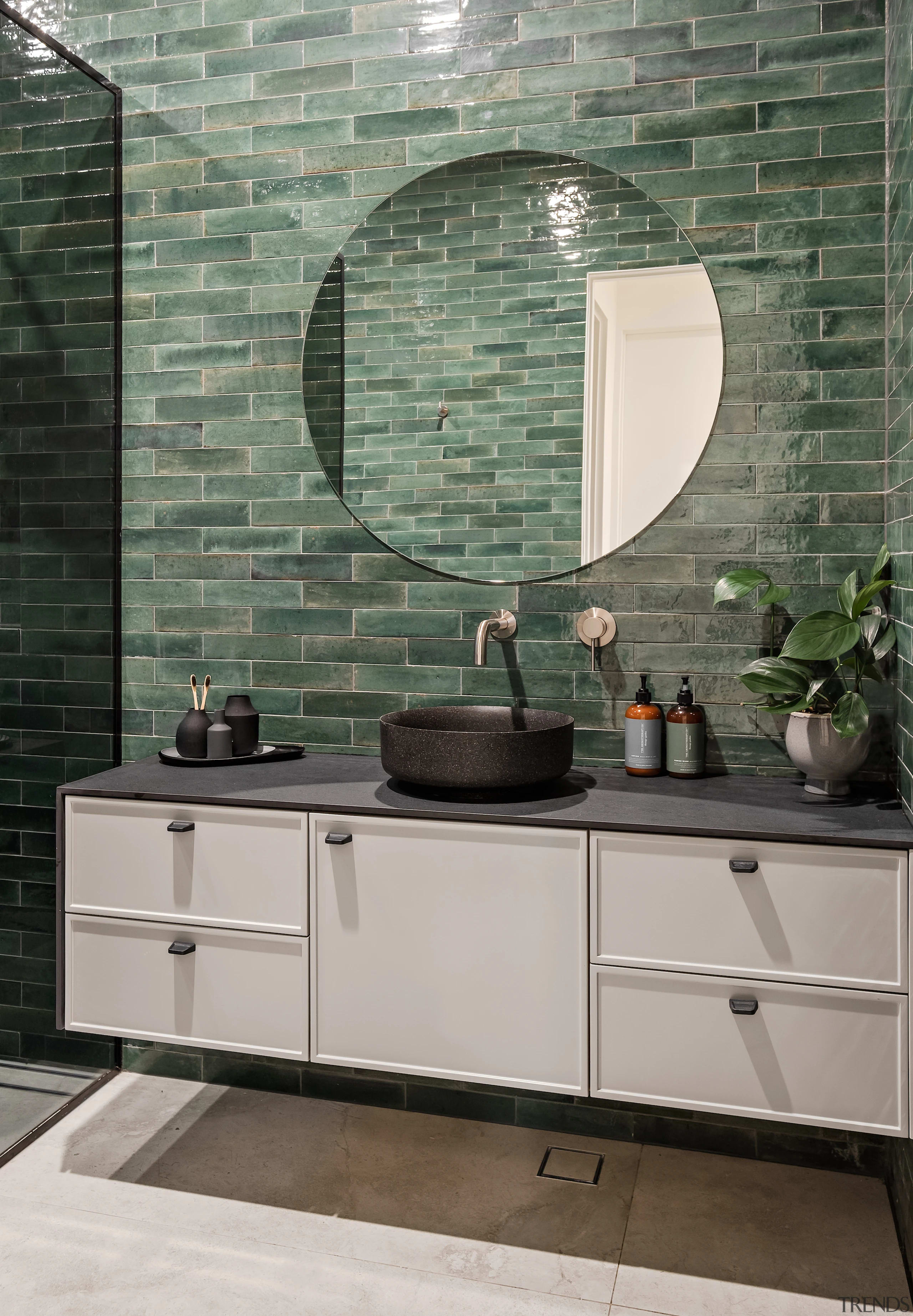 Dark tones and atmospheric lighting come together to give this spacious bathroom an individual design presence – a cantilevered, minimalist vanity complete with contemporary table top basins draws the eye on entry