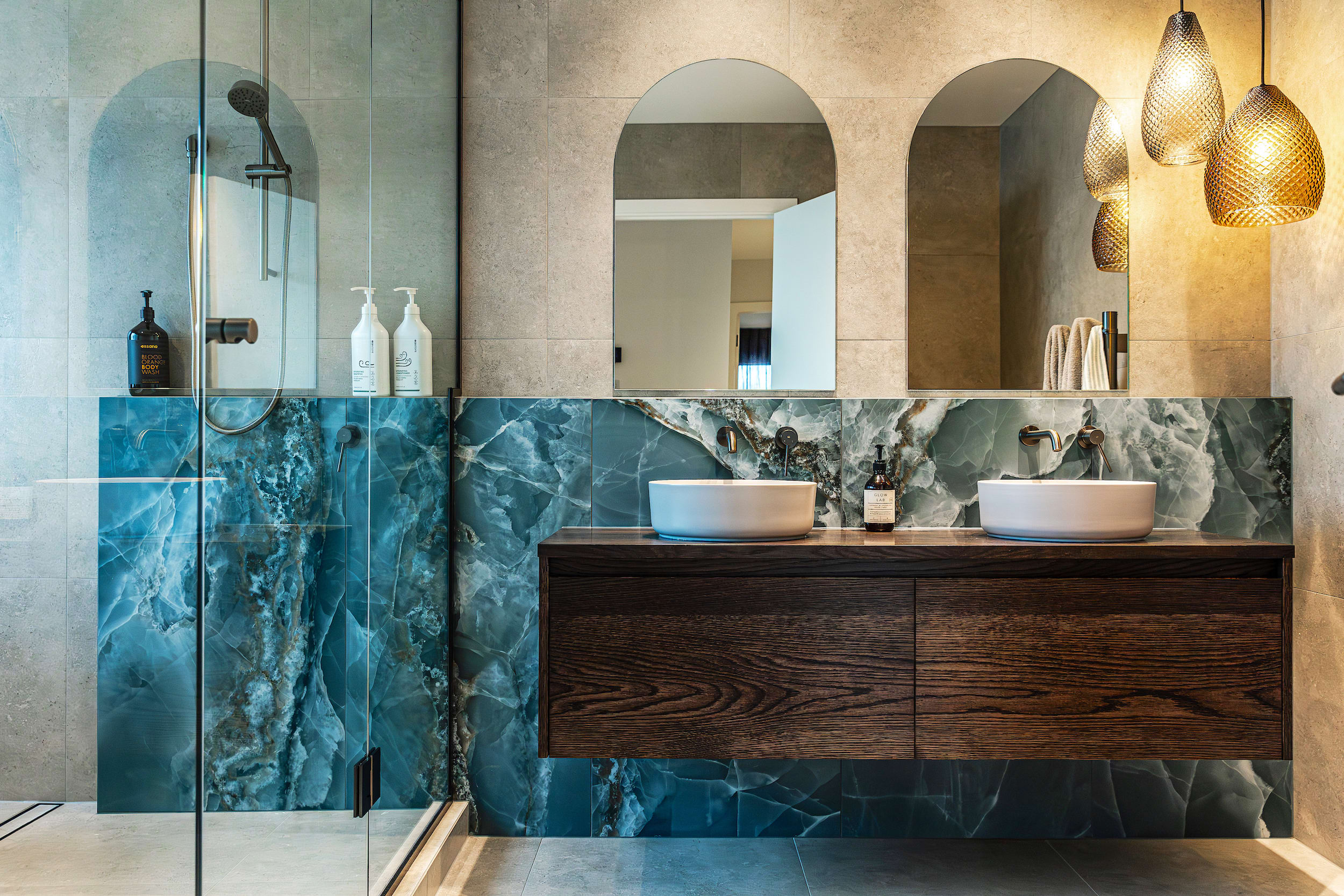 A focal point of this bathroom, a wall of Onyx, Green Natural tiles creates the effect of a larger slab of marble running from behind the vanity through to the shower/bath wet area