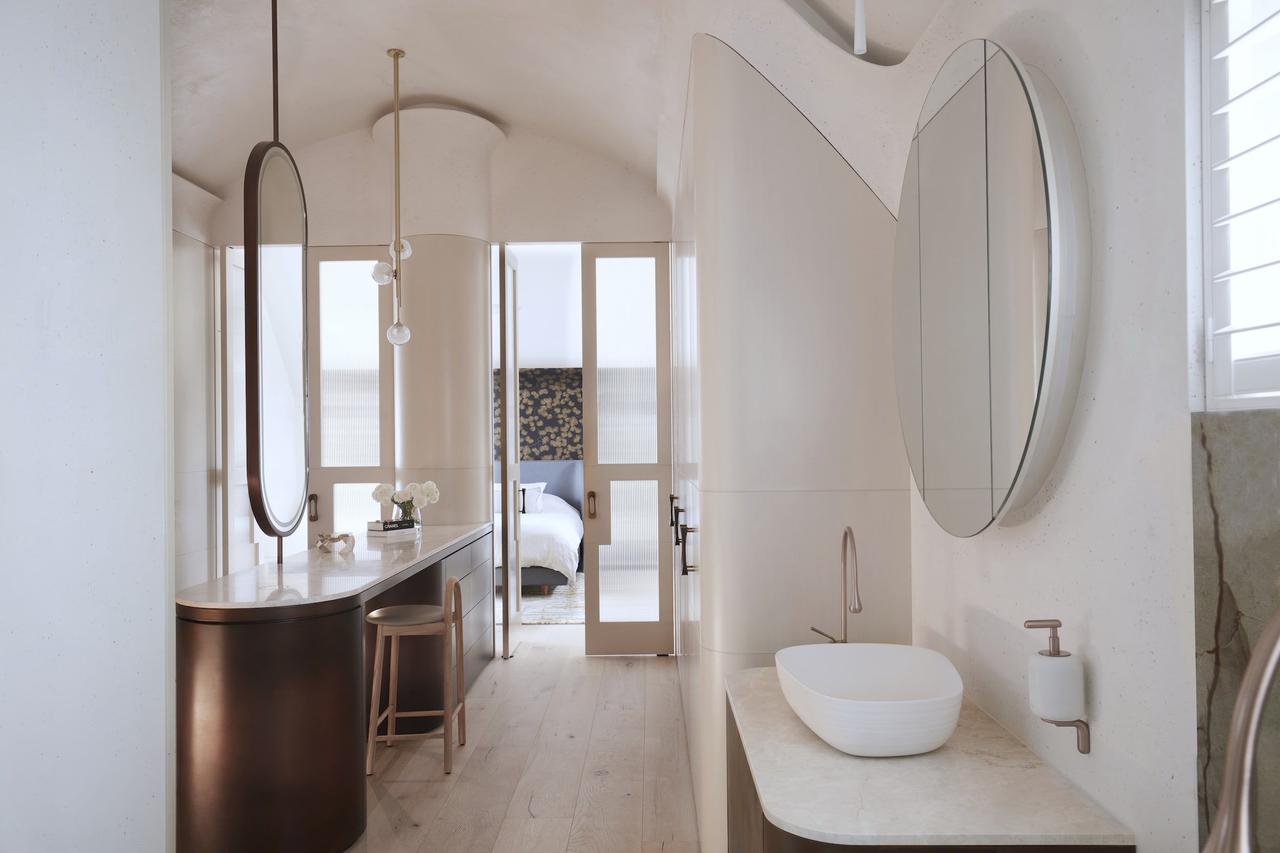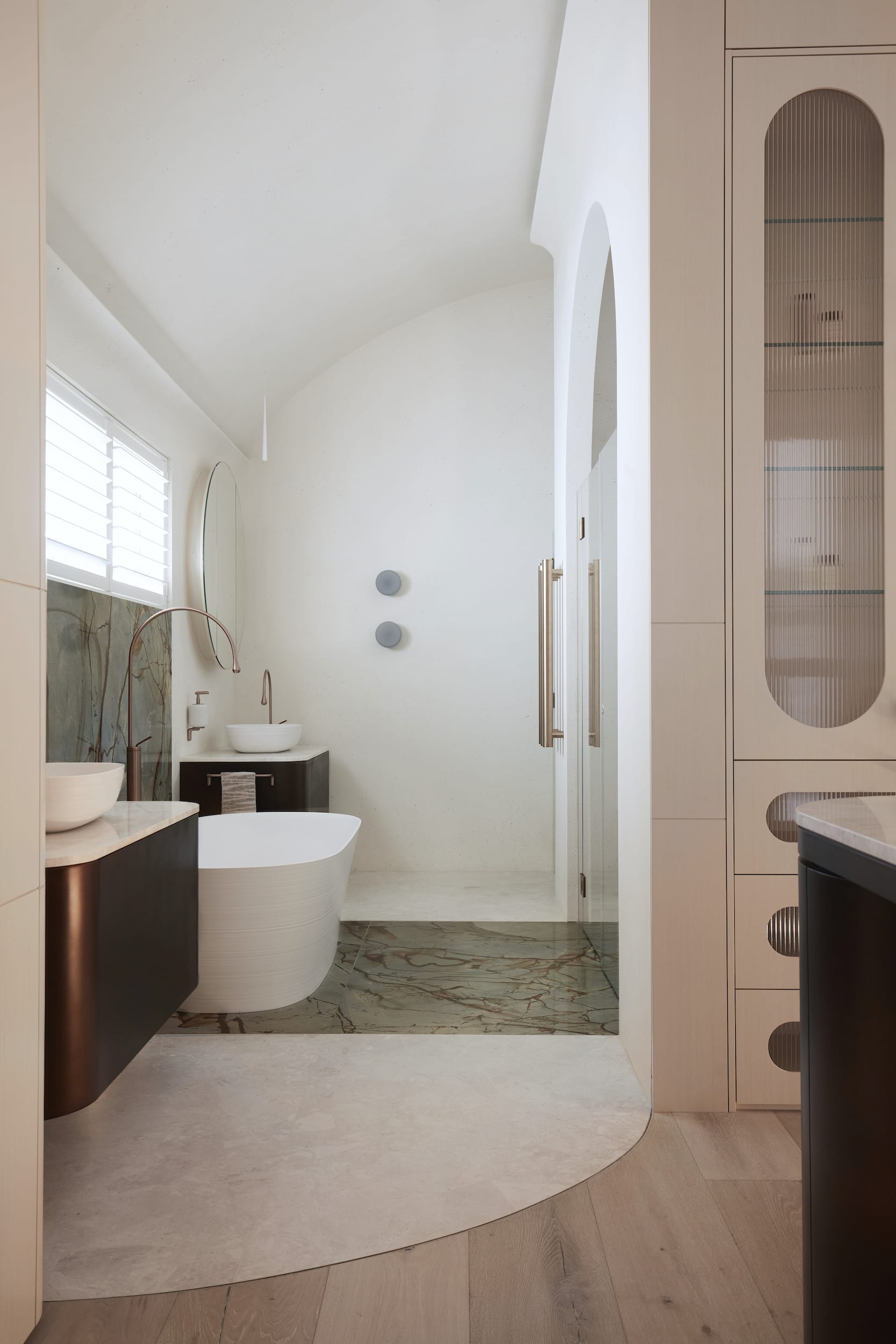 Every detail, from the tapware to the cabinetry, was selected to complement the curvature theme, ensuring a seamless and harmonious environment.