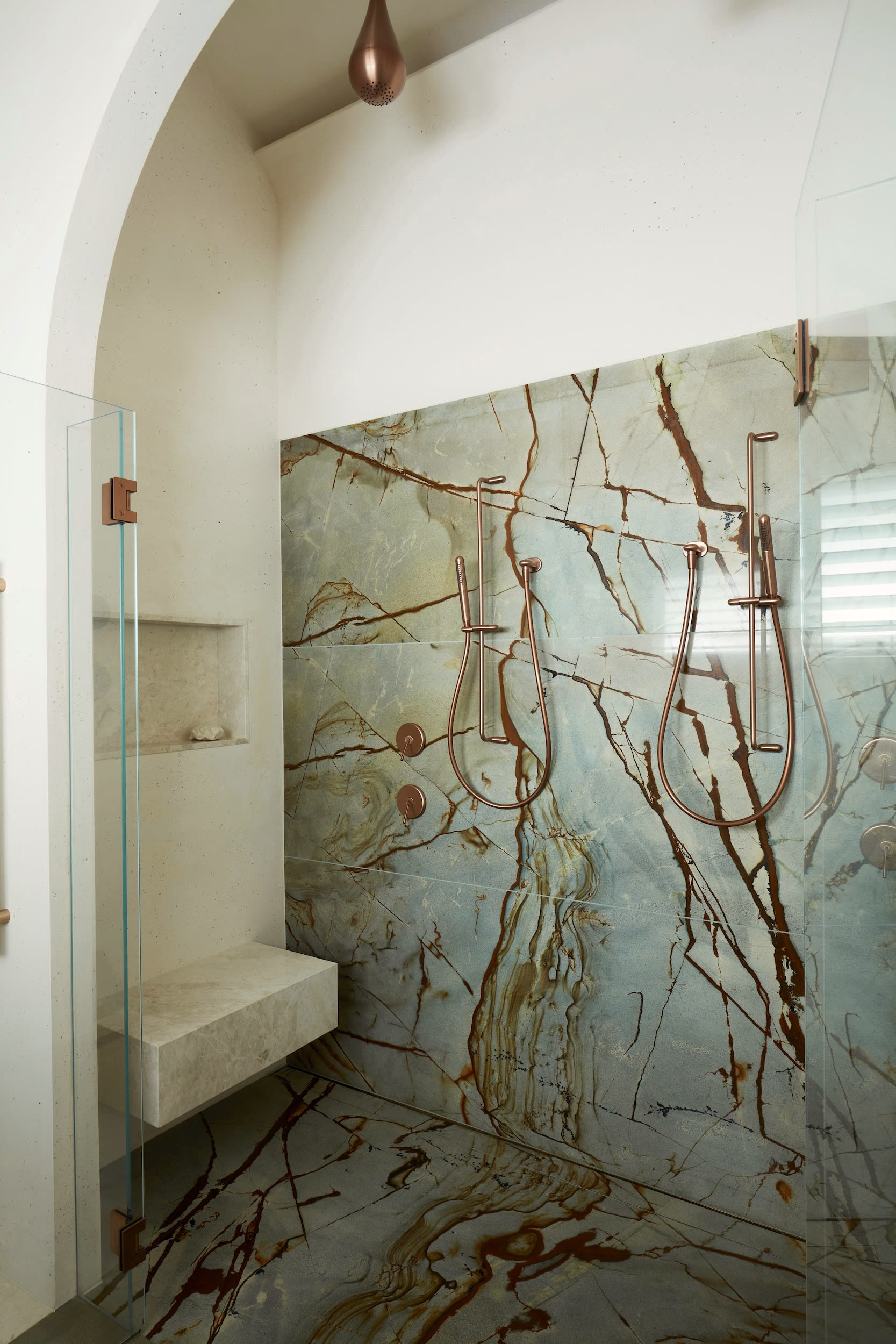 TapsGessi Goccia basin mixer with spout | Shower stall10mm toughened Starfire Frameless glass; hardware finish – recessed brushed copper channels into walls; brushed copper patch fittings |