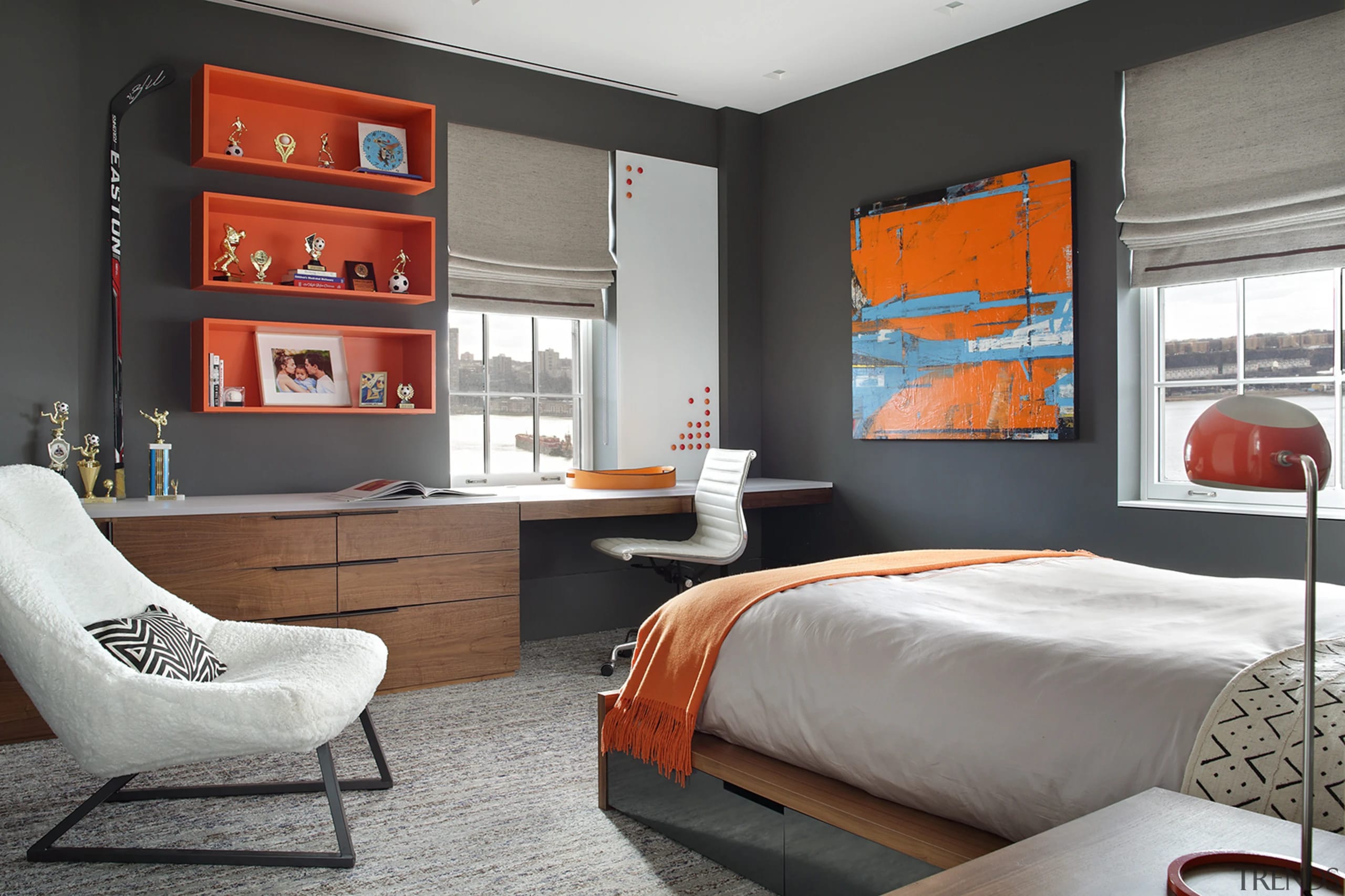 Older children may just like what you like – such as, optimising views with a desk under the window, along with celebrating art and bold colour contrasts – here, balanced by a hockey stick and attendant trophies!