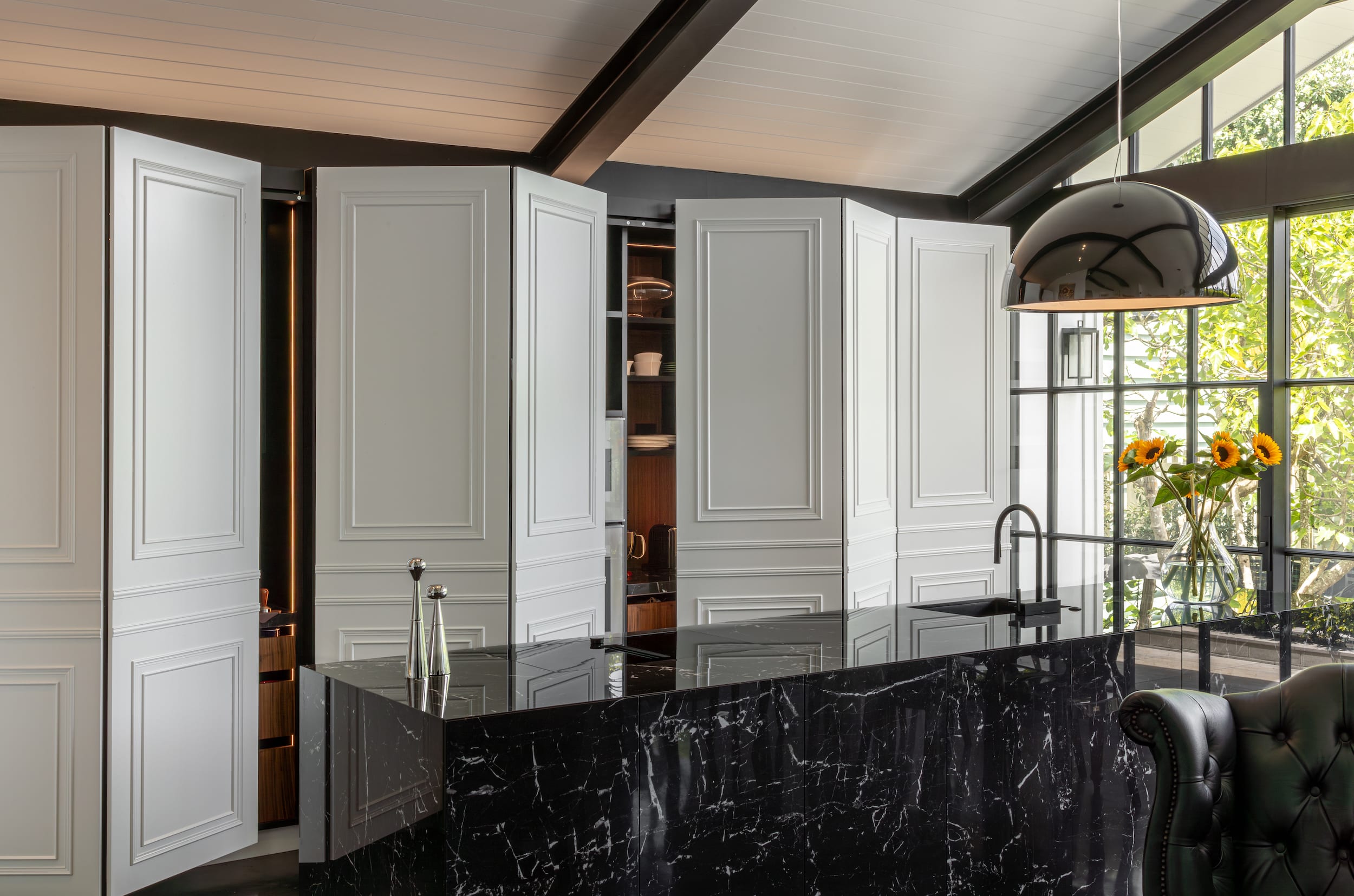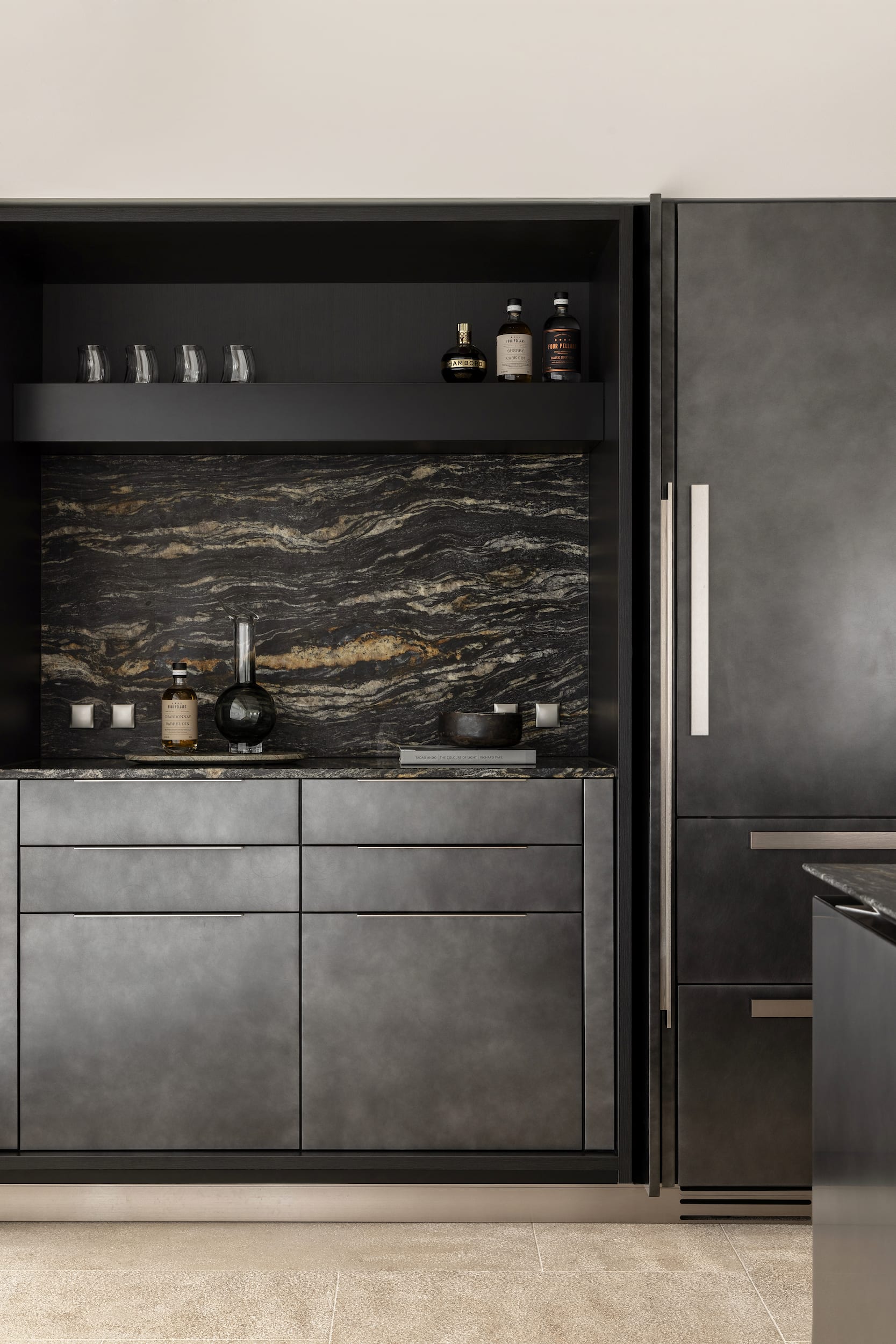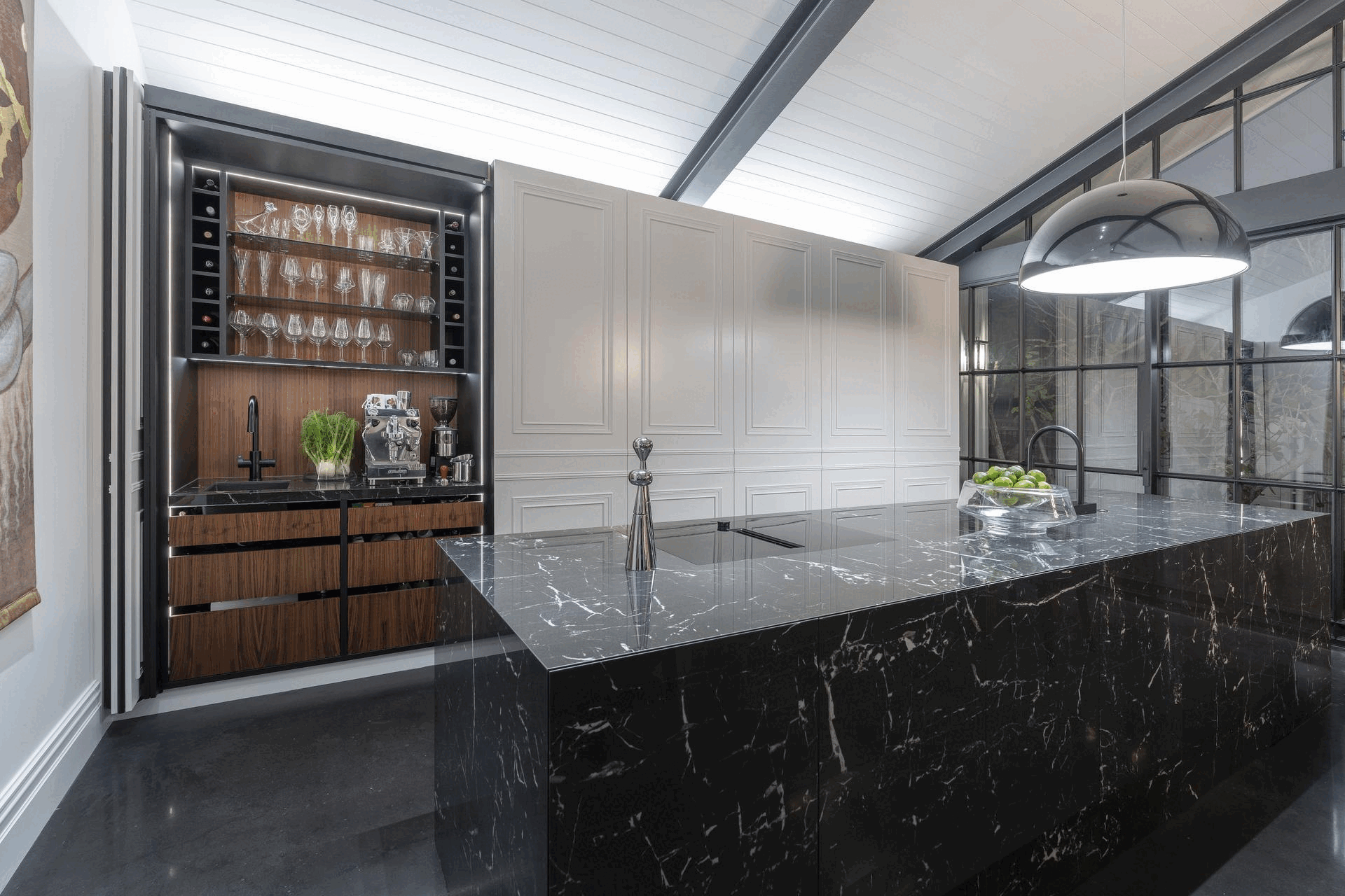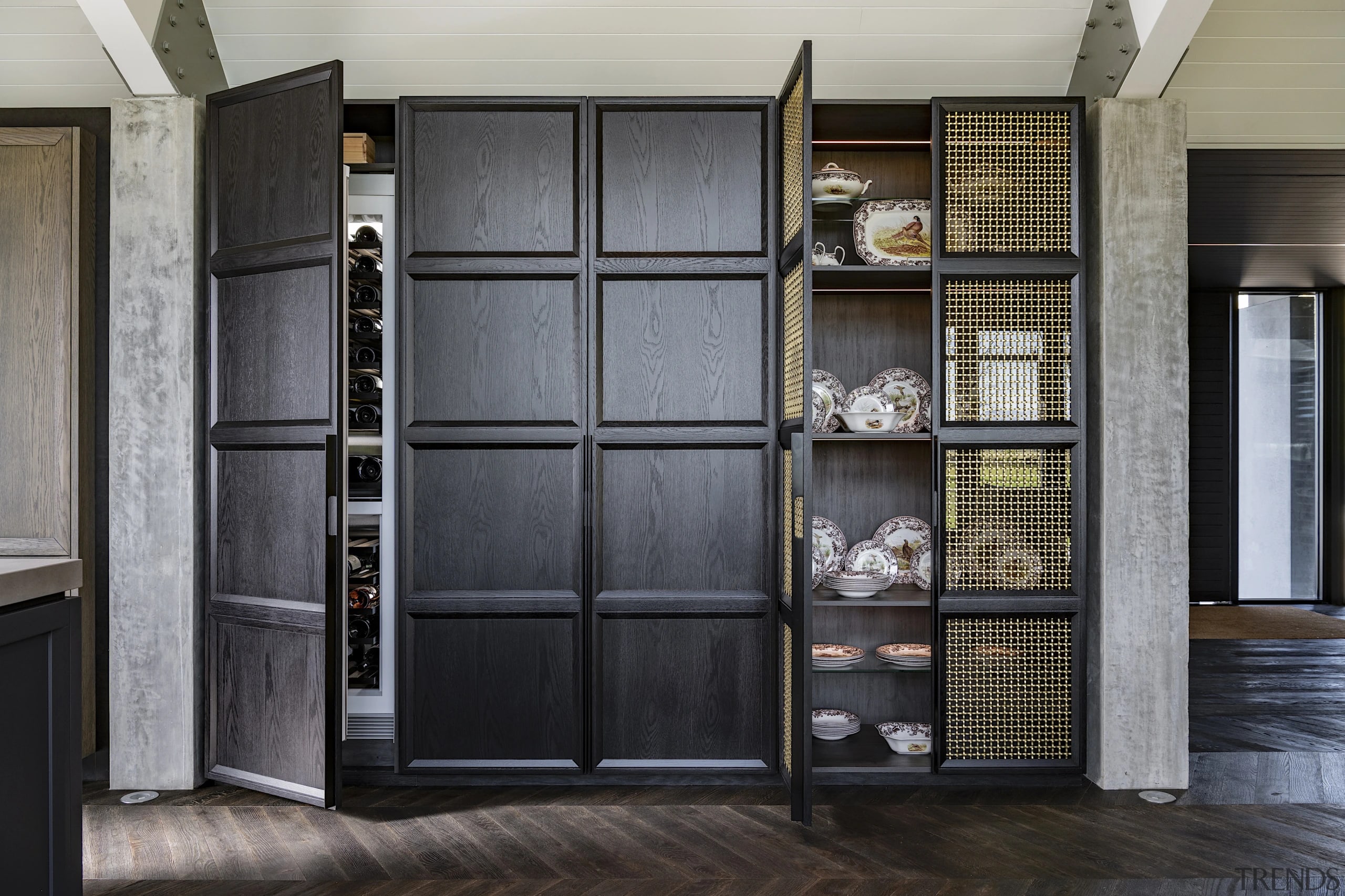The working pantry zone houses hidden appliances including dual fridges, all integrated to reinforce the refined detailing. This changes in the entertainment and bar section of the cabinetry, for which the box frame doors and woven brass metal inlay deliberately reinforces a furniture-like aesthetic.