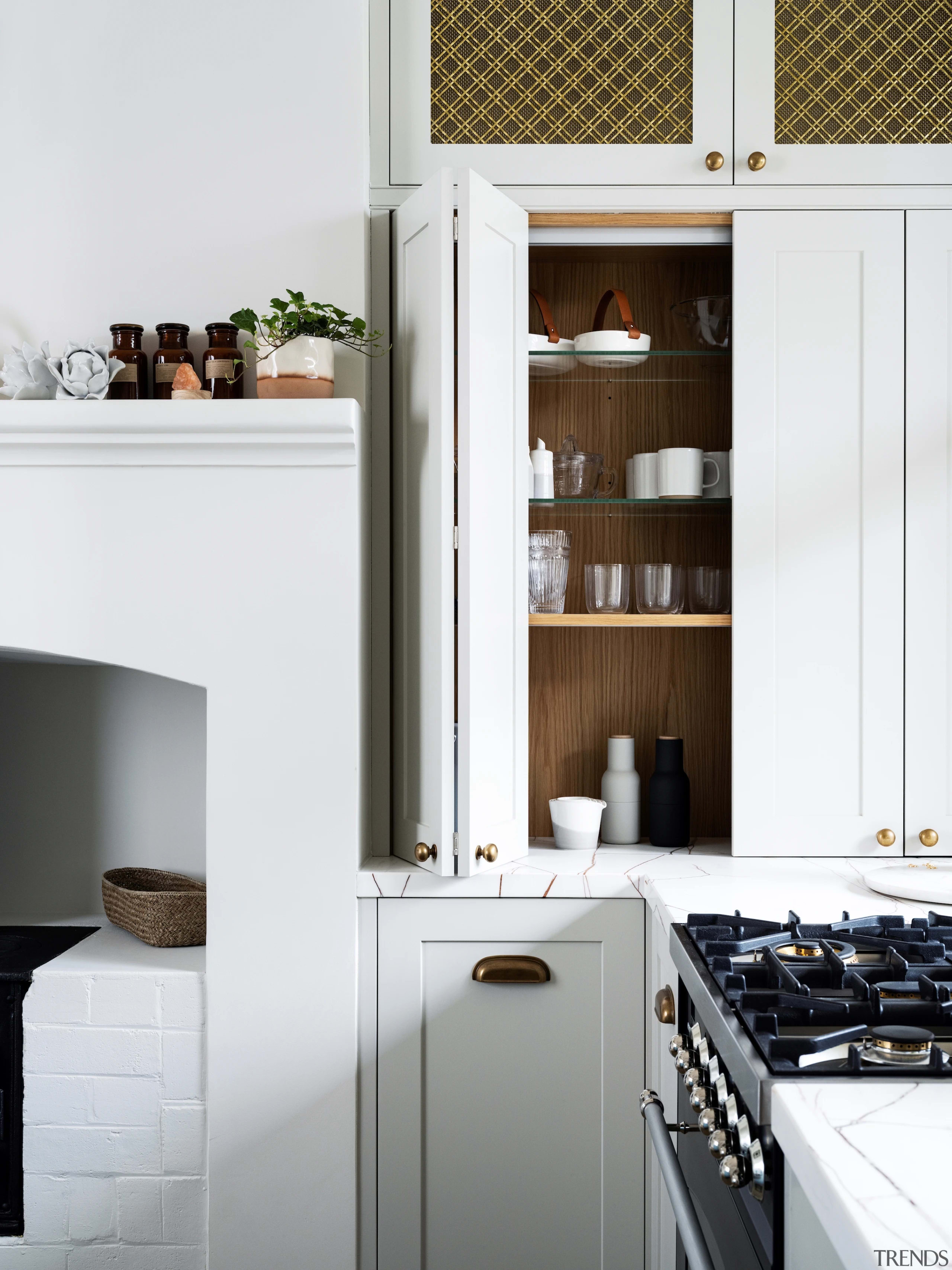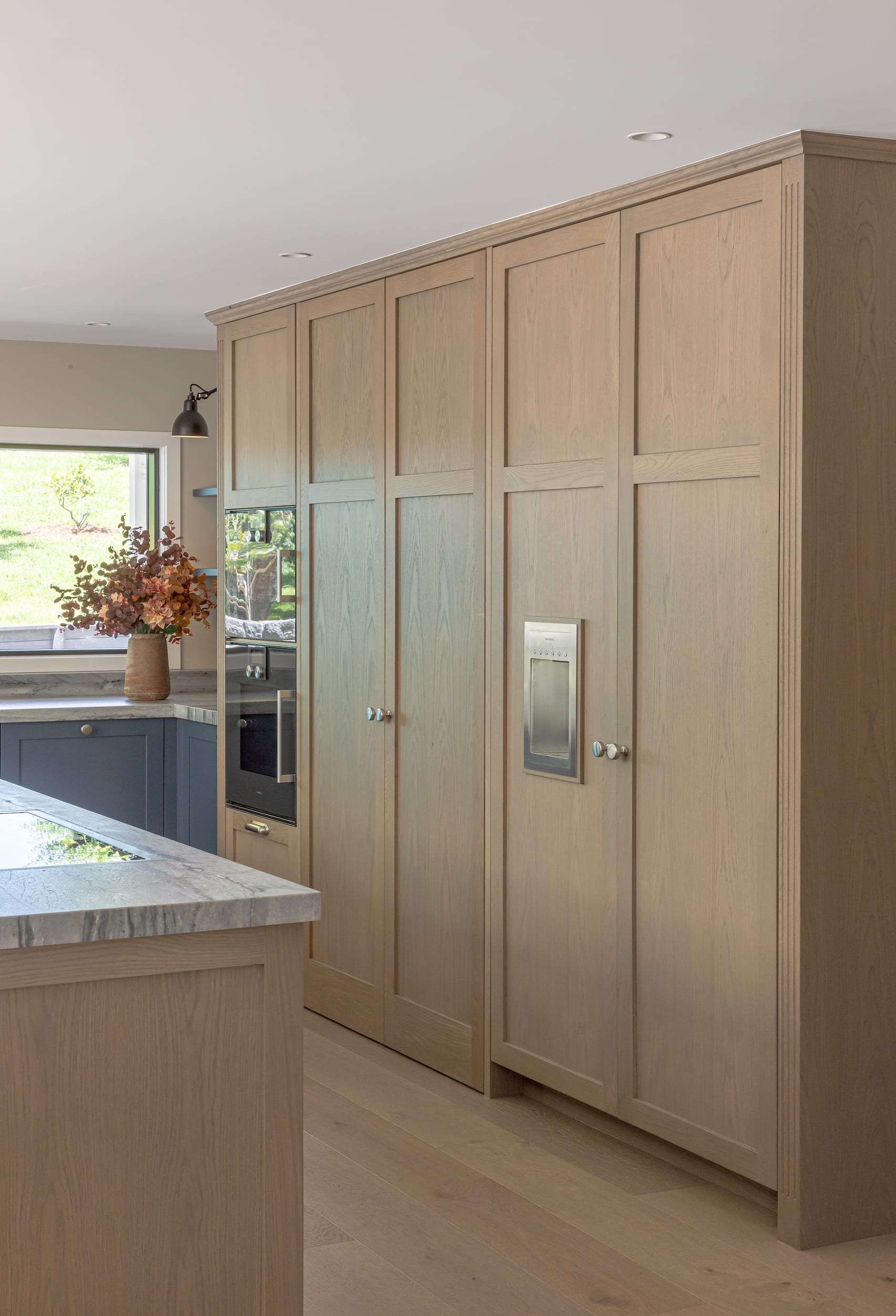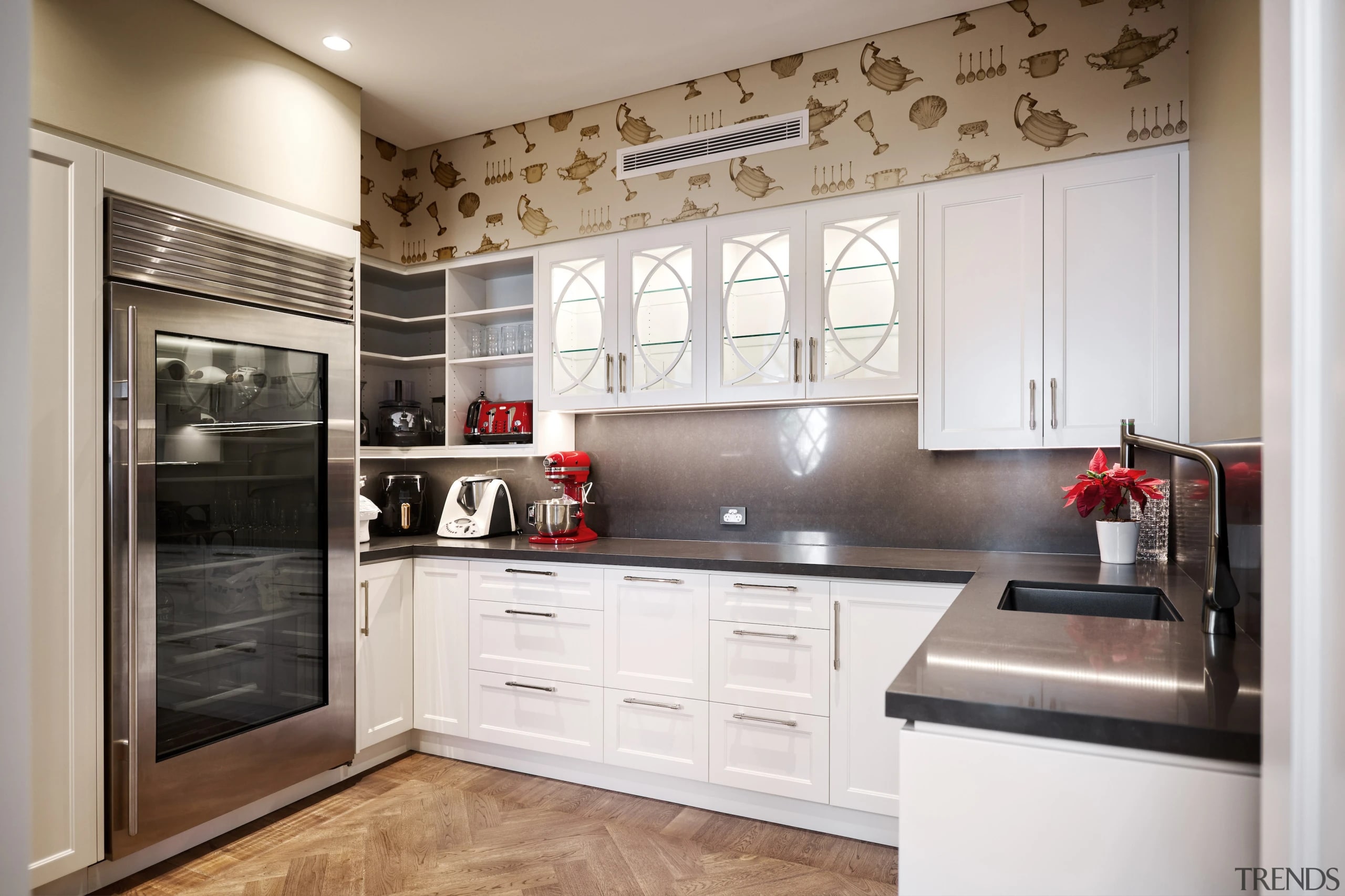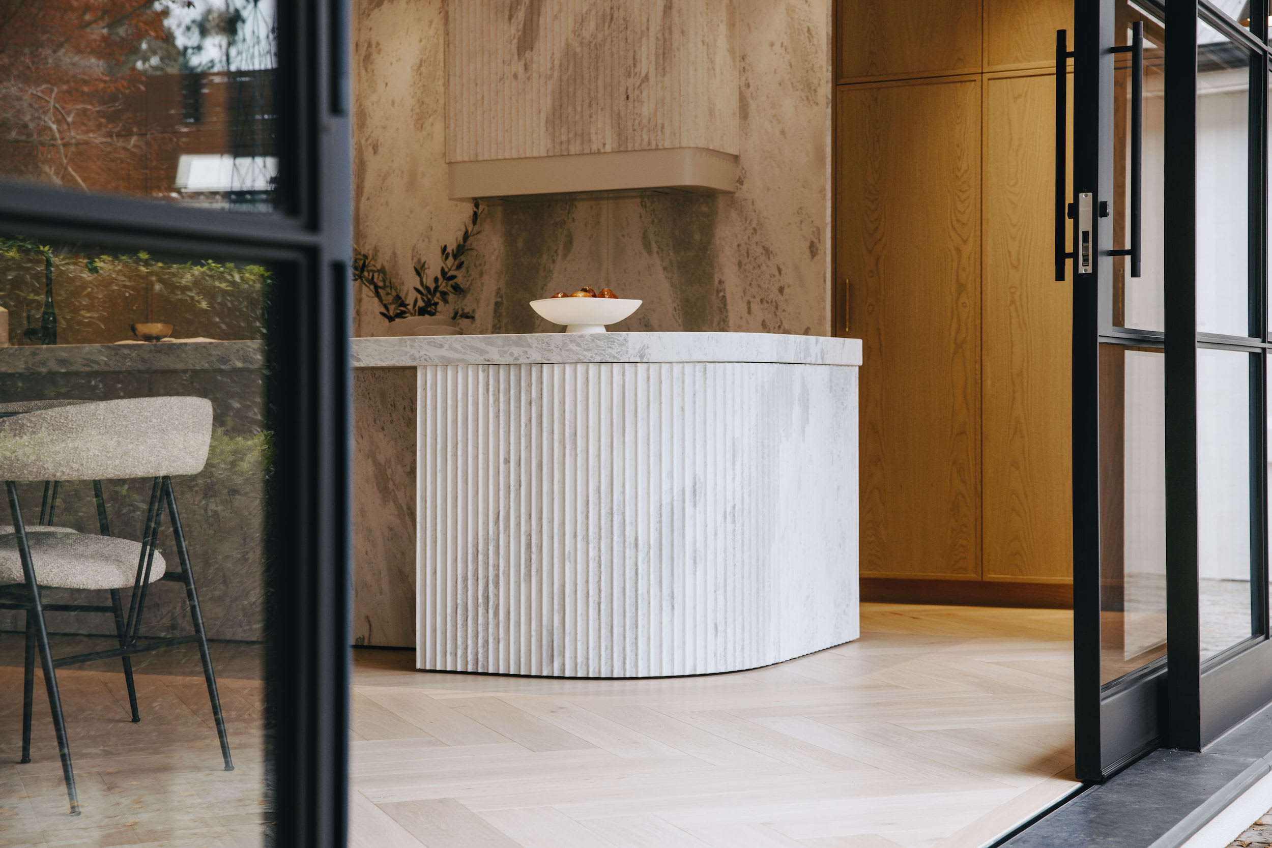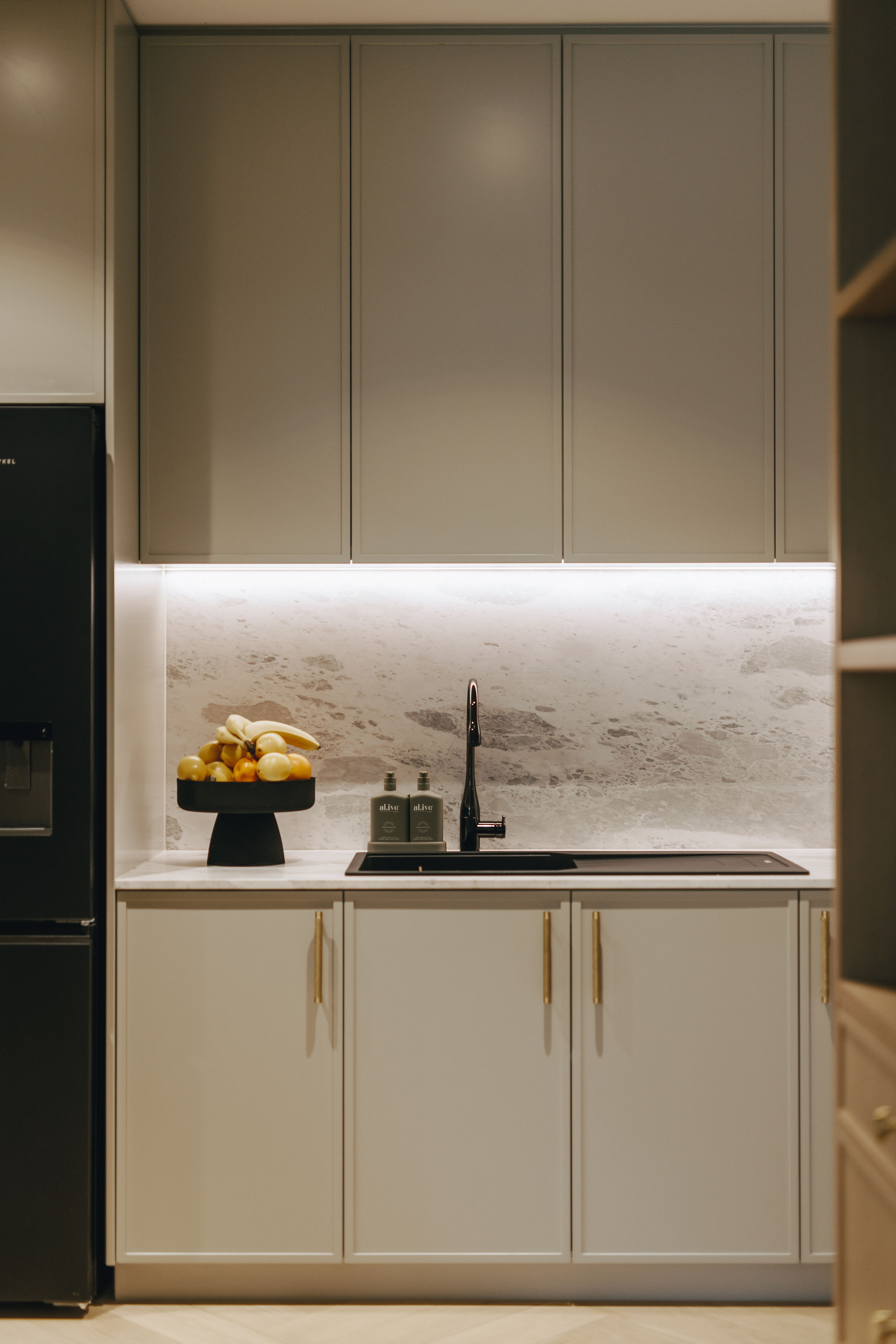 The working pantry zone houses hidden appliances including dual fridges, all integrated to reinforce the refined detailing. This changes in the entertainment and bar section of the cabinetry, for which the box frame doors and woven brass metal inlay deliberately reinforces a furniture-like aesthetic.