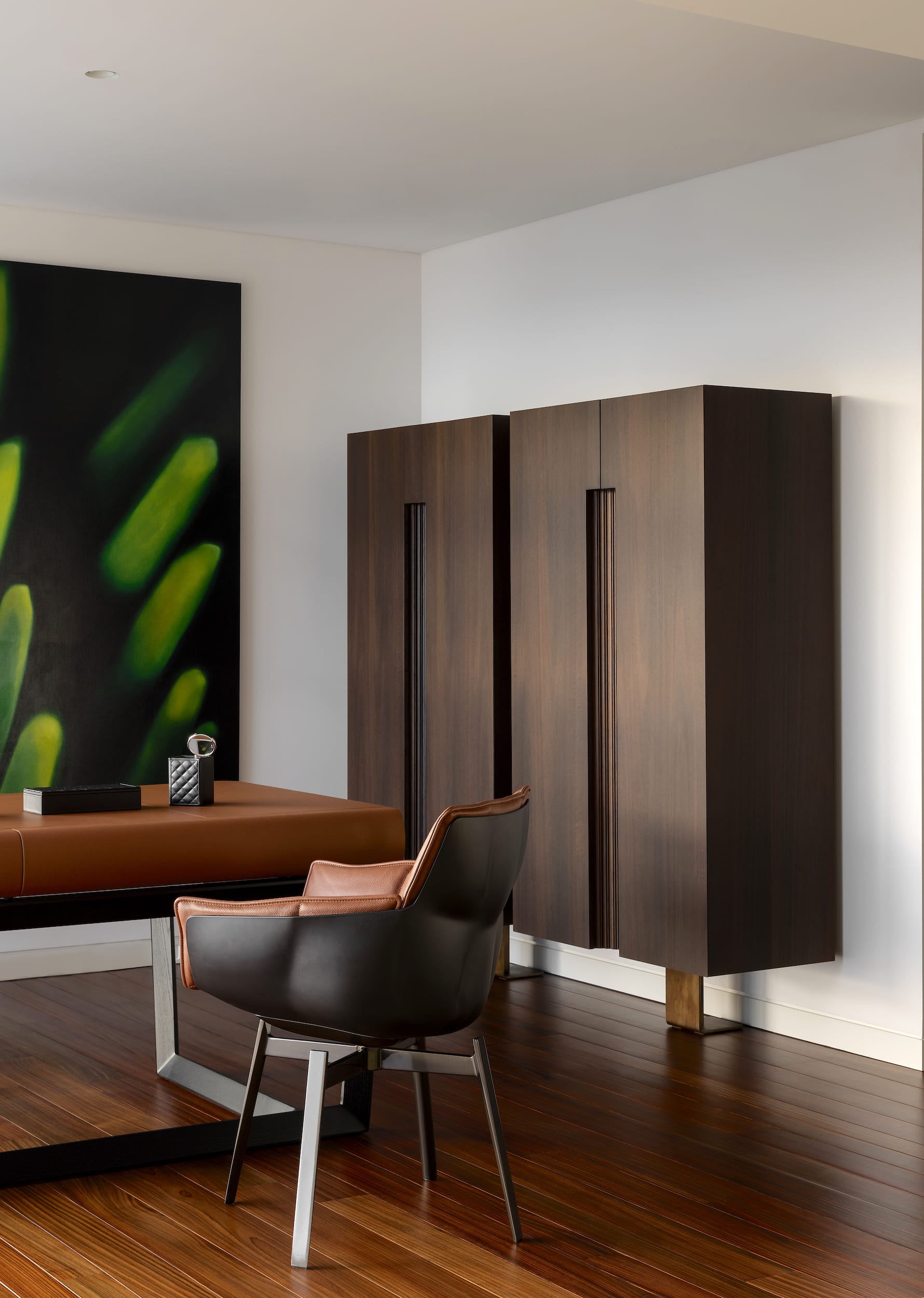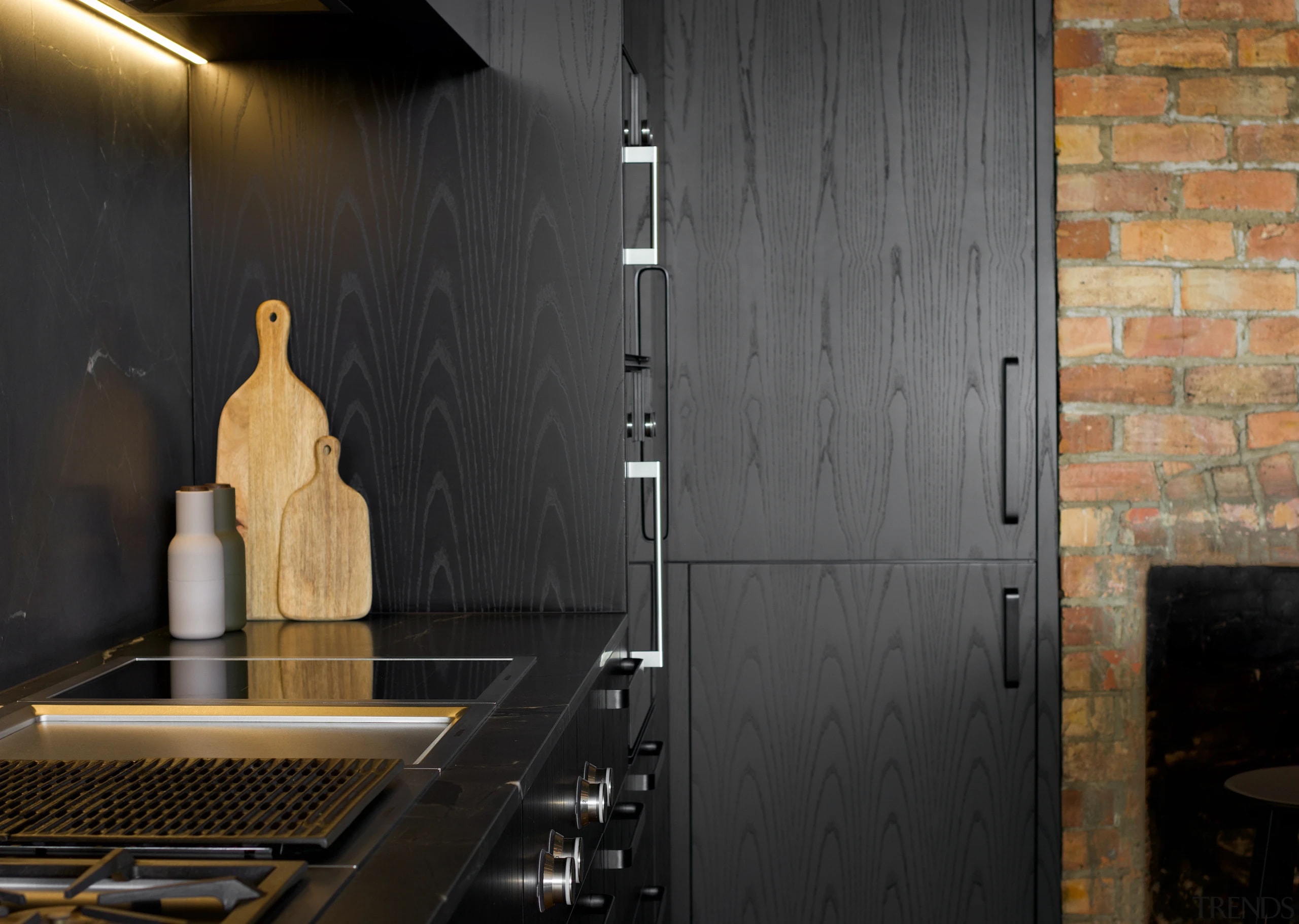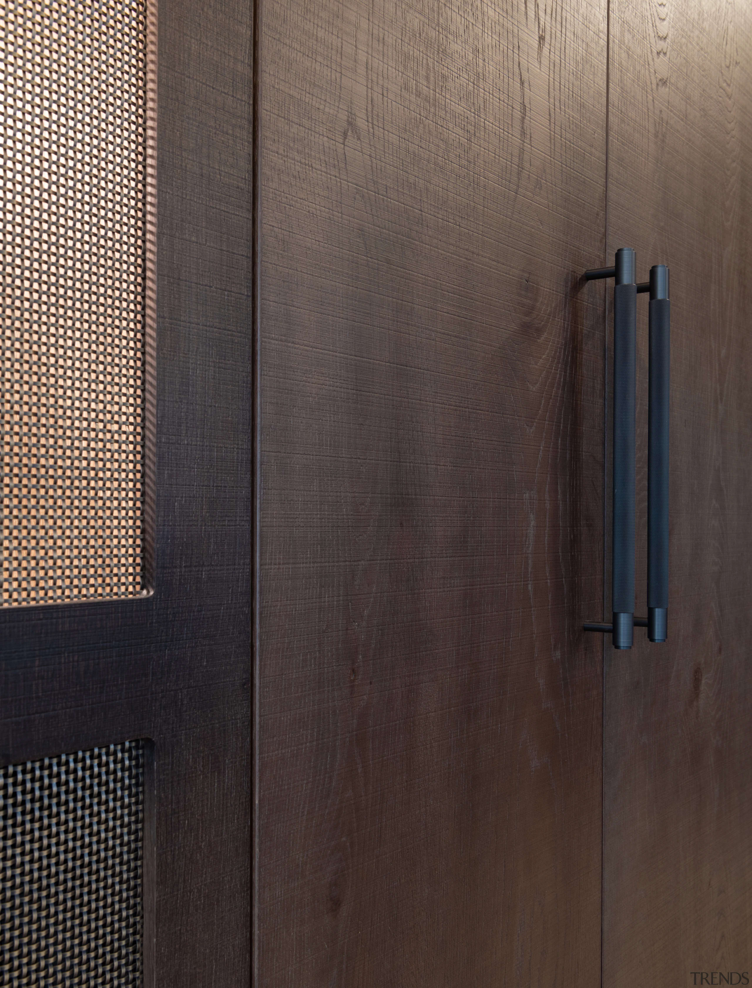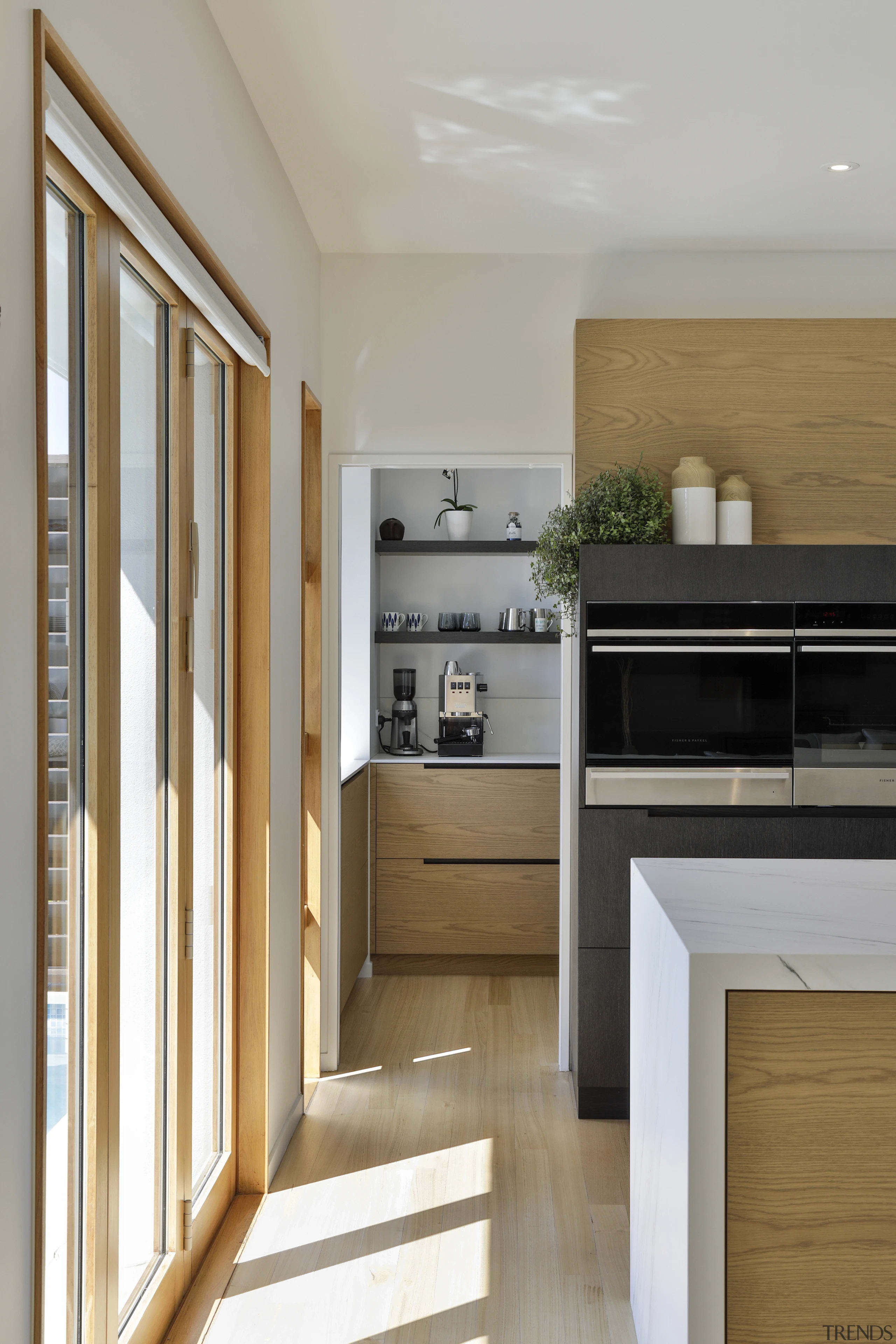 The working pantry zone houses hidden appliances including dual fridges, all integrated to reinforce the refined detailing. This changes in the entertainment and bar section of the cabinetry, for which the box frame doors and woven brass metal inlay deliberately reinforces a furniture-like aesthetic.
