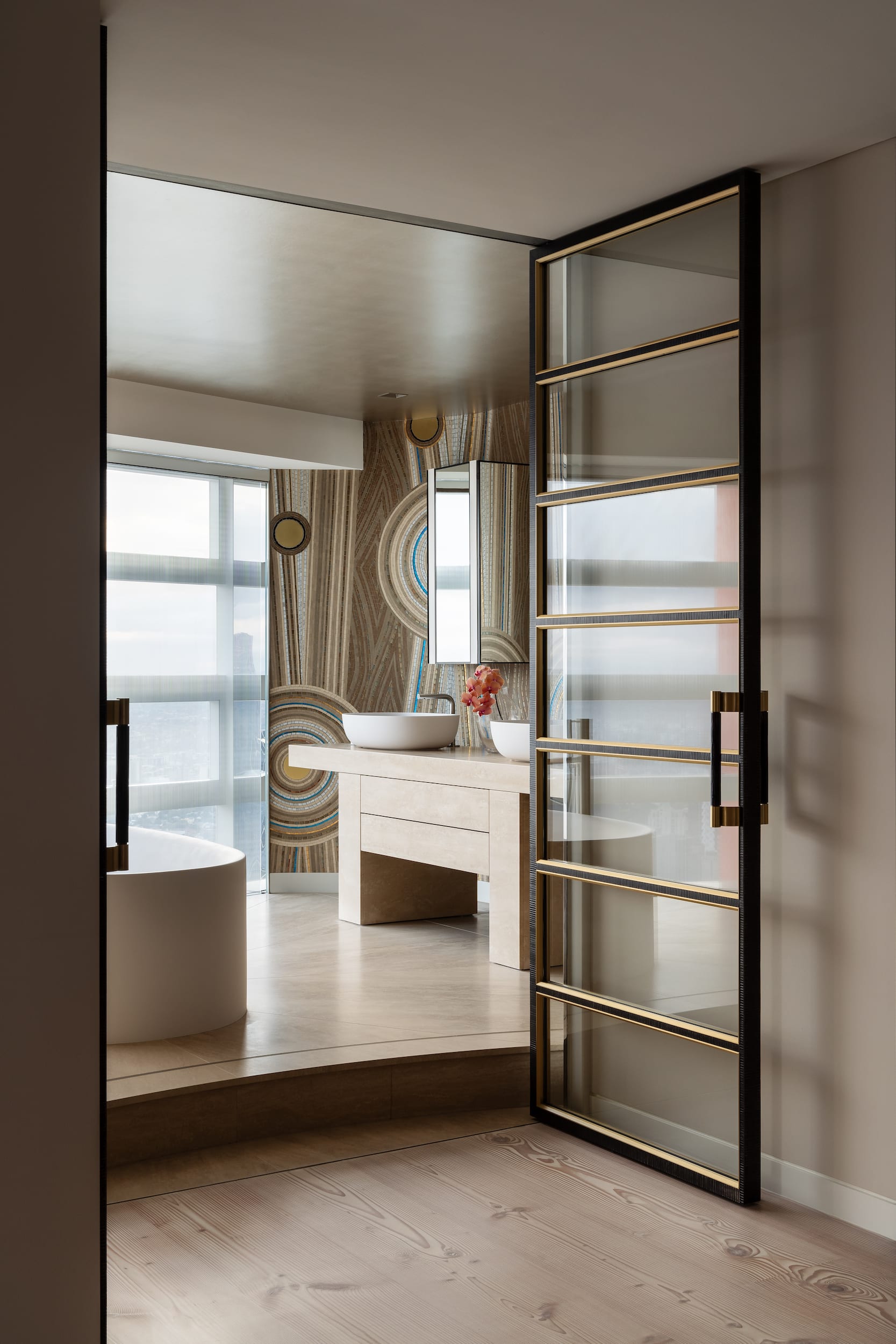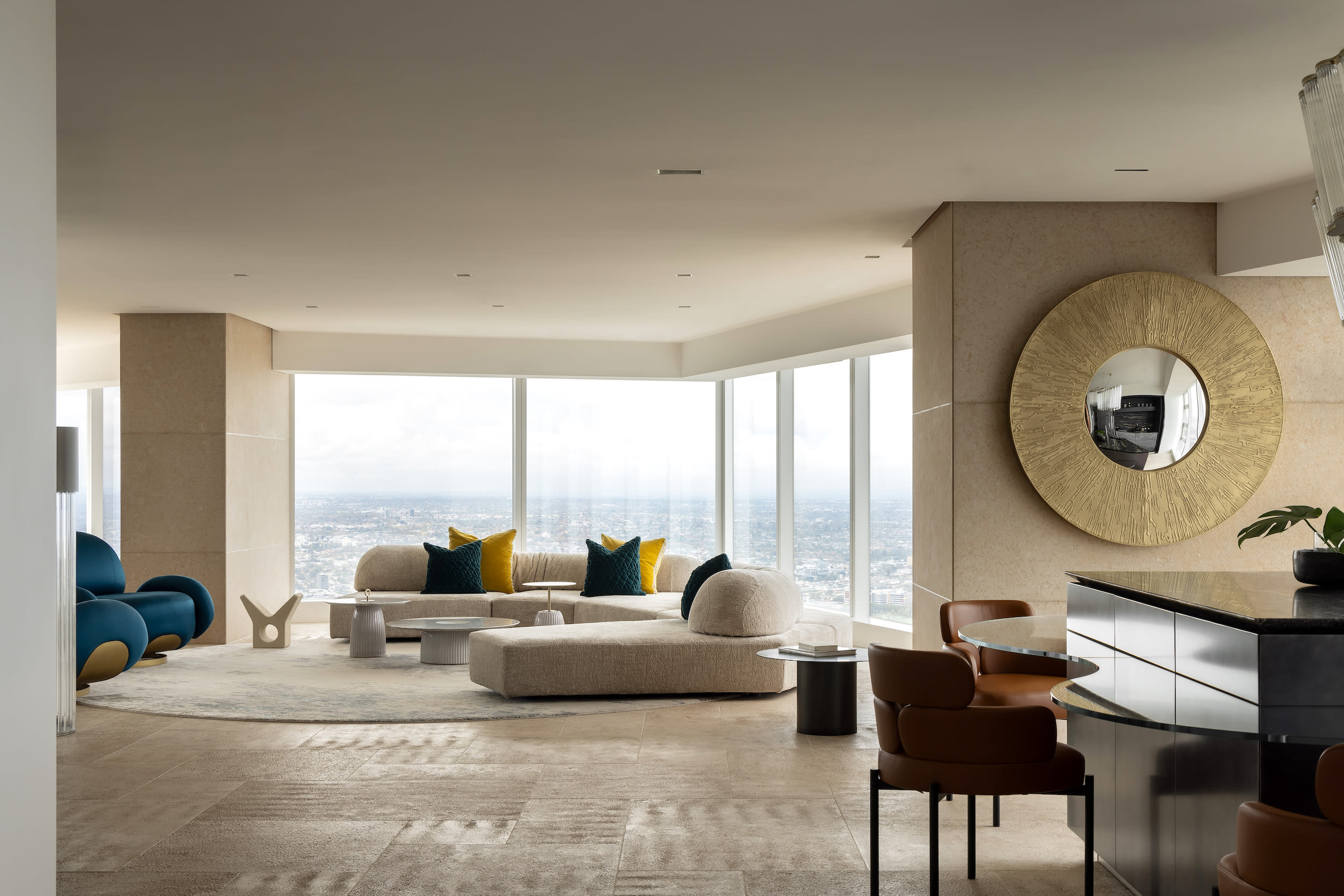 Throughout the penthouse, a refined palette of textures and finishes are employed.