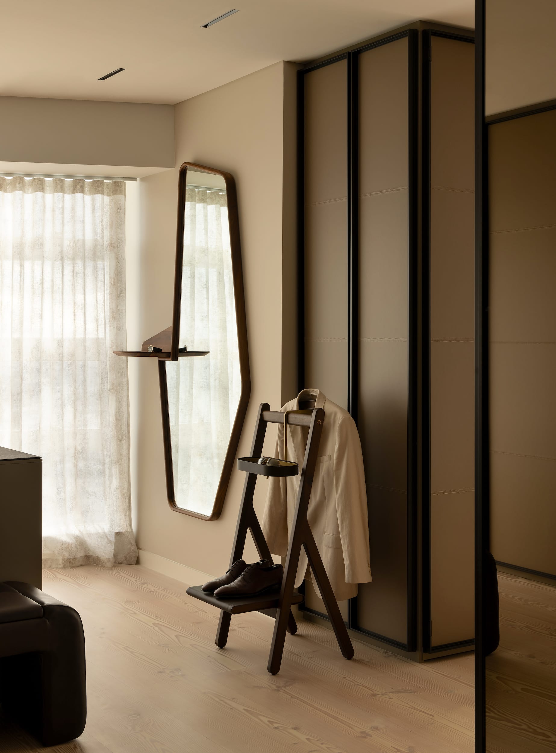 Our apartment owners, a pair of adventurous empty nesters with a globe-trotting bucket list, presented us with an irresistible challenge: “Take this dramatically angular shell and fill it with warmth, colour, and texture to be the ultimate lock-and-leave home.”