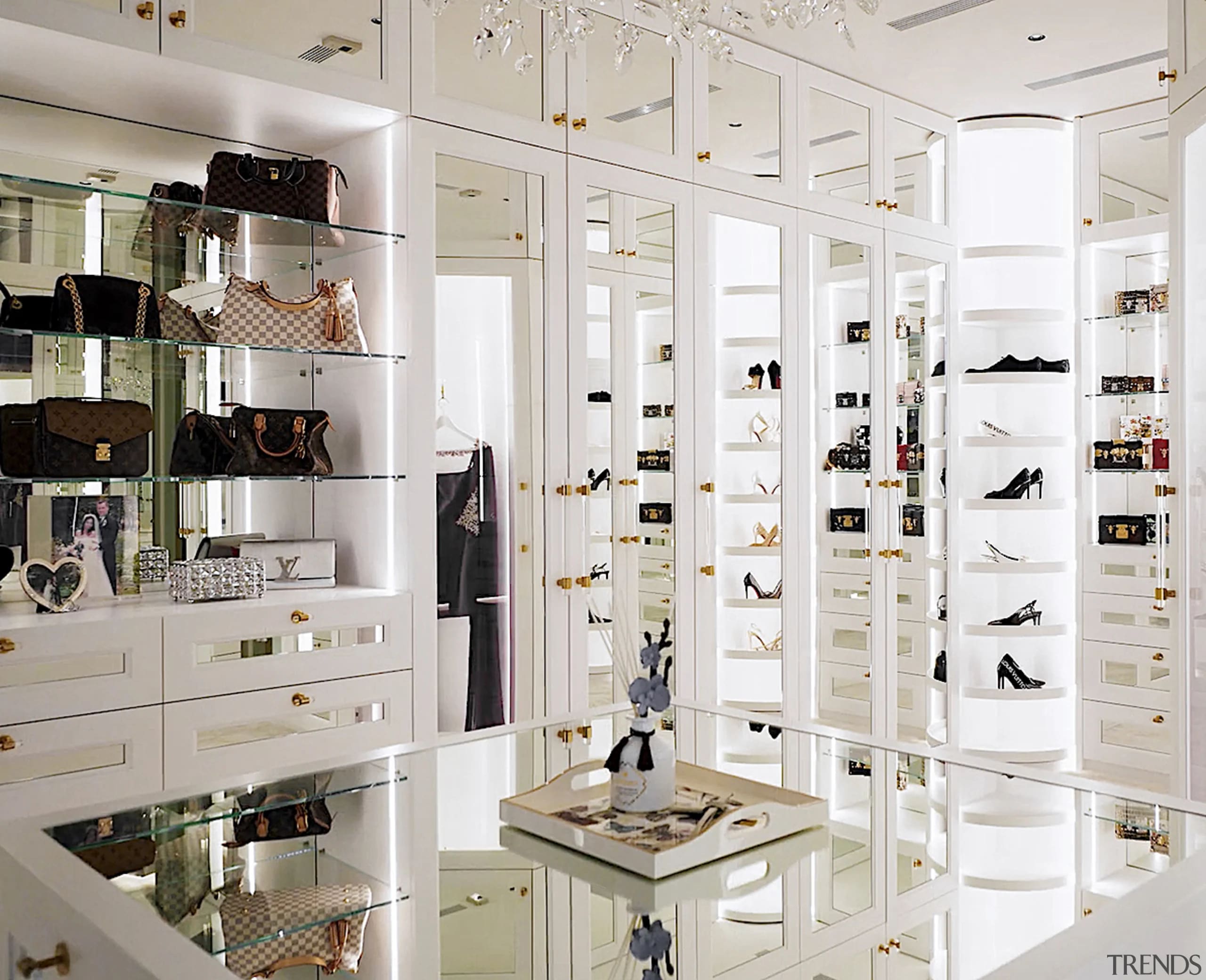 Off the bedroom lies a truly stunning and decadent walk-in wardrobe, finished with mirror, brass and a rare Alpaca fur carpet.