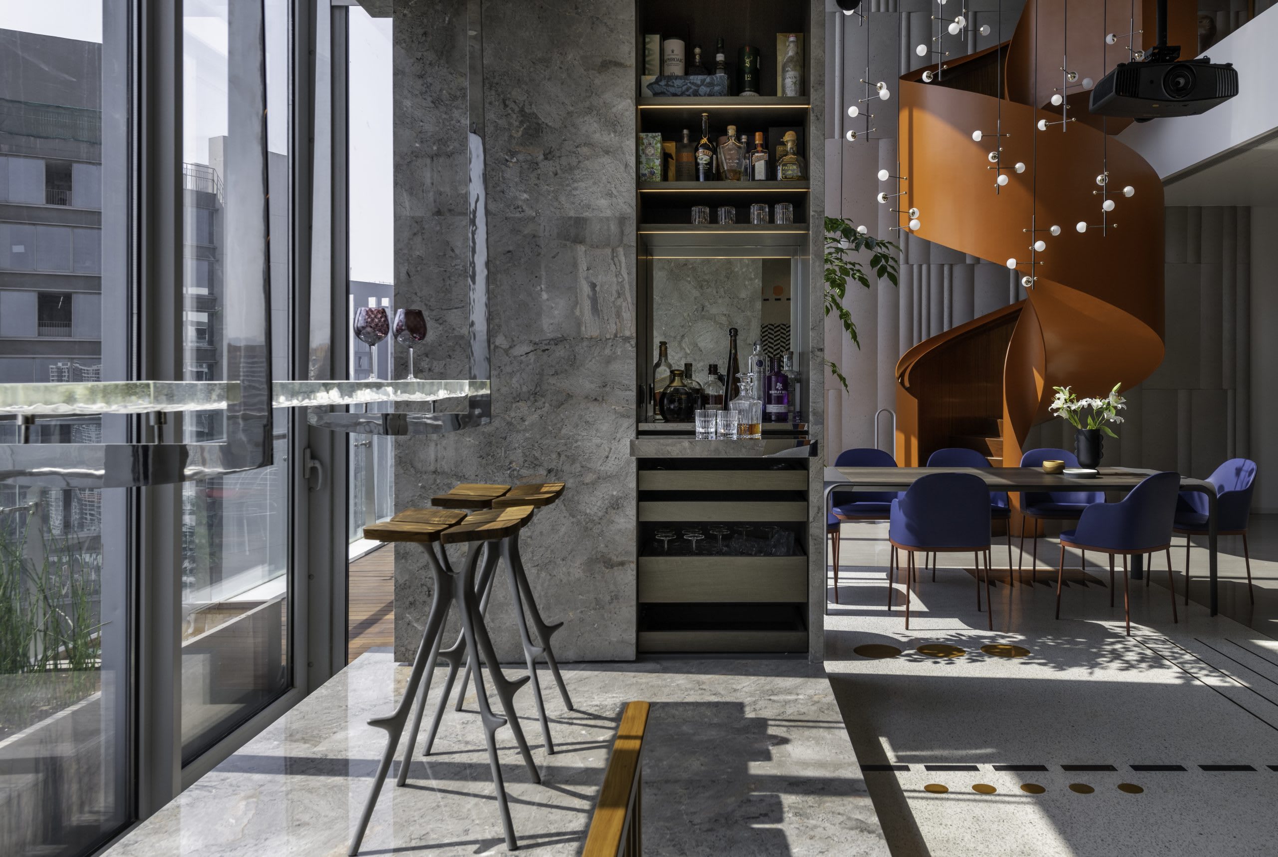 When we were appointed to design a penthouse on the 50th and 51st floor, with a terrace and pool on the 52nd floor, there was a need to feel a sense of freedom in an otherwise restrictive situation due to COVID-19.