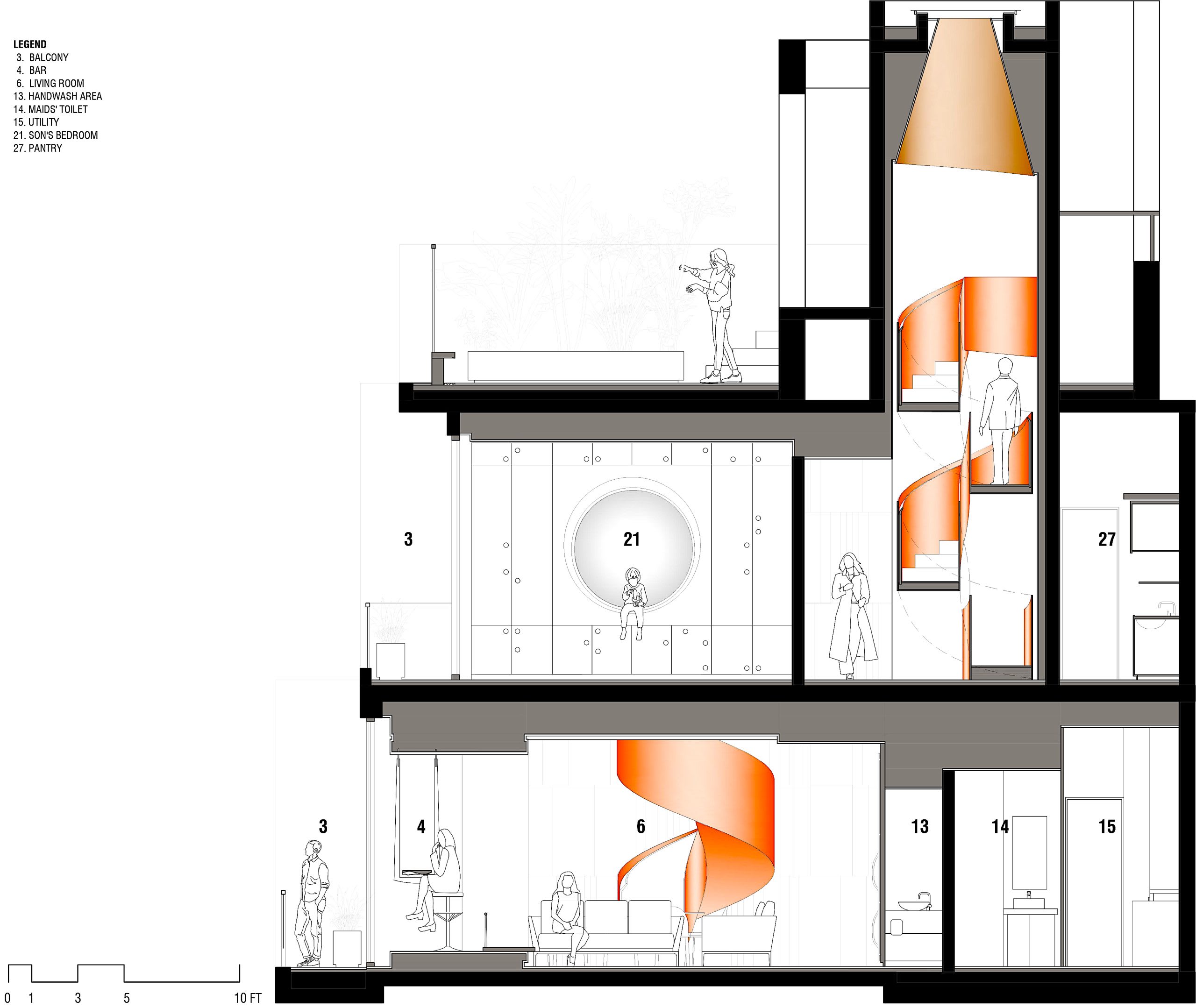 Upon reaching the upper level, there is a multipurpose room with a sleeping cubicle for guests and a concealed puja (Hindu ritual of devotional worship) space with a work desk.