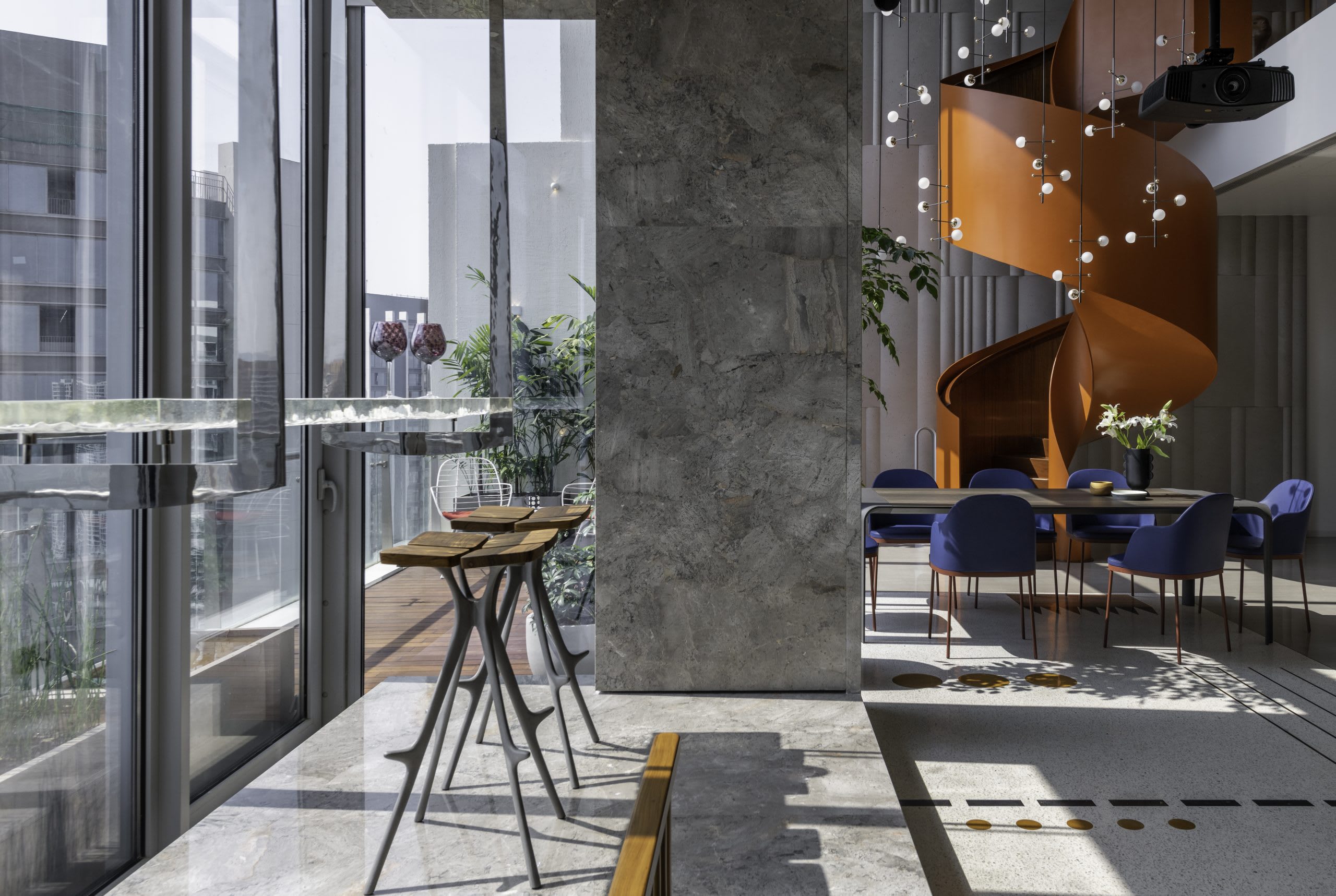 This portal defines a raised seating area with a concealed drinks cabinet (behind a sliding marble shutter) and a suspended cast glass bar counter that overlooks the sprawling greens of Aarey below.