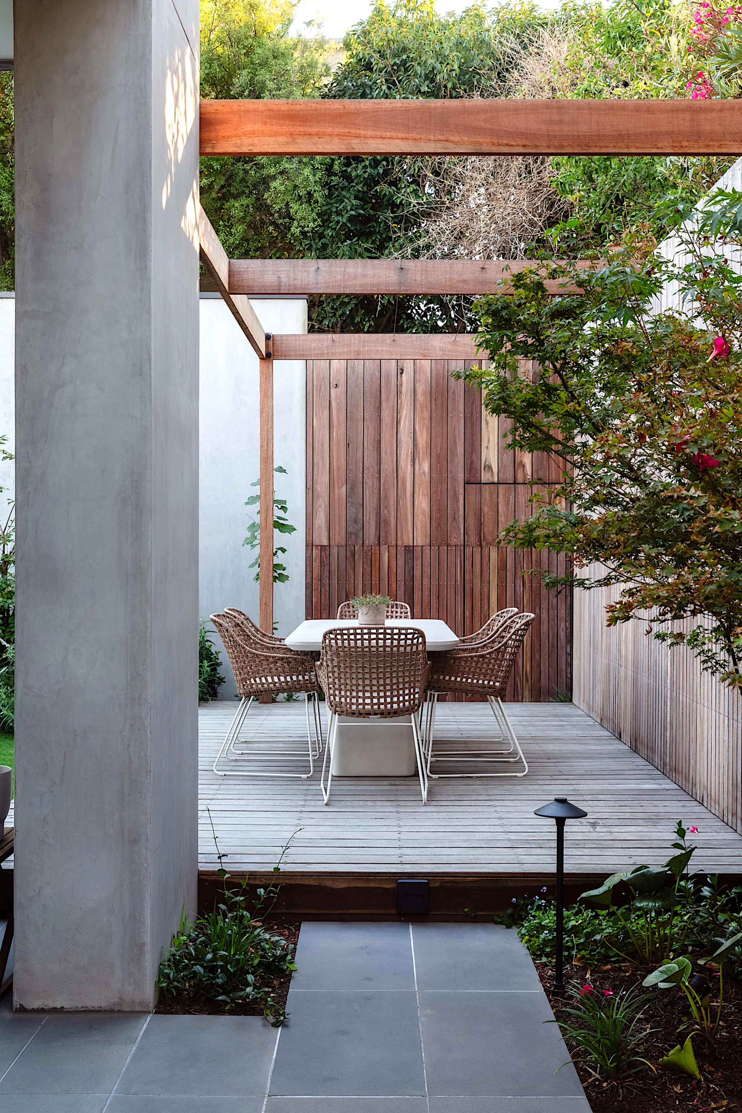 This was achieved with the continuation of architectural details, creating a new outdoor dining entertaining terrace, clad in timber, that echoed the composition of the poolside zone opposite.